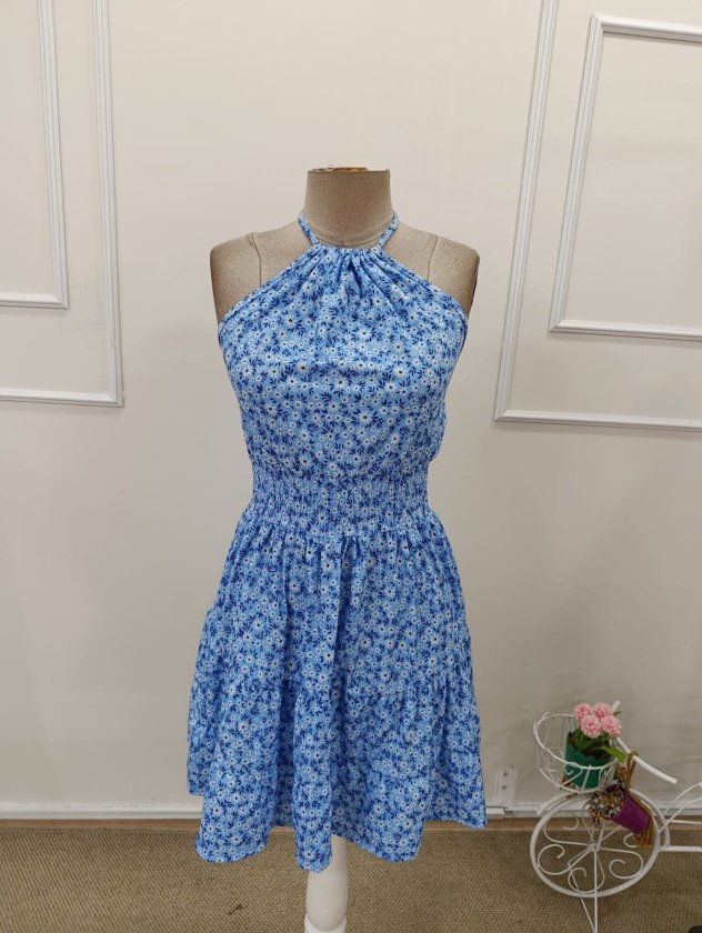 Kadın Omuzlardan Açık Beli Lastikli Desenli Kısa Süprem Elbise