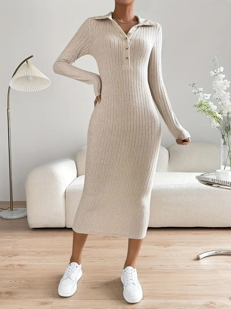 Kadın Uzun Kollu Yakalı Düğmeli şardonlu Kaşkorse Elbise