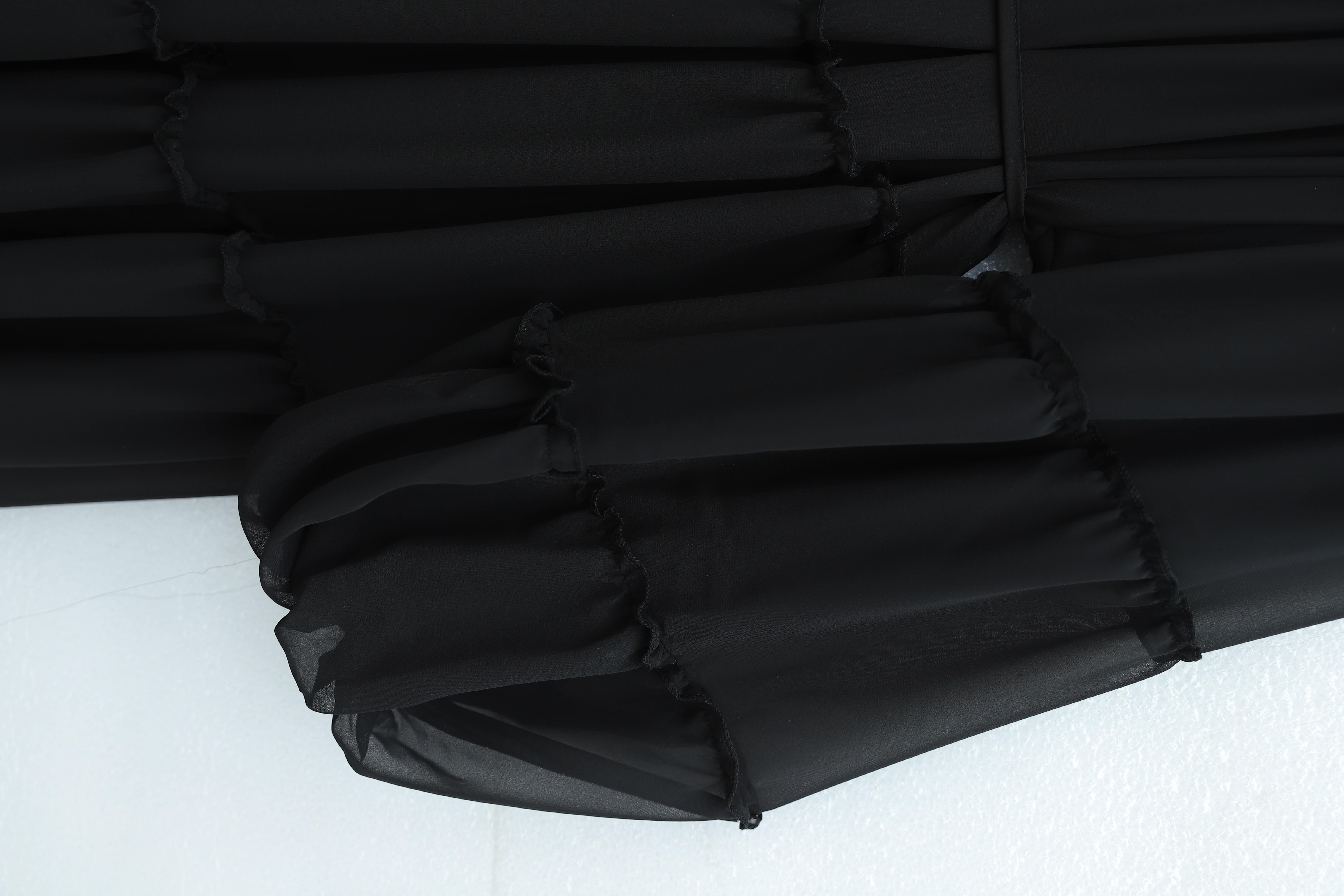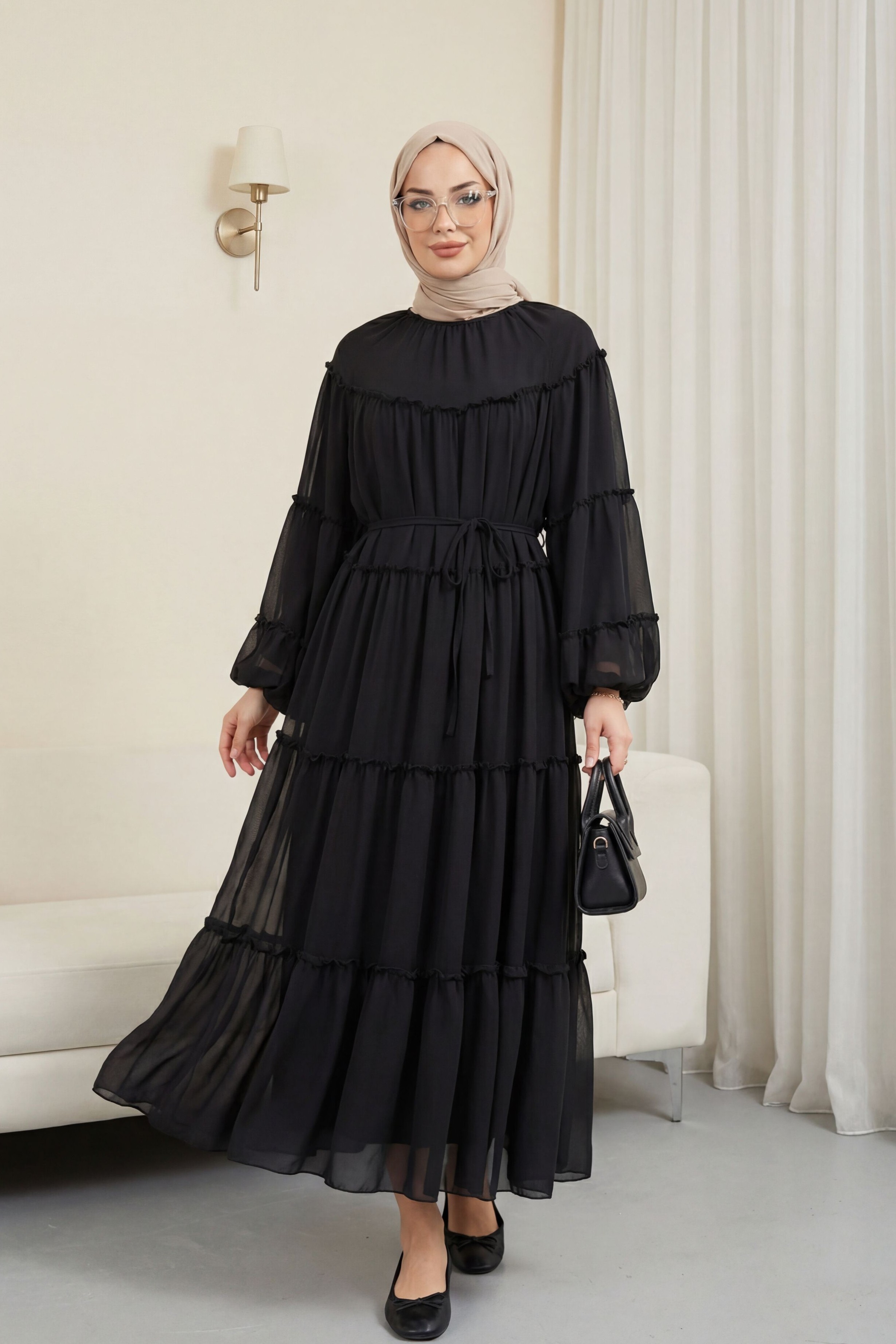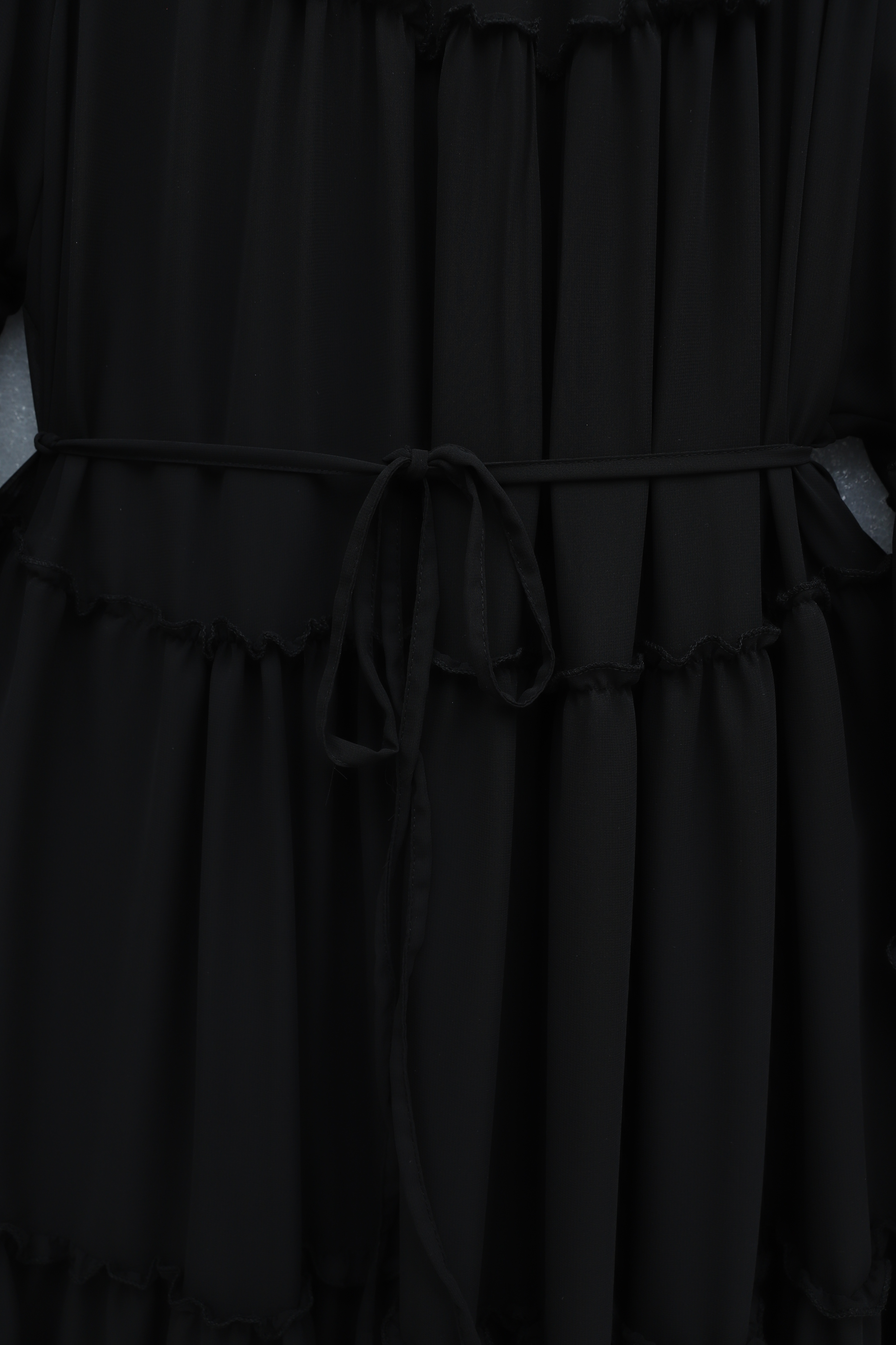 Podyumplus Kolu Lastikli Beli Bağlamalı Katlı Fırfır Detaylı Elbise -Siyah