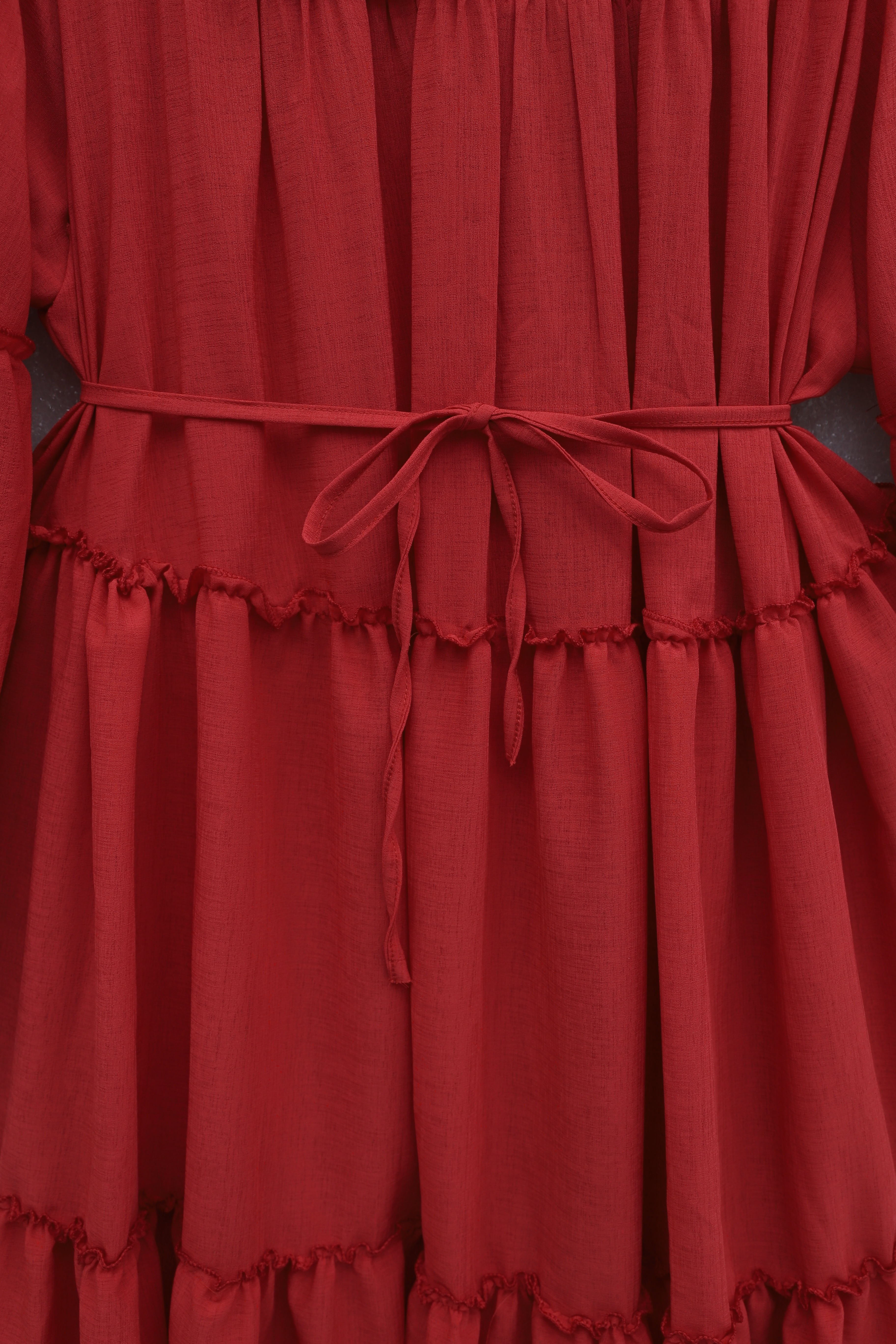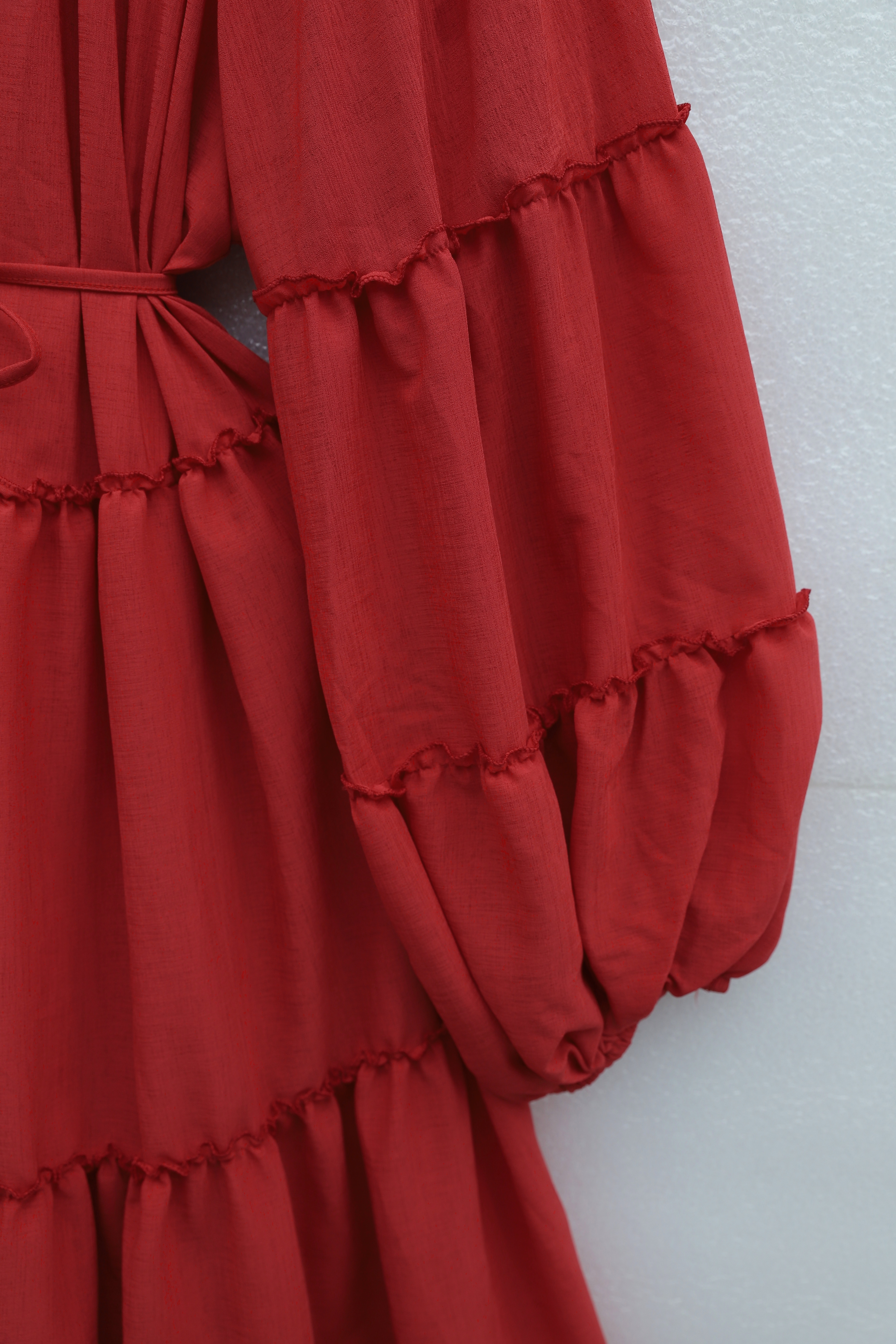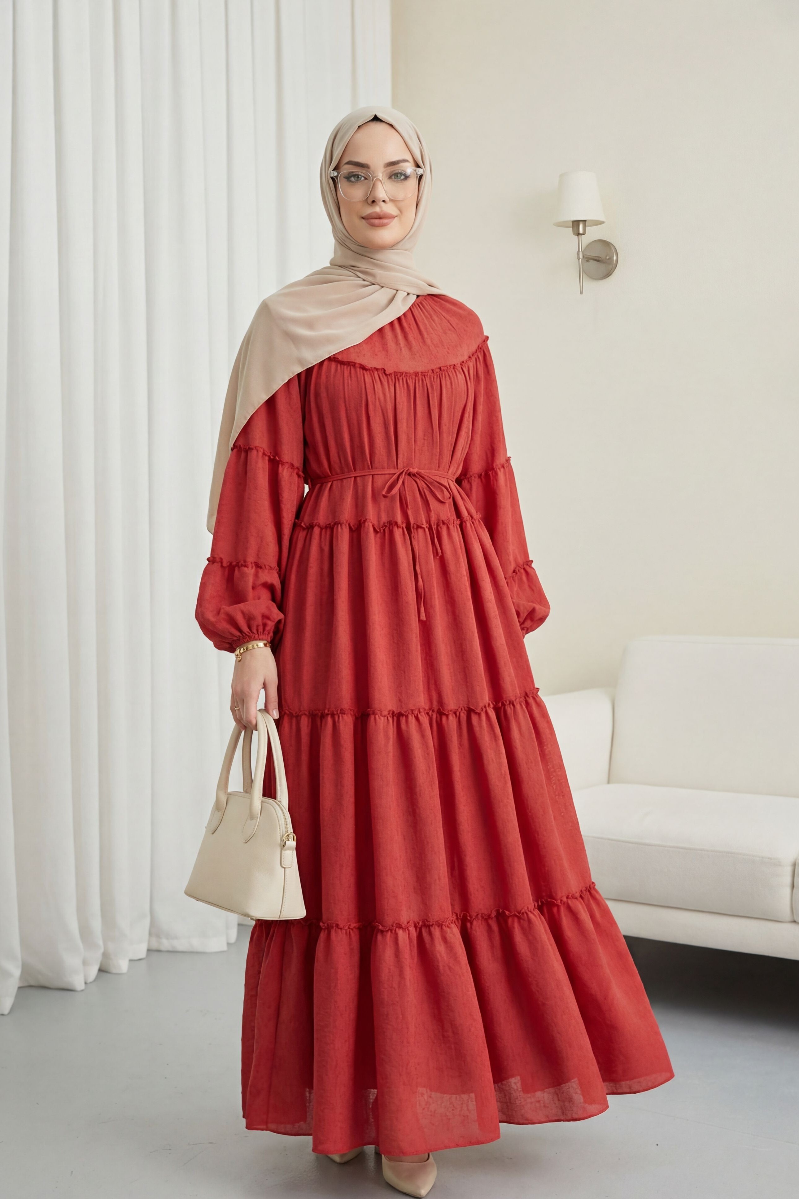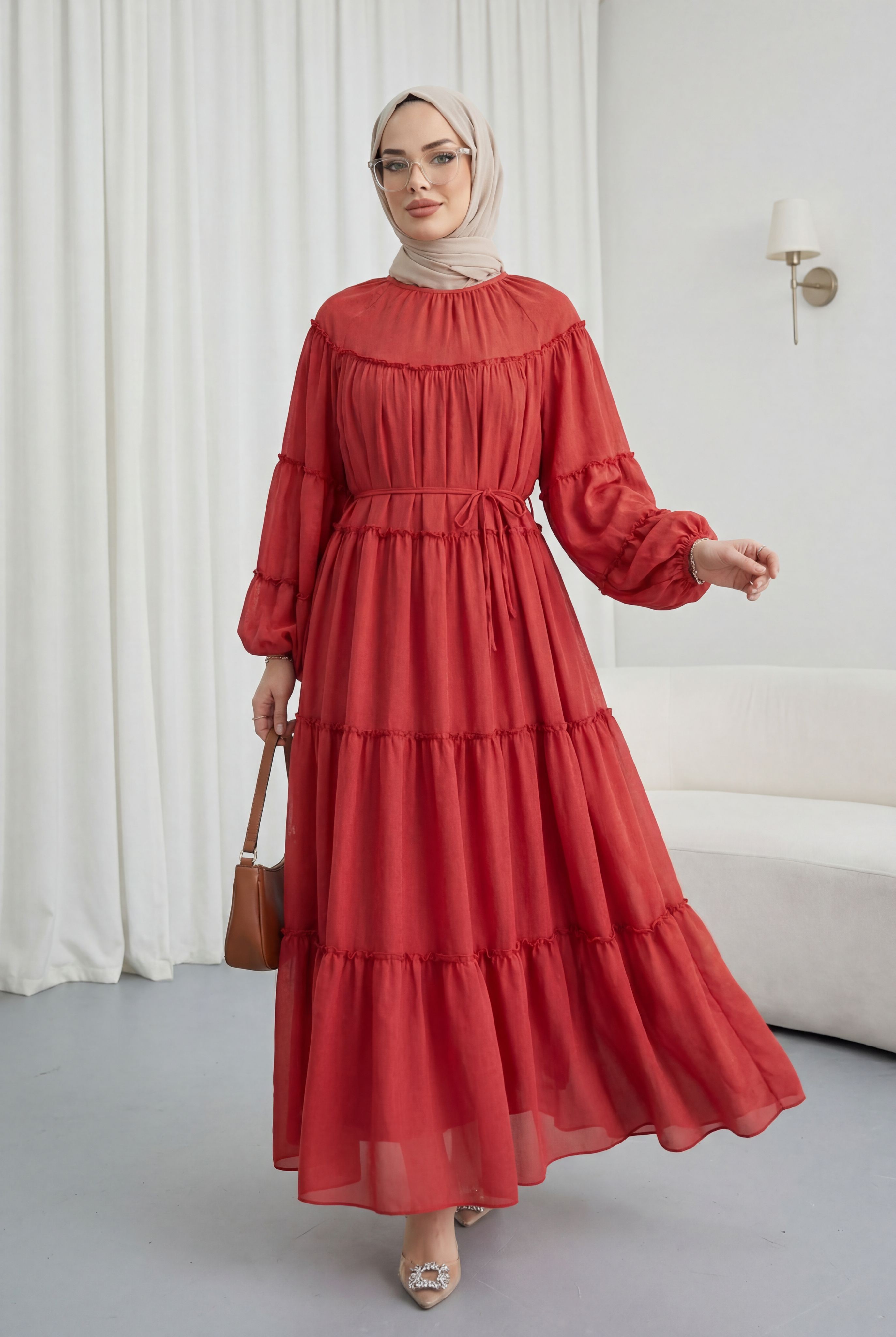 “Beli bağlamalı elbise”, “katlı fırfırlı elbise”, “kolu lastikli kadın elbise”, “günlük şık elbise” gibi adlandırılabilir.