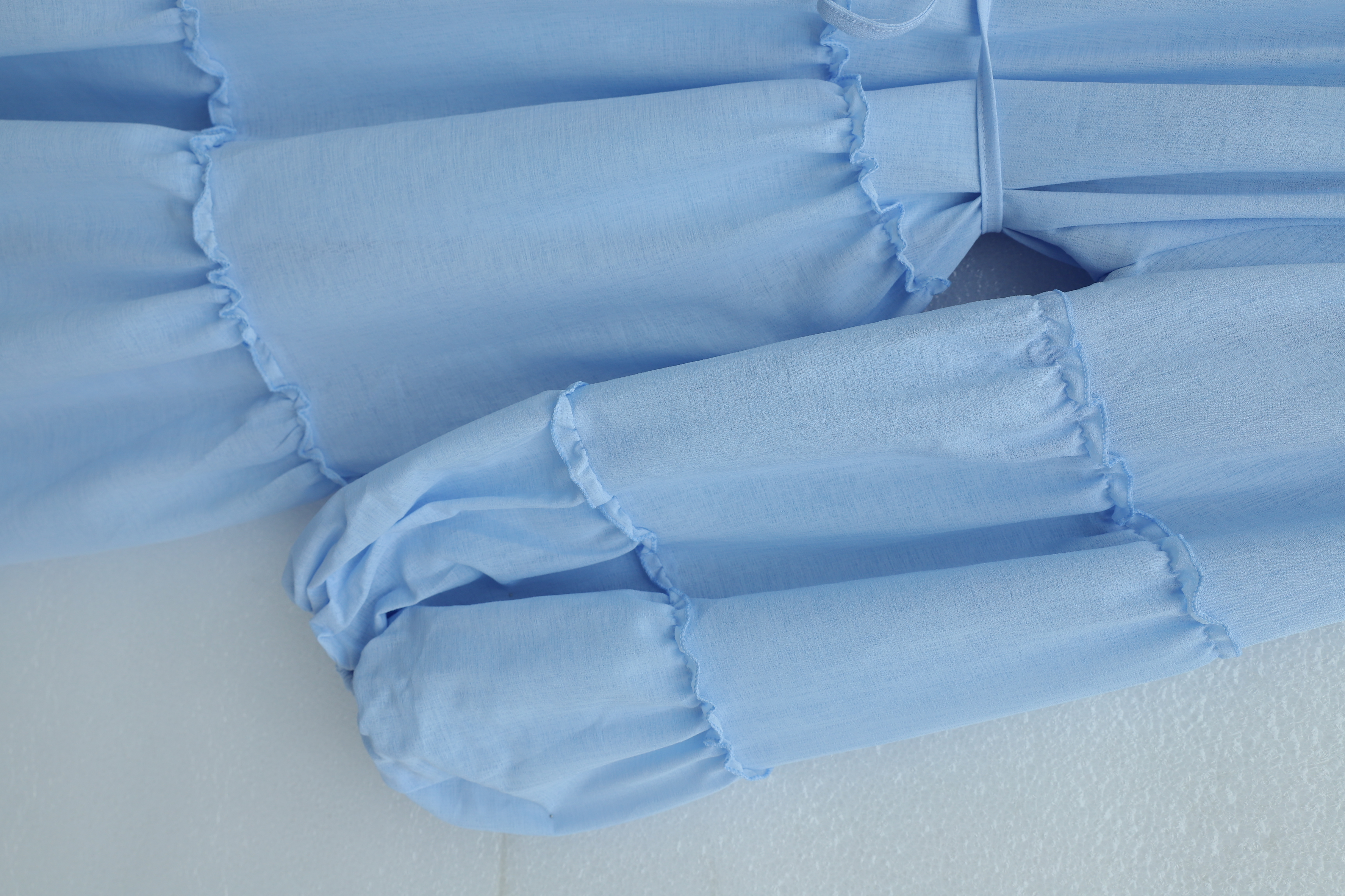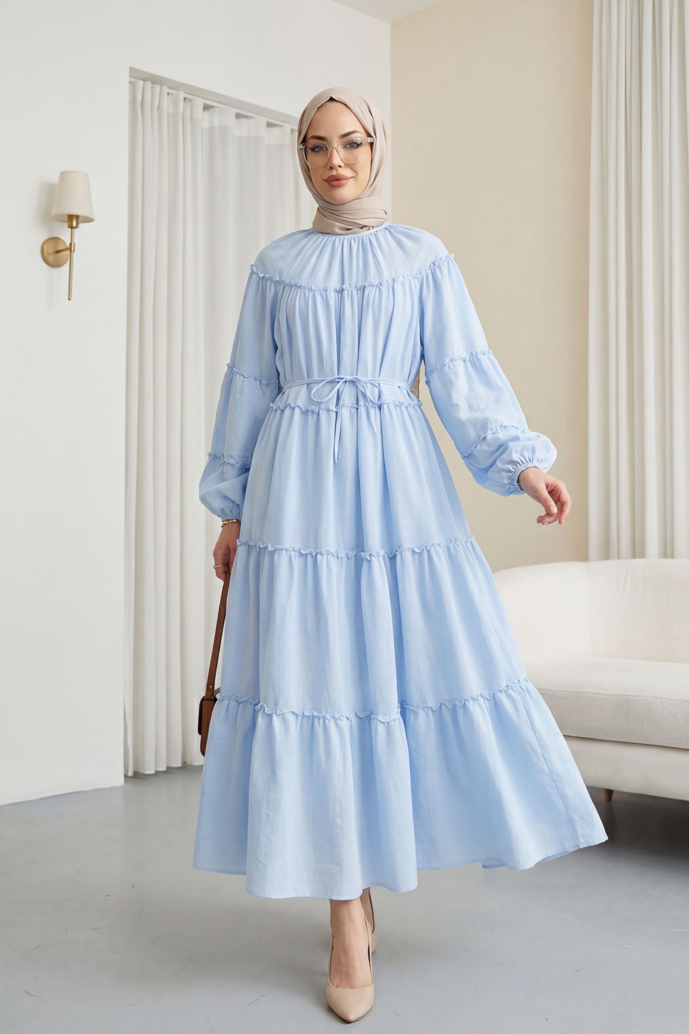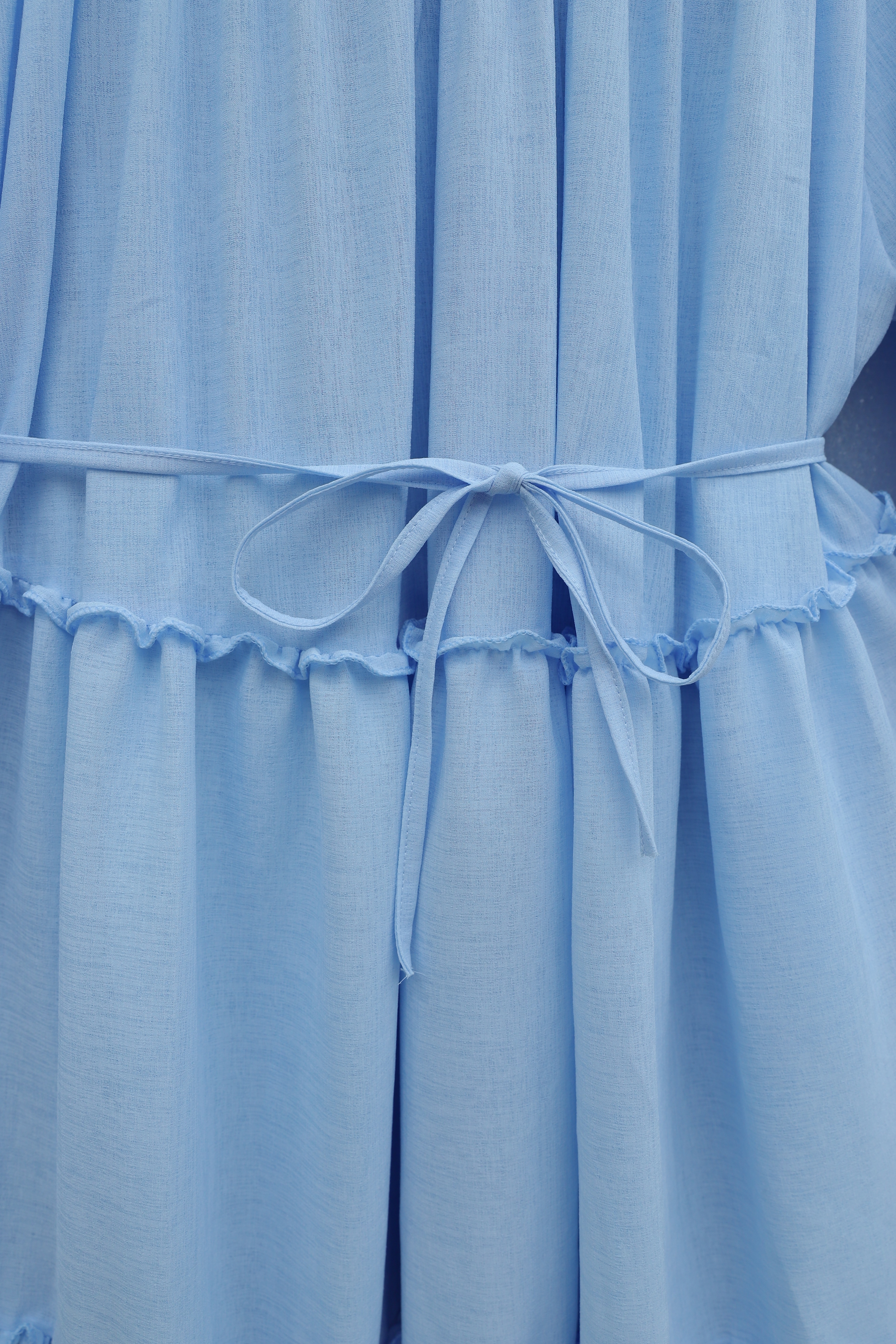 Podyumplus Kolu Lastikli Beli Bağlamalı Katlı Fırfır Detaylı Elbise -Bebe Mavi