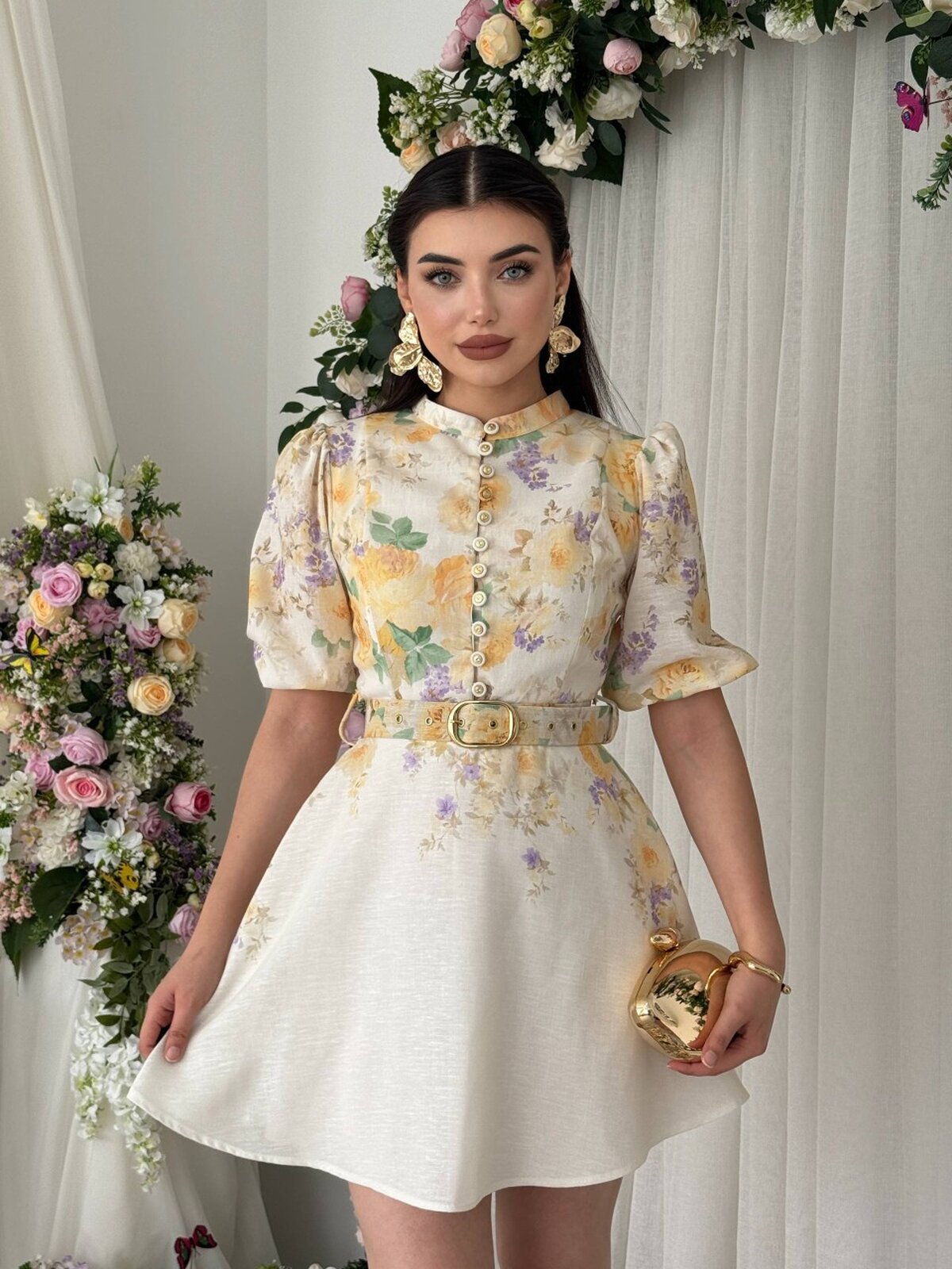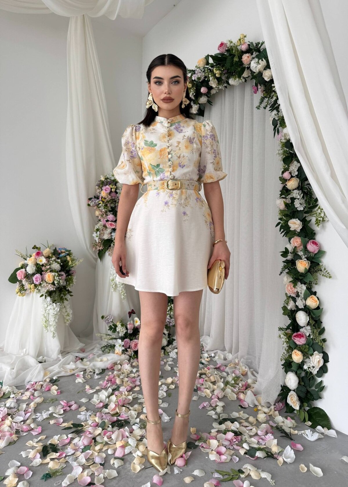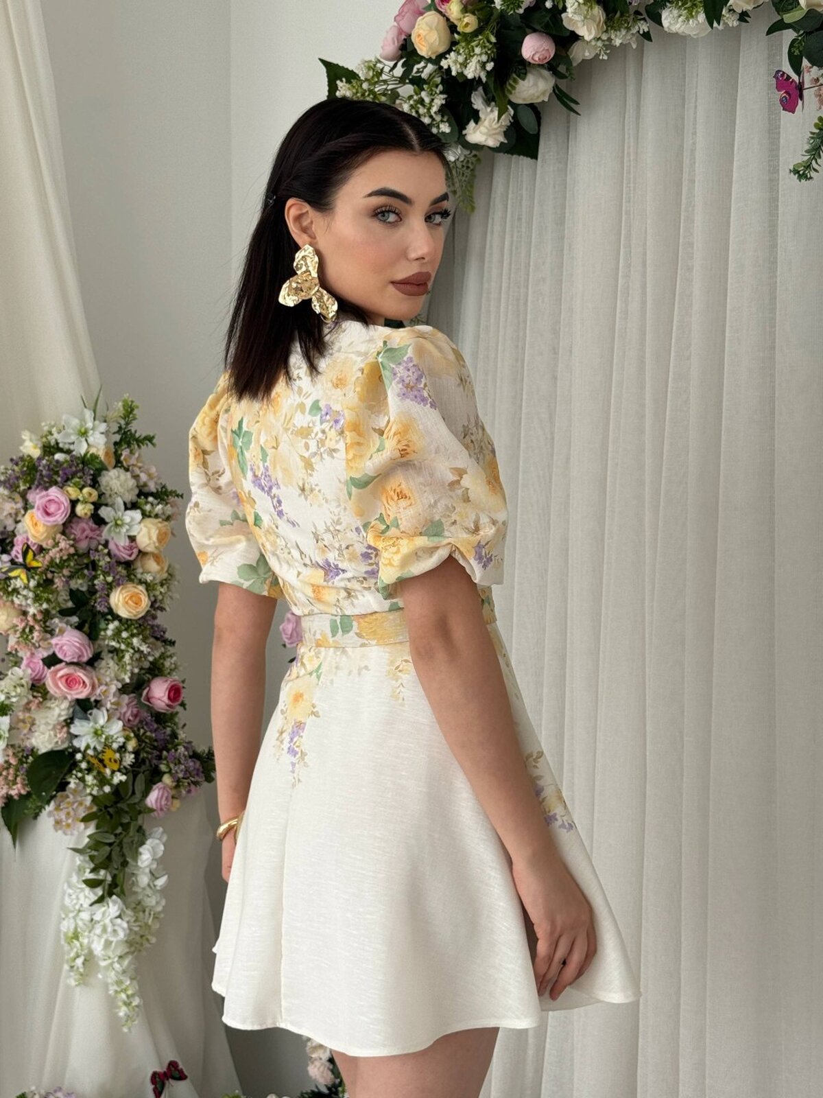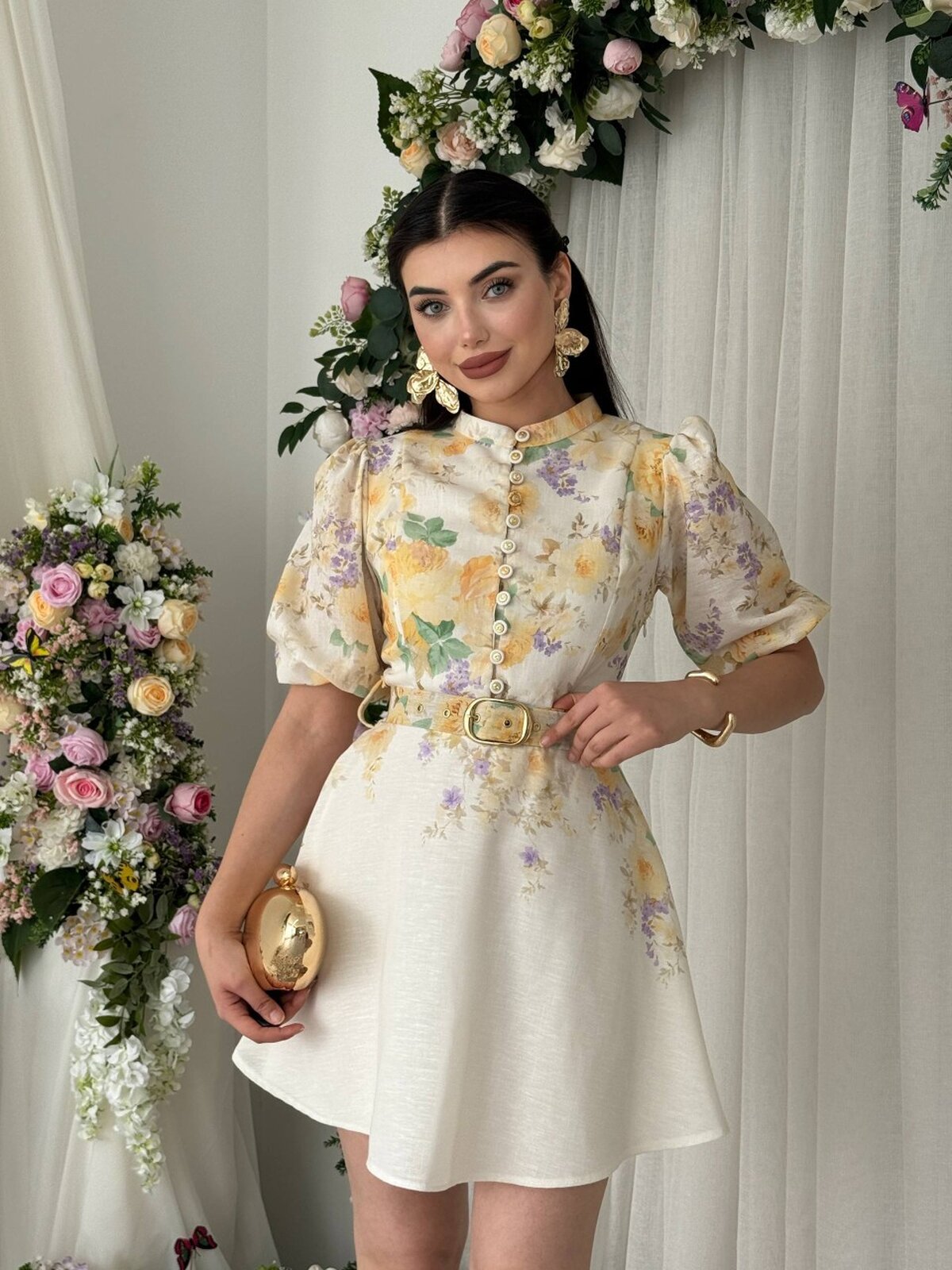 Etika Pana Kemer Detaylı Elbise ETK-00649-cicek-d-sari