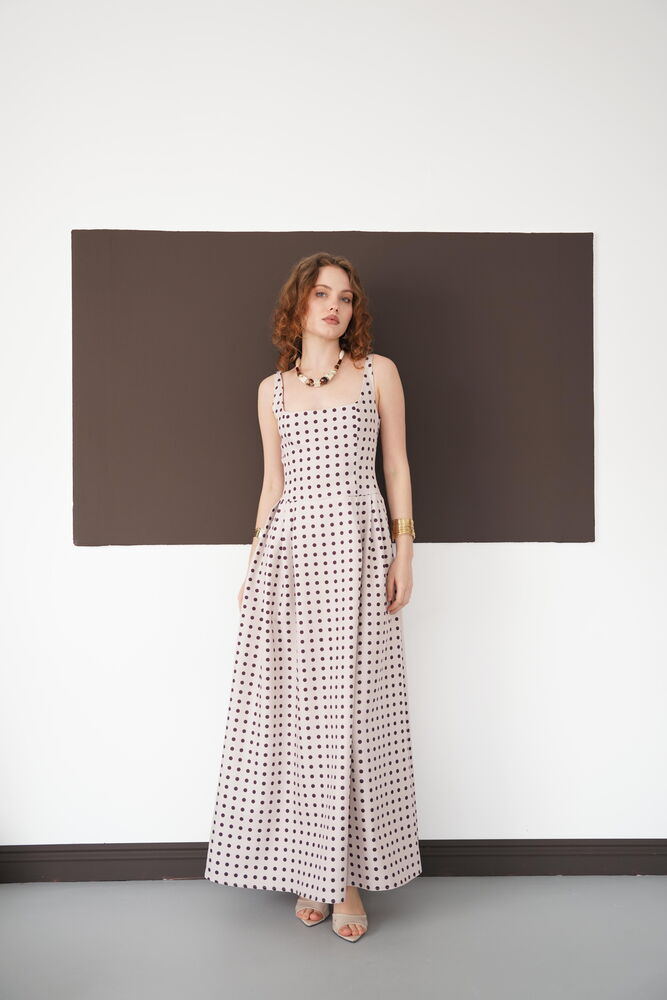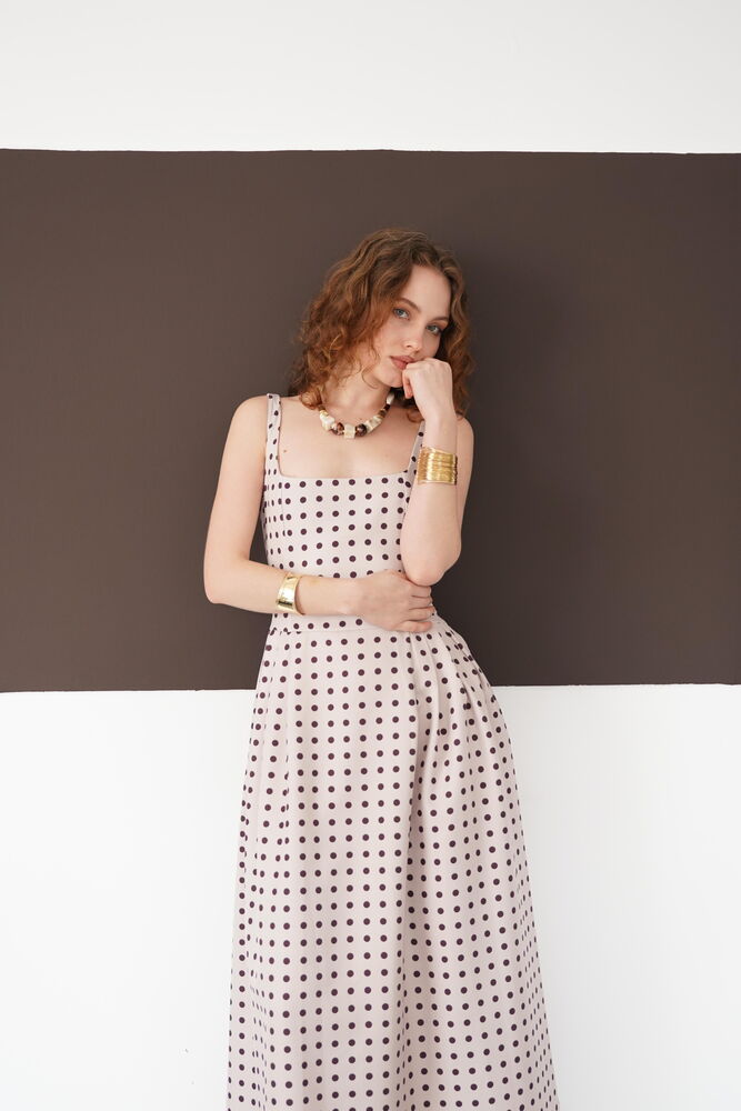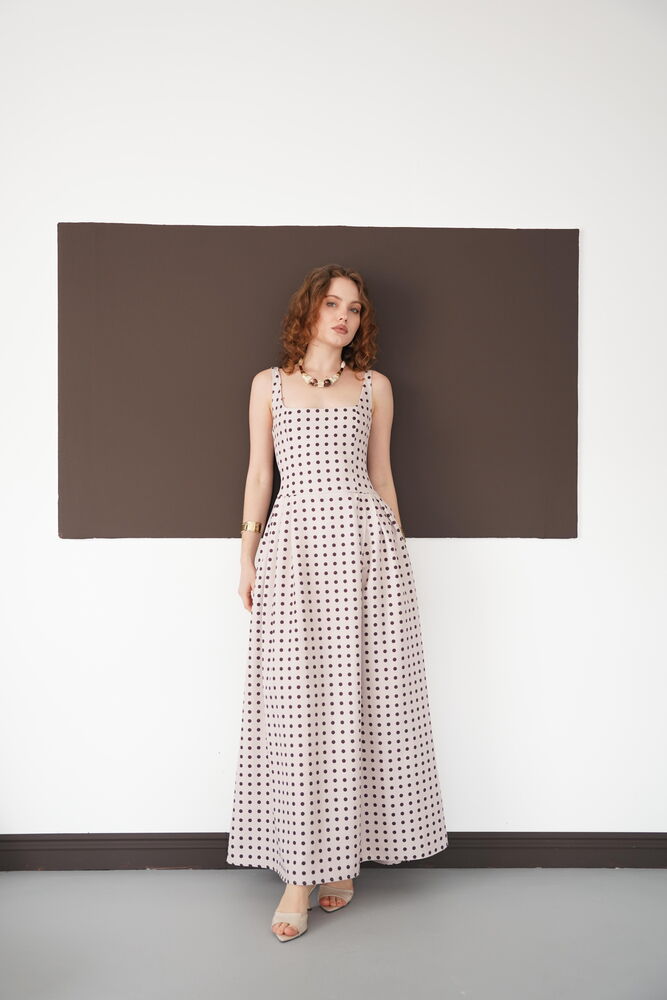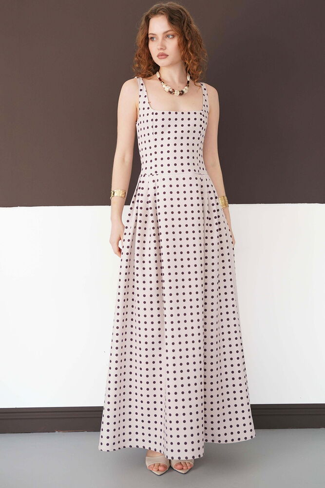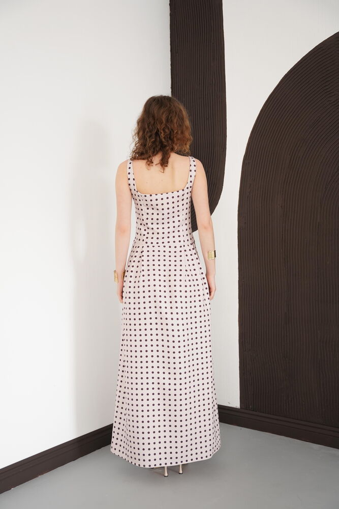 Puantiyeli Askılı Boydan Toptan Elbise - Taş Kahve | D3004 - Topshow