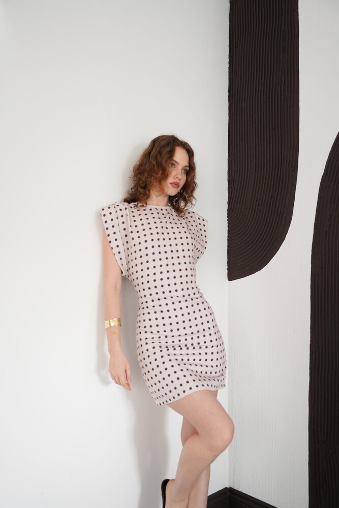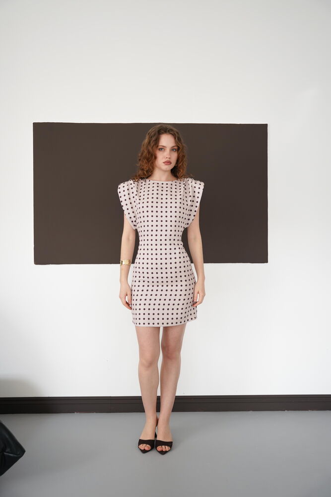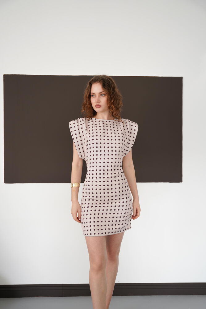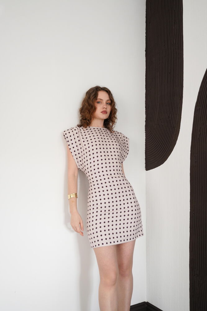 Puantiyeli Sıfır Kol Toptan Elbise - Taş | d2946 - Topshow