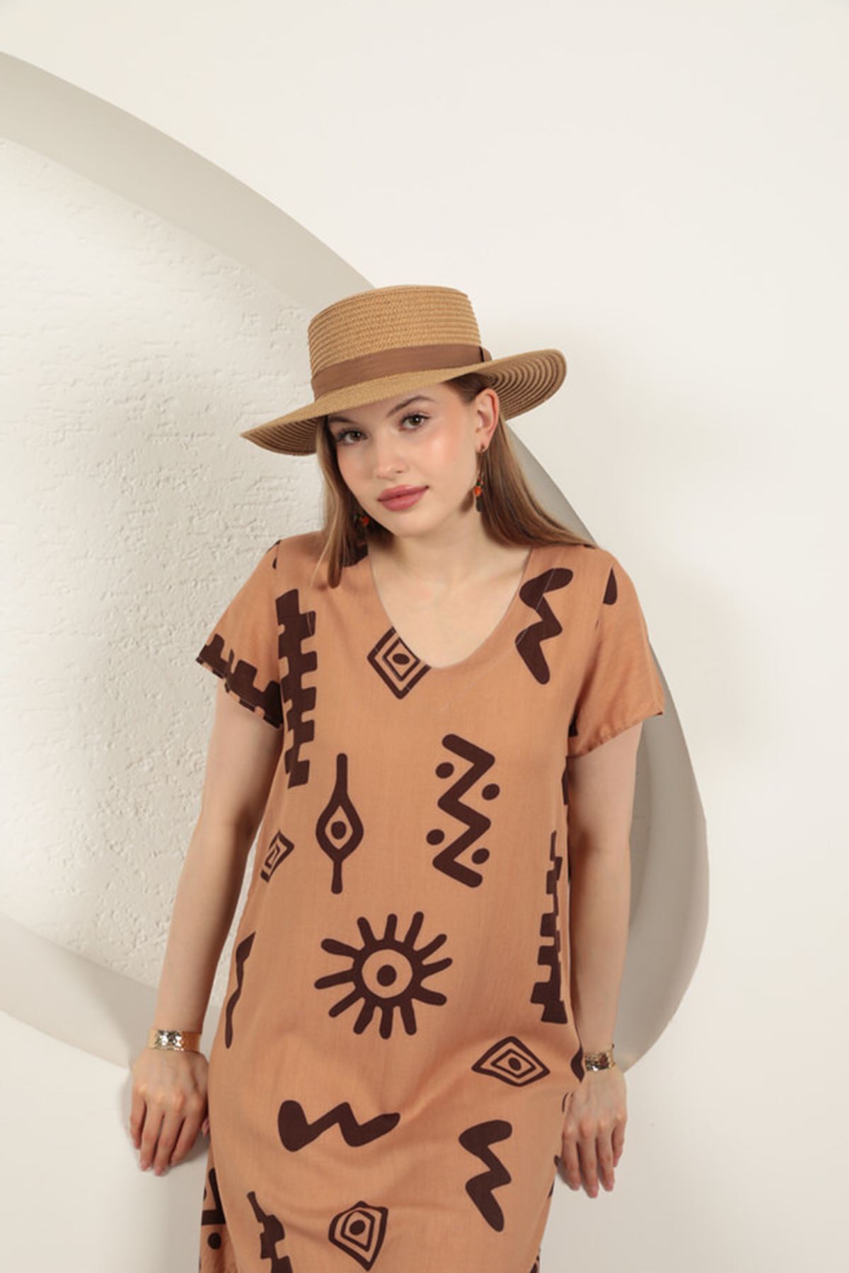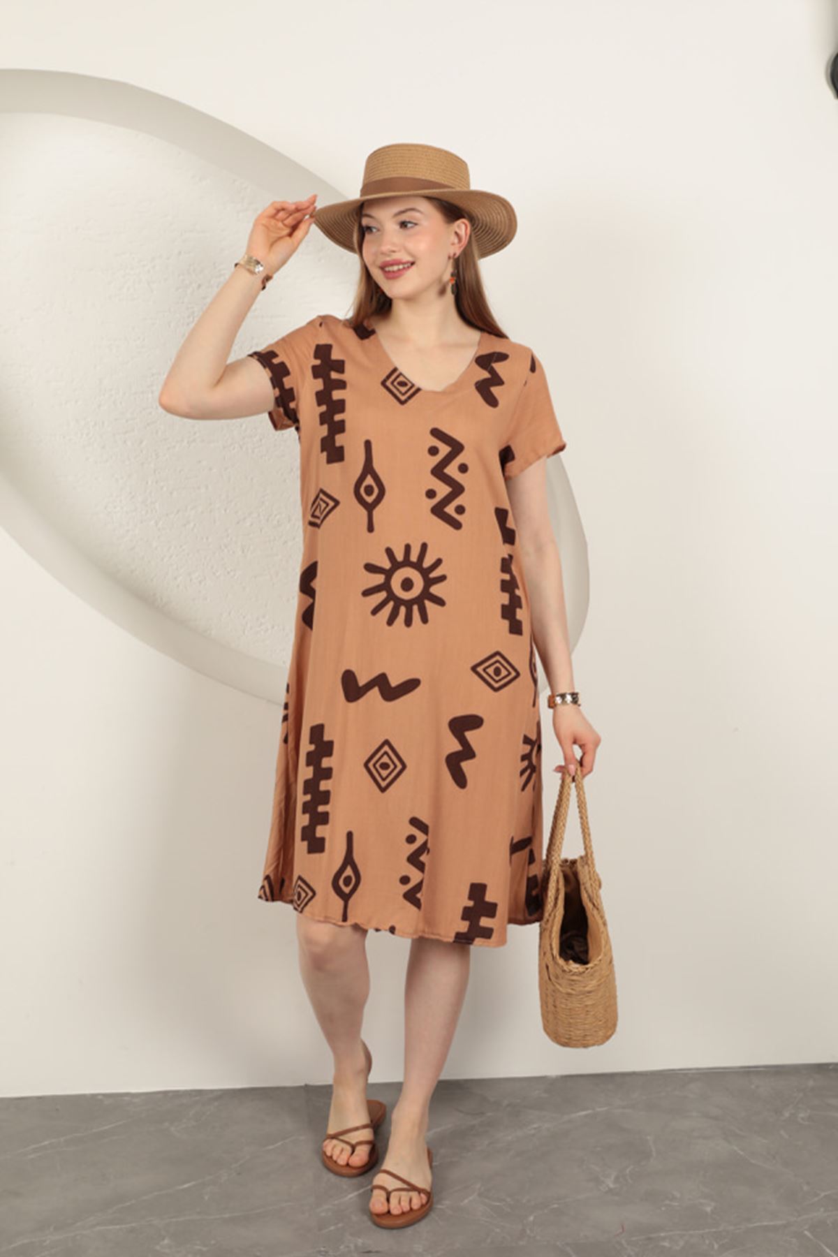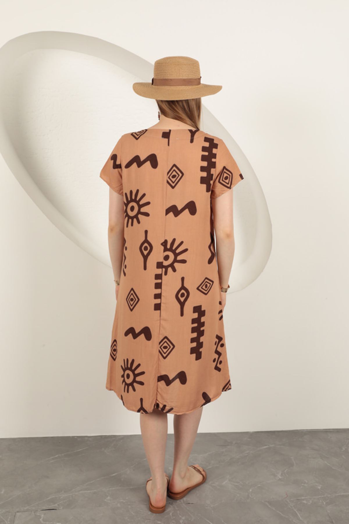 Viskon Kumaş Etnik Elbise-Taba