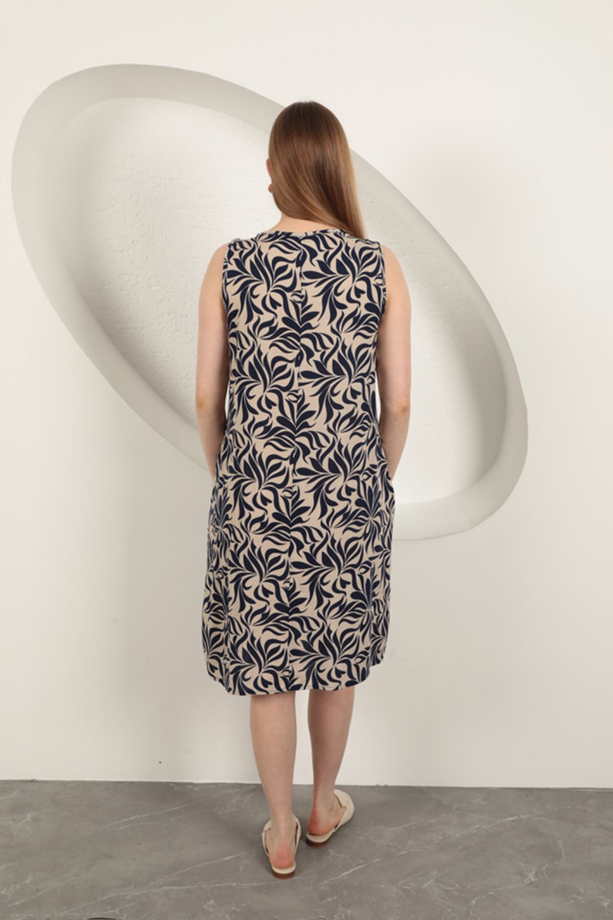 Viskon Kumaş Yaprak Desenli Elbise-Lacivert