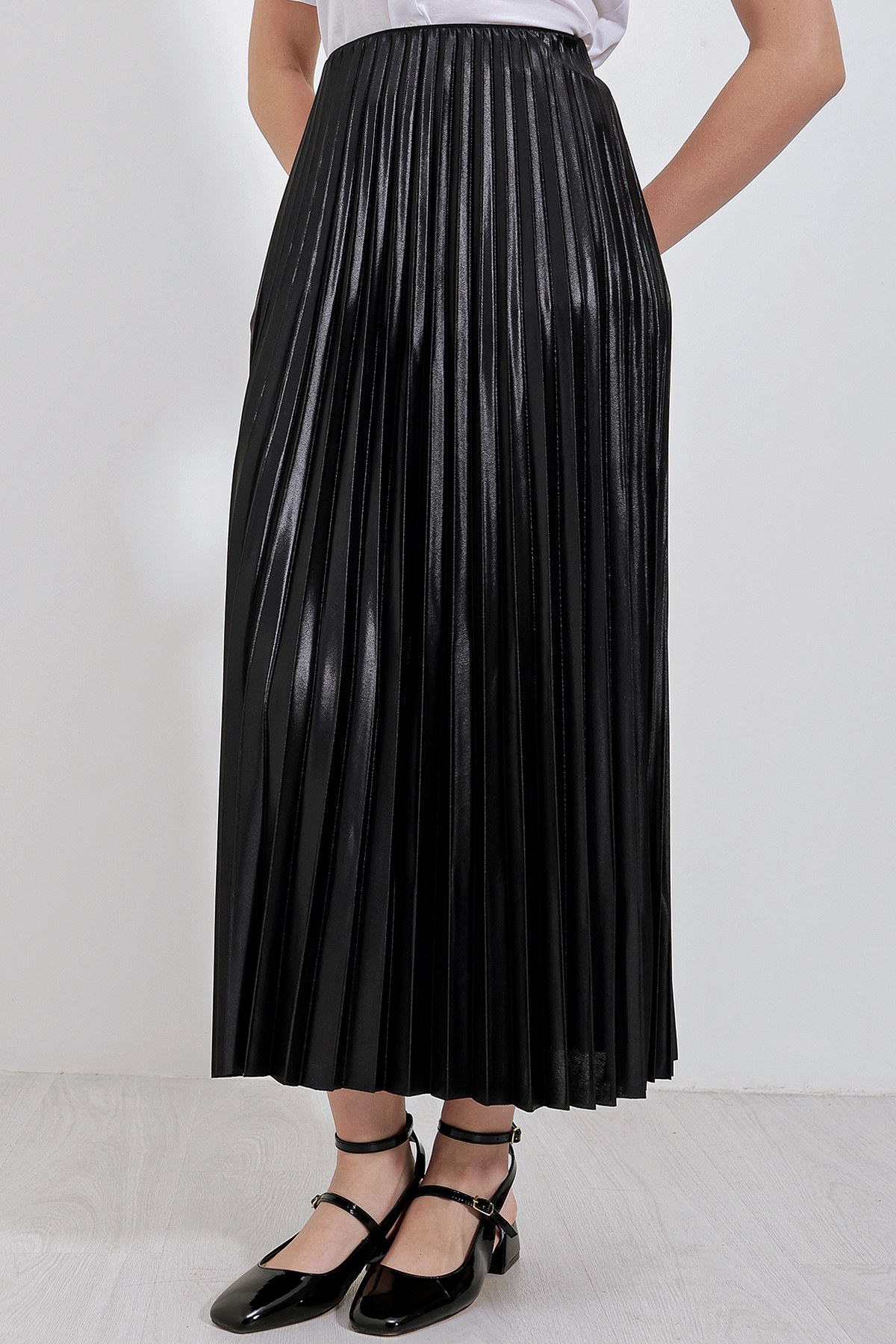 8009 Deri Görünümlü Piliseli Etek - Siyah