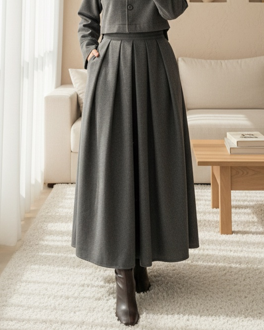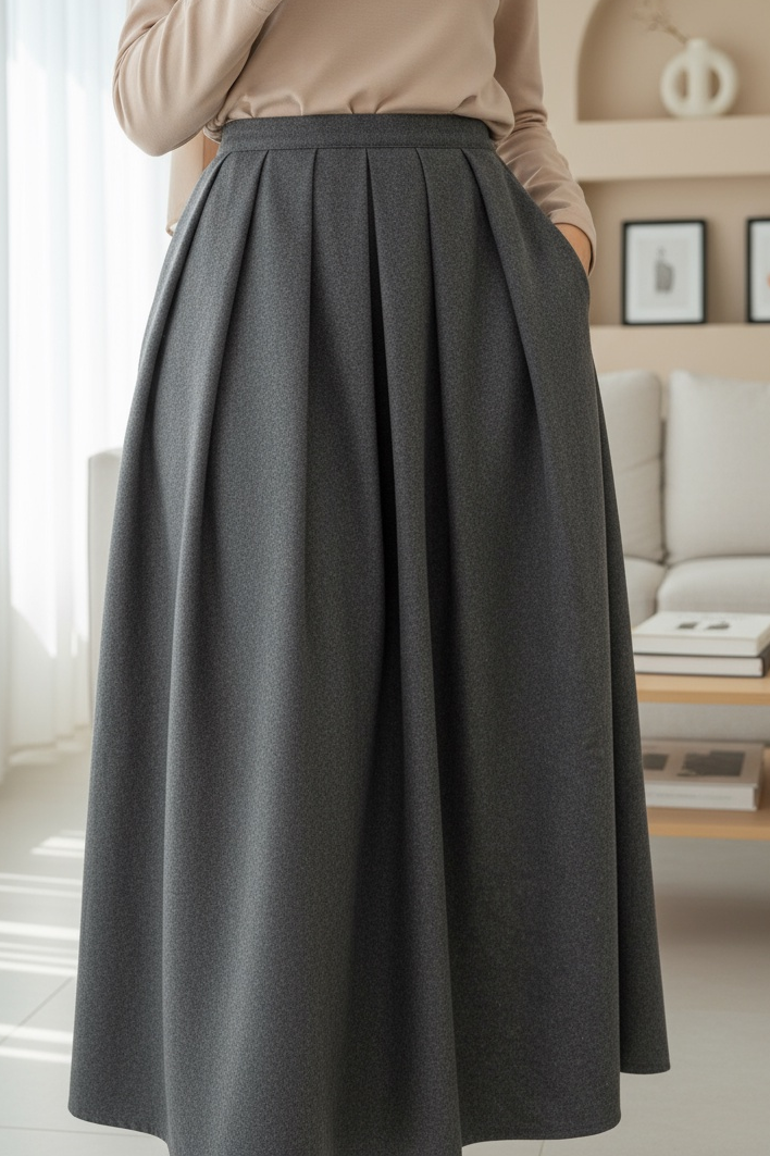 Pileli Fermuarlı Kaşe Etek