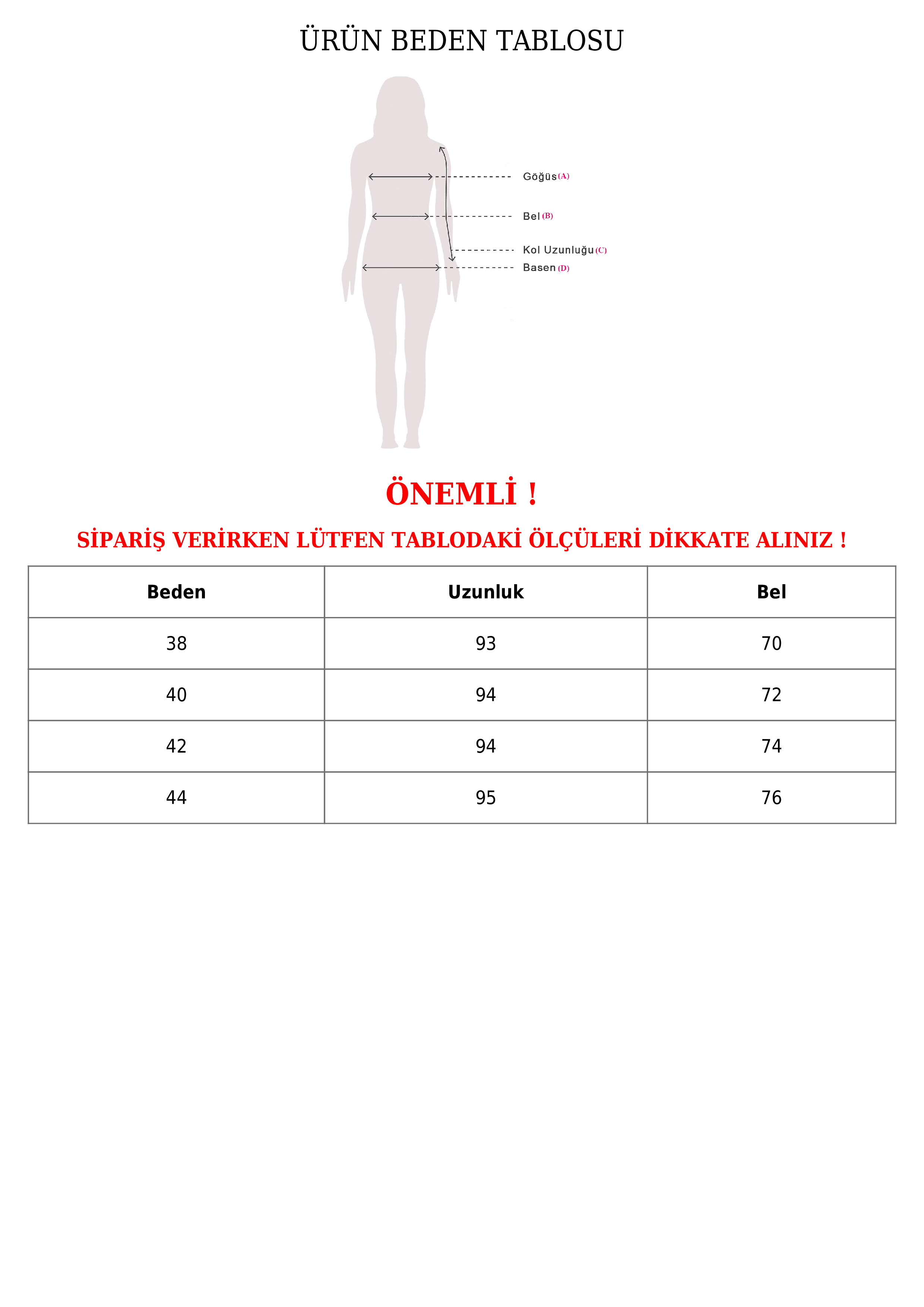 Giydiğiniz bedeni ölçü tablosuna bakarak belirleyebilir size en uygun bedeni sepetinize ekleyerek en iyi fiyata sipariş edebilirsiniz.