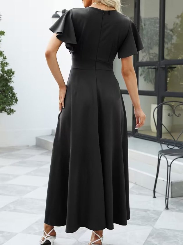 Kadın Kısa Kollu Kruvaze Yakalı ön Asimetrik Volanlı Uzun Ithal Krep Elbise , 32534