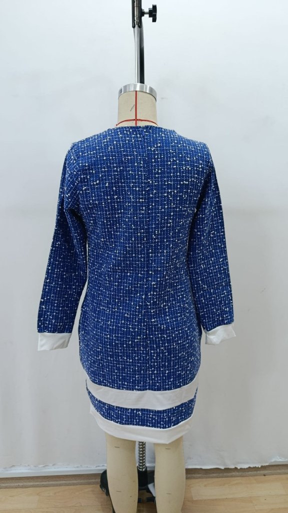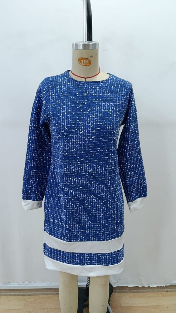 Kadın Uzun Kollu Yuvarlak Yaka Etek Ucu şerit Detaylı Mini Dokuma Elbise