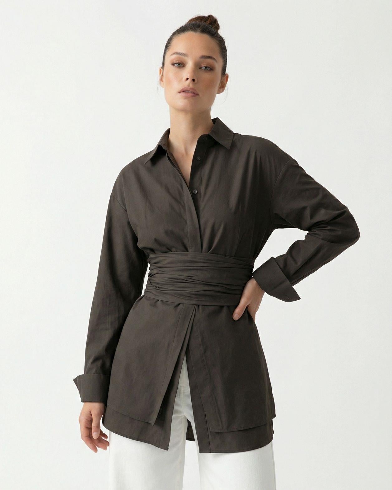 Uzun Kollu Toptan Gömlek - Kahve | F2101 - Topshow