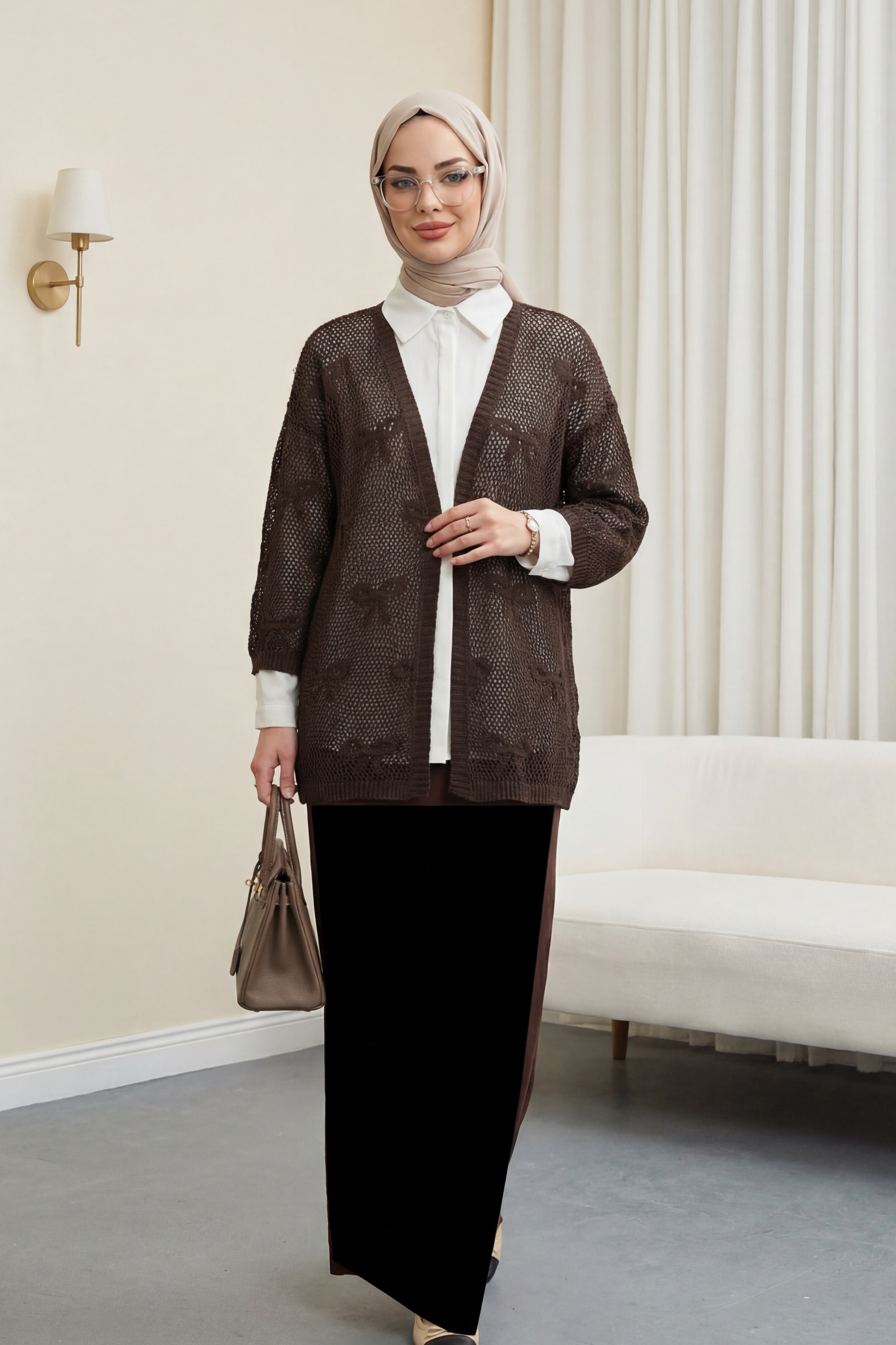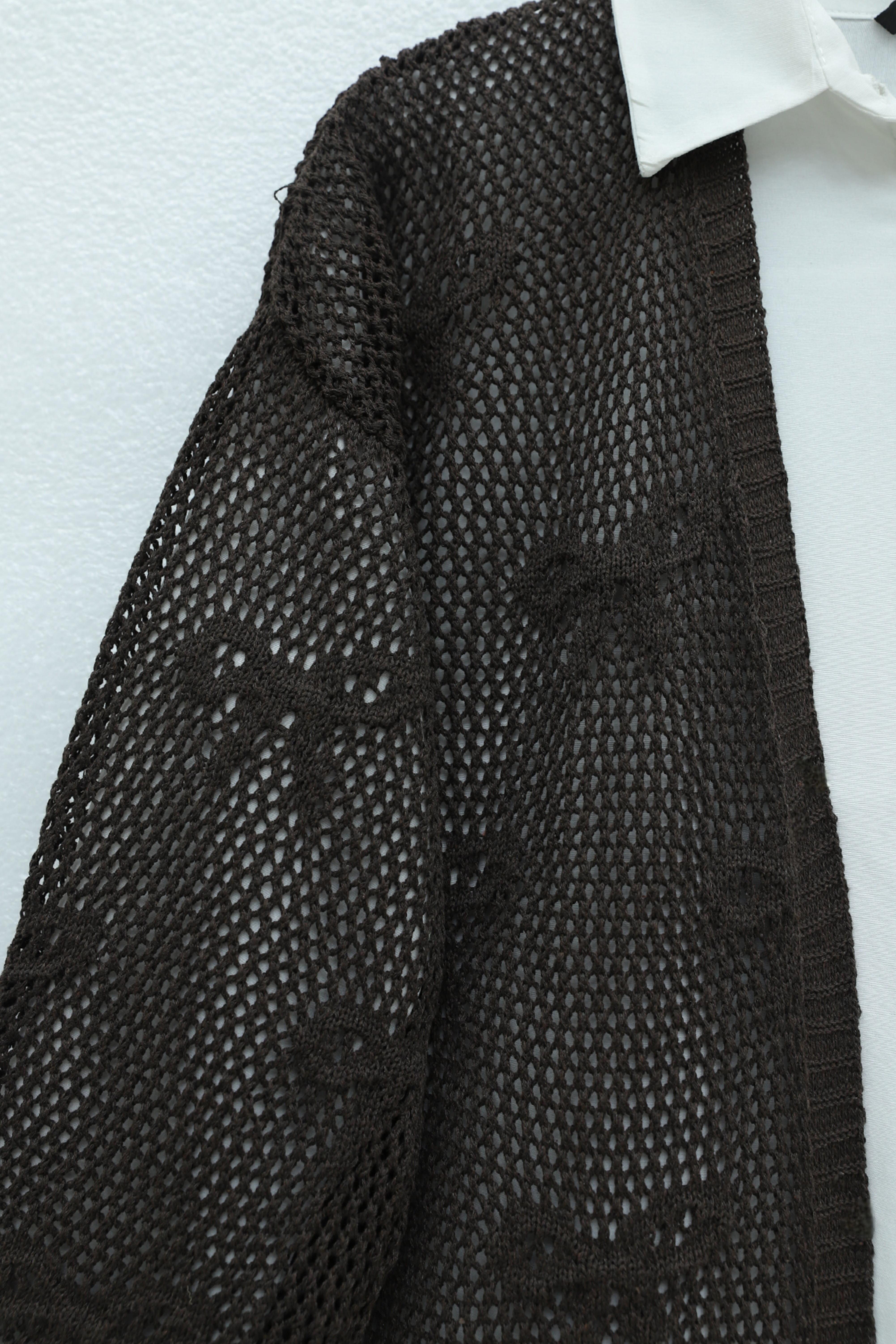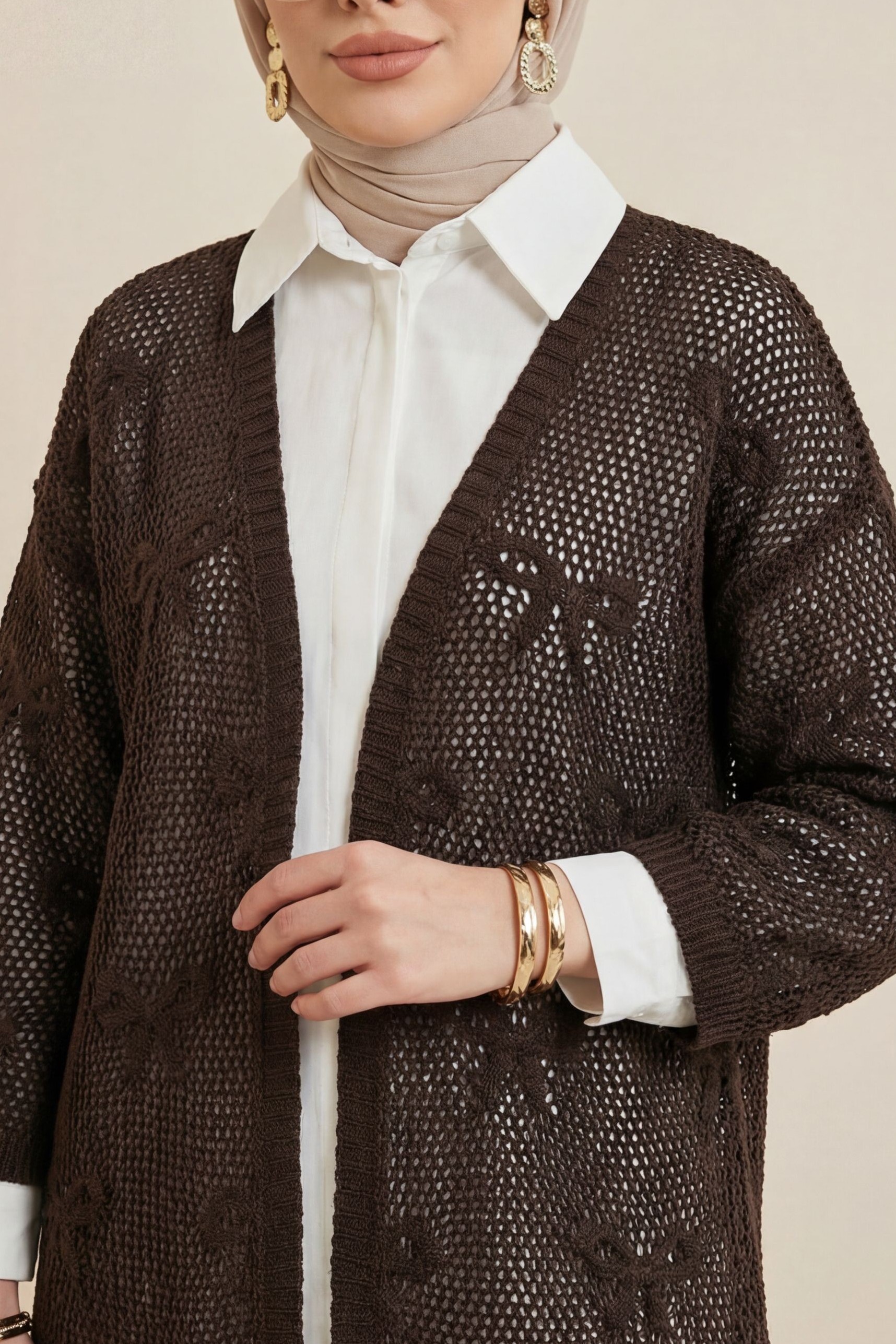 Podyumplus Fiyonk Desenli Ajurlu Triko Hırka -K. Kahve