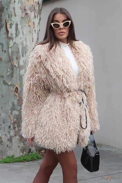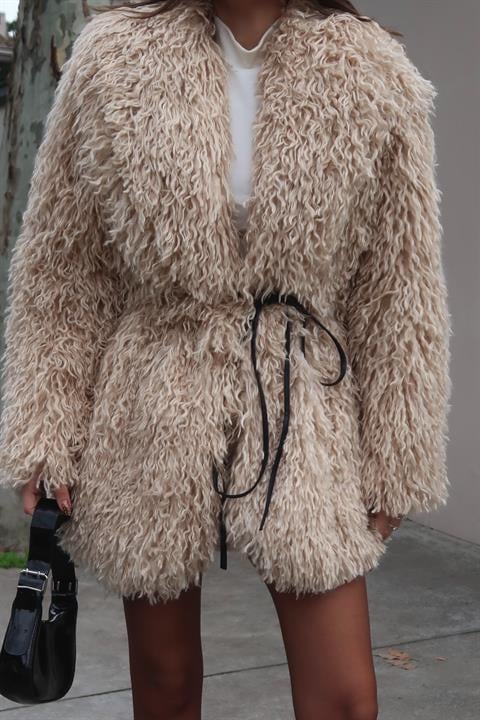 Uzun Tüylü Peluş Kürk Kaban Kuşaklı 7116