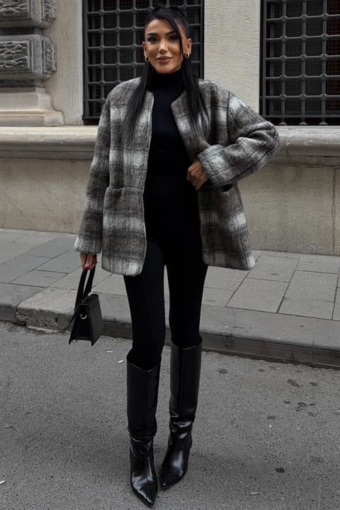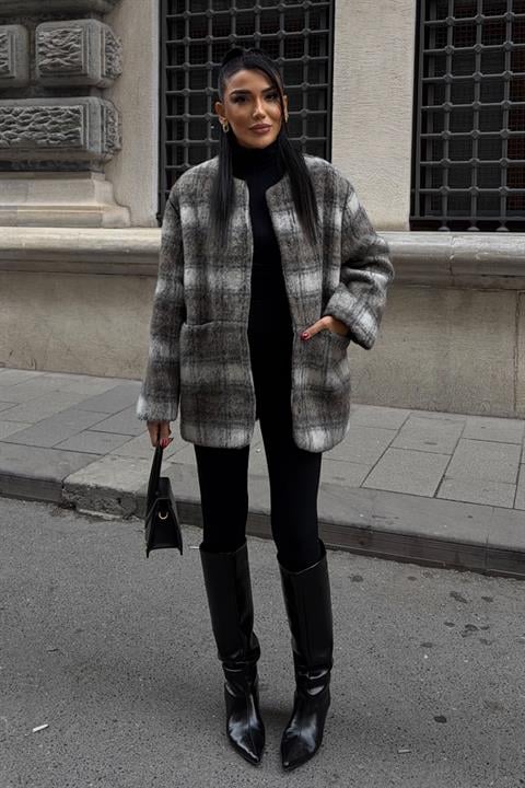 Yuvarlak Yaka Ekose Desenli Tüylü Mont 7140