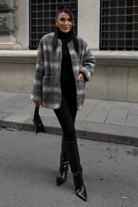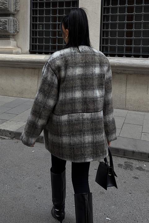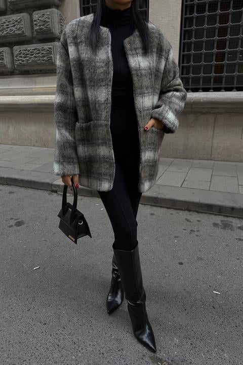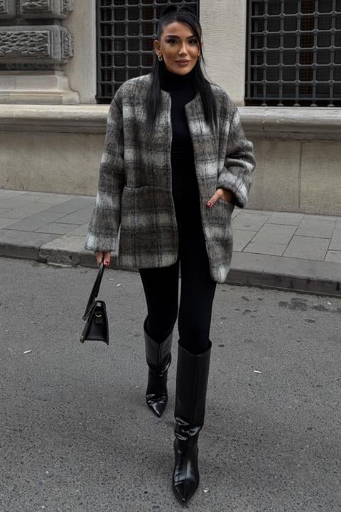 Çift Düğme Kapamalı Ekose Desenli Kaşe Kaban 7141