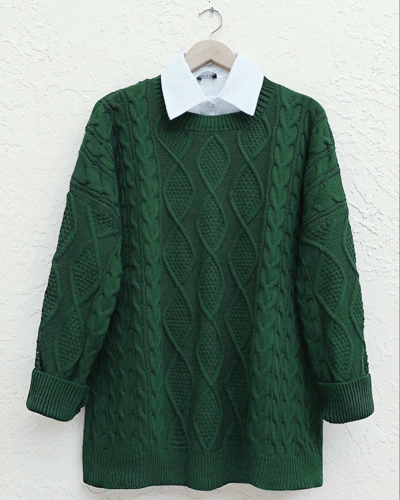 Podyumplus Petek Desen Kışlık Salaş Triko Kazak -Koyu Yeşil