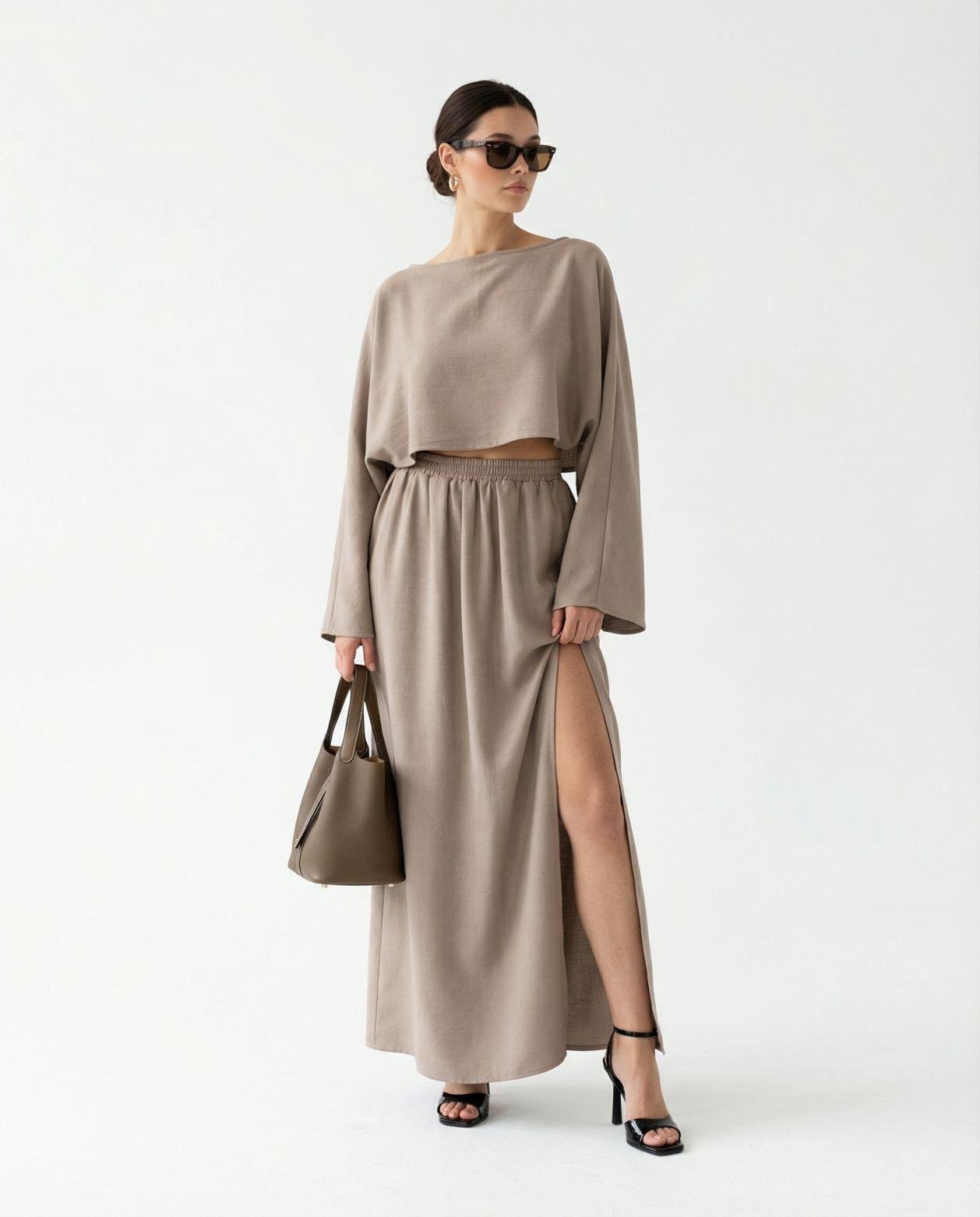 Yırtmaçlı Beli Bağcıklı Kolu Katlamalı Pantolonlu Oyşo Takım -Füme