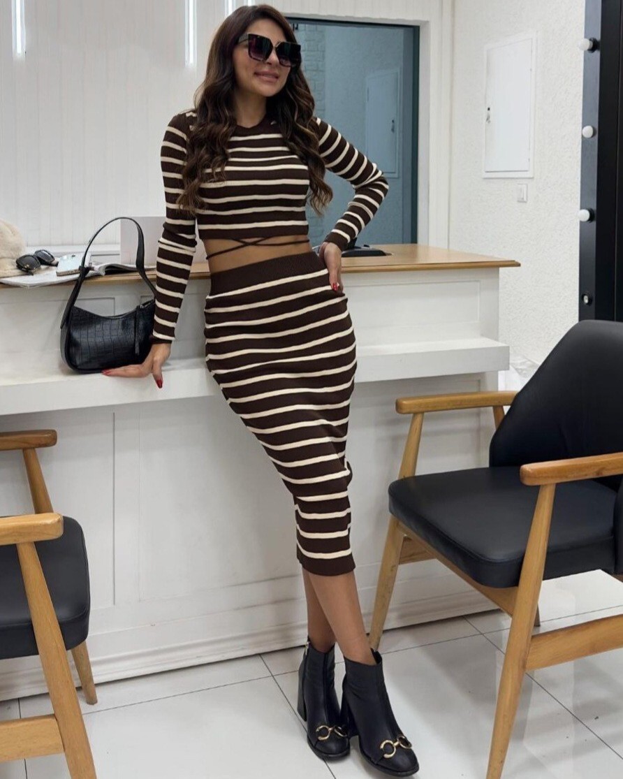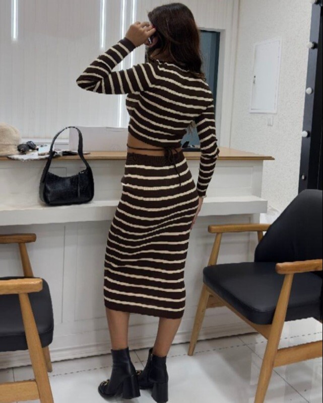 Bisiklet yaka, beli bağcıklı; eteğinin beli lastikli triko takım modelimiz yeni sezonun en çok sevilen modelleri arasında yer almaktadır.