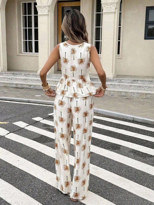 Kadın Askılı V Yakalı Belden Bağlamalı Desenli Bluz Ve Pantolon Ikili Takım