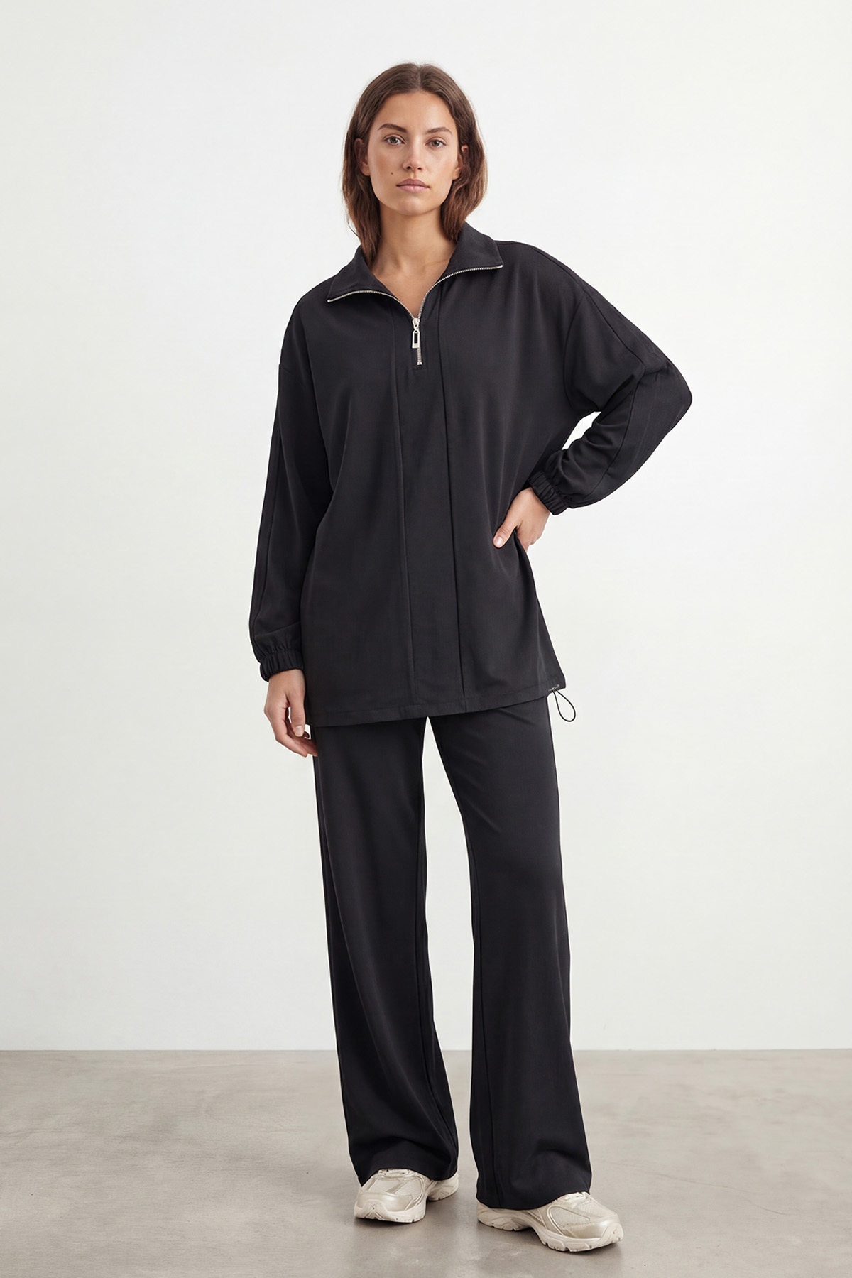Üst parçada yer alan yarım fermuar detayı ve kontrast renk geçişleri, takıma sportif ve dinamik bir hava katarken; rahat kesimli pantolonu ile dengeli ve şık bir siluet oluşturur. Günlük kombinlerde, seyahatlerde ve hafta sonu stilinde zahmetsiz şıklık sağlar.
