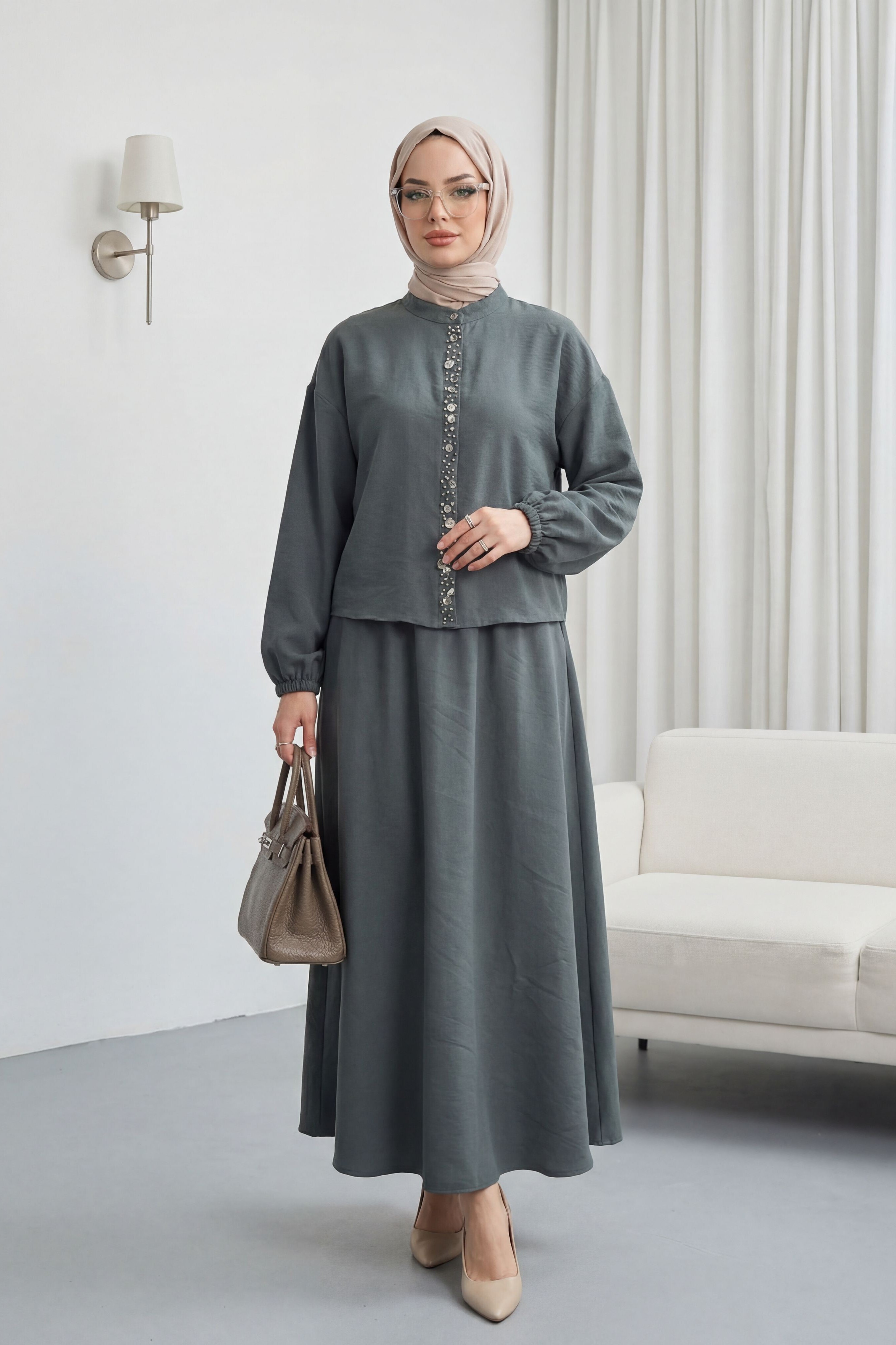 Kolu Lastikli Önü İncili Düğmeli Etekli Modal Takım