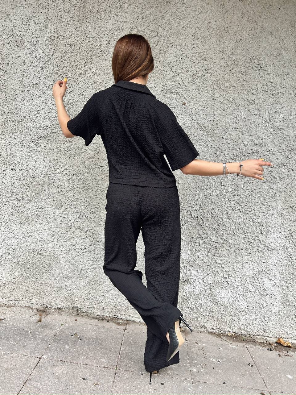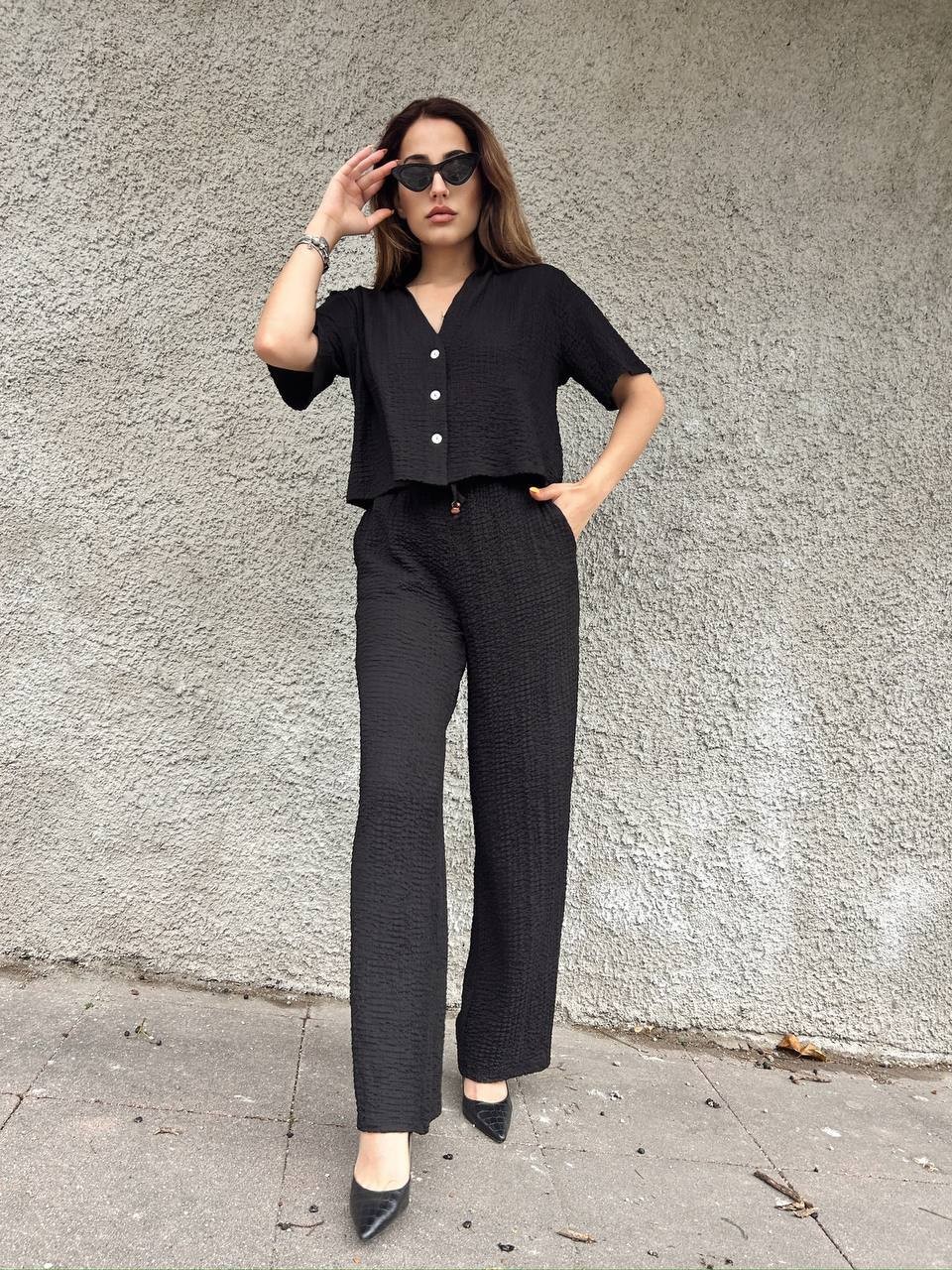 Krepon Kumaş Gömlekli Bol Paça Takım -siyah