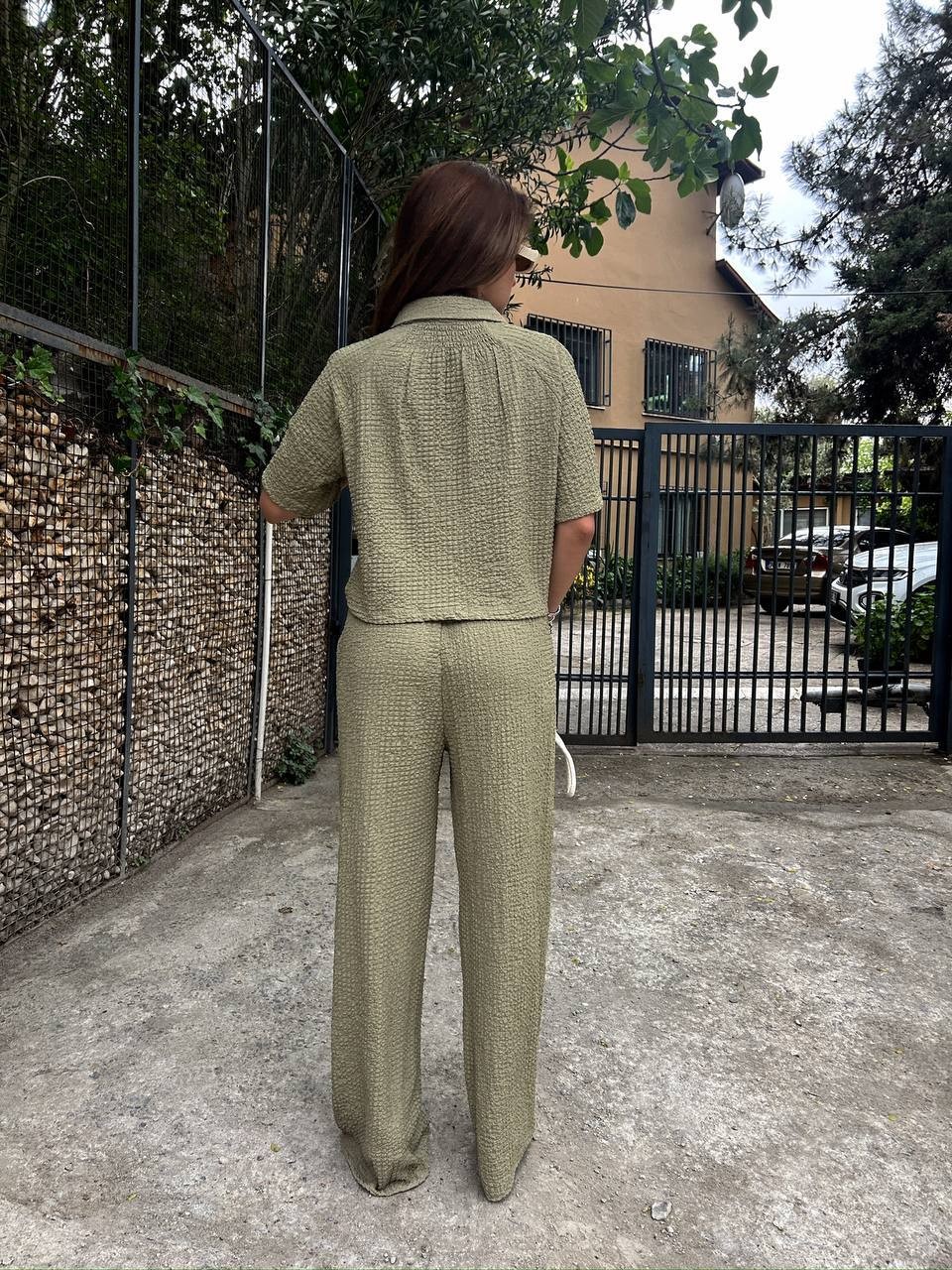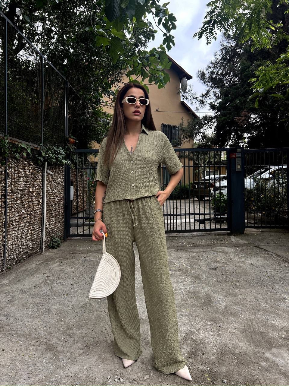Krepon Kumaş Gömlekli Bol Paça Takım -Haki