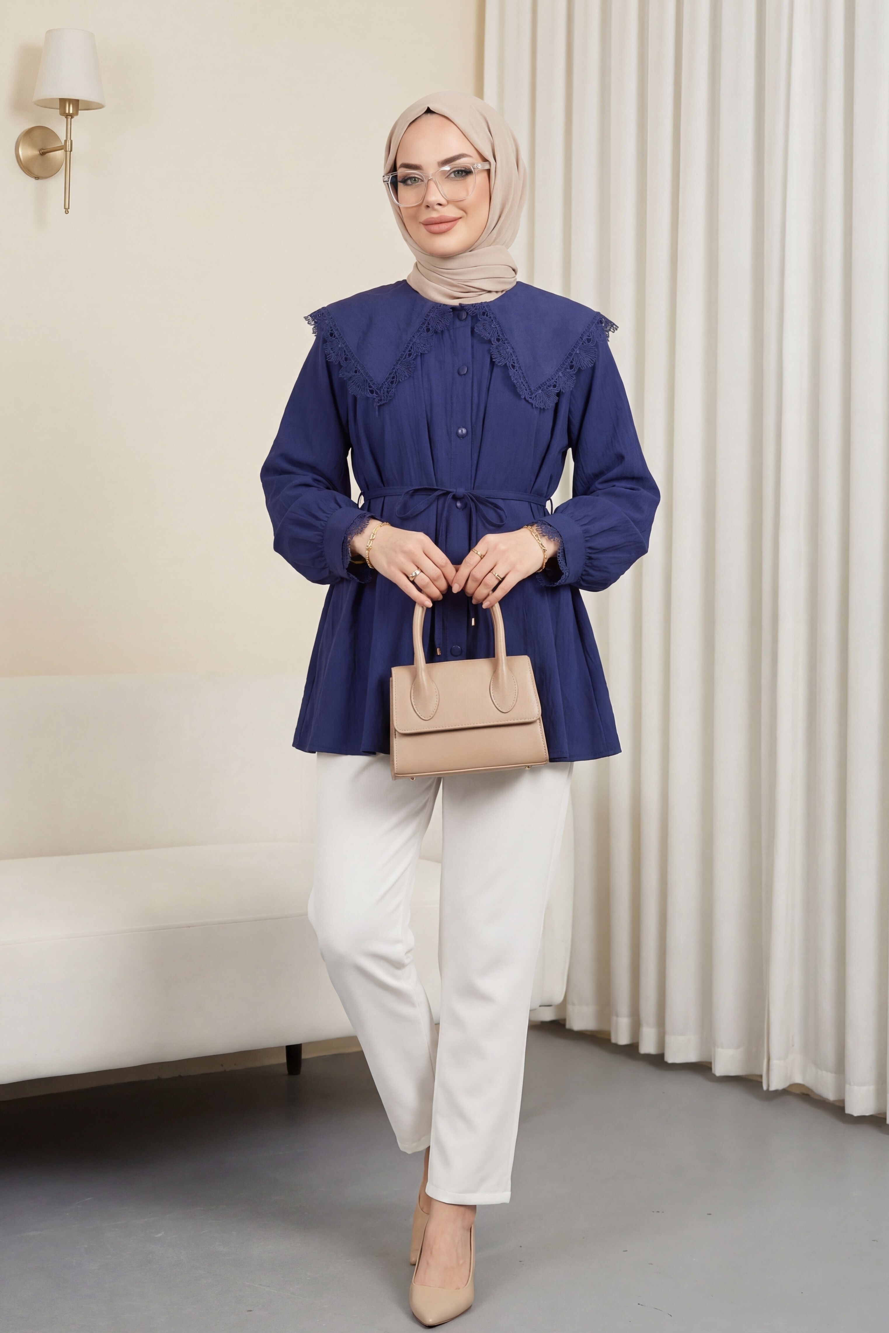 Bebe Yaka Fistolu Beli Bağcıklı Modal Tunik, zarif ve rahat bir stil sunar. Bebe yaka ve fisto detayları feminen bir görünüm kazandırırken, beli bağcıklı formu silueti zarif şekilde vurgular. Modal kumaşı yumuşak ve nefes alabilendir. Günlük ve şık kombinlerde rahatlıkla tercih edilir.