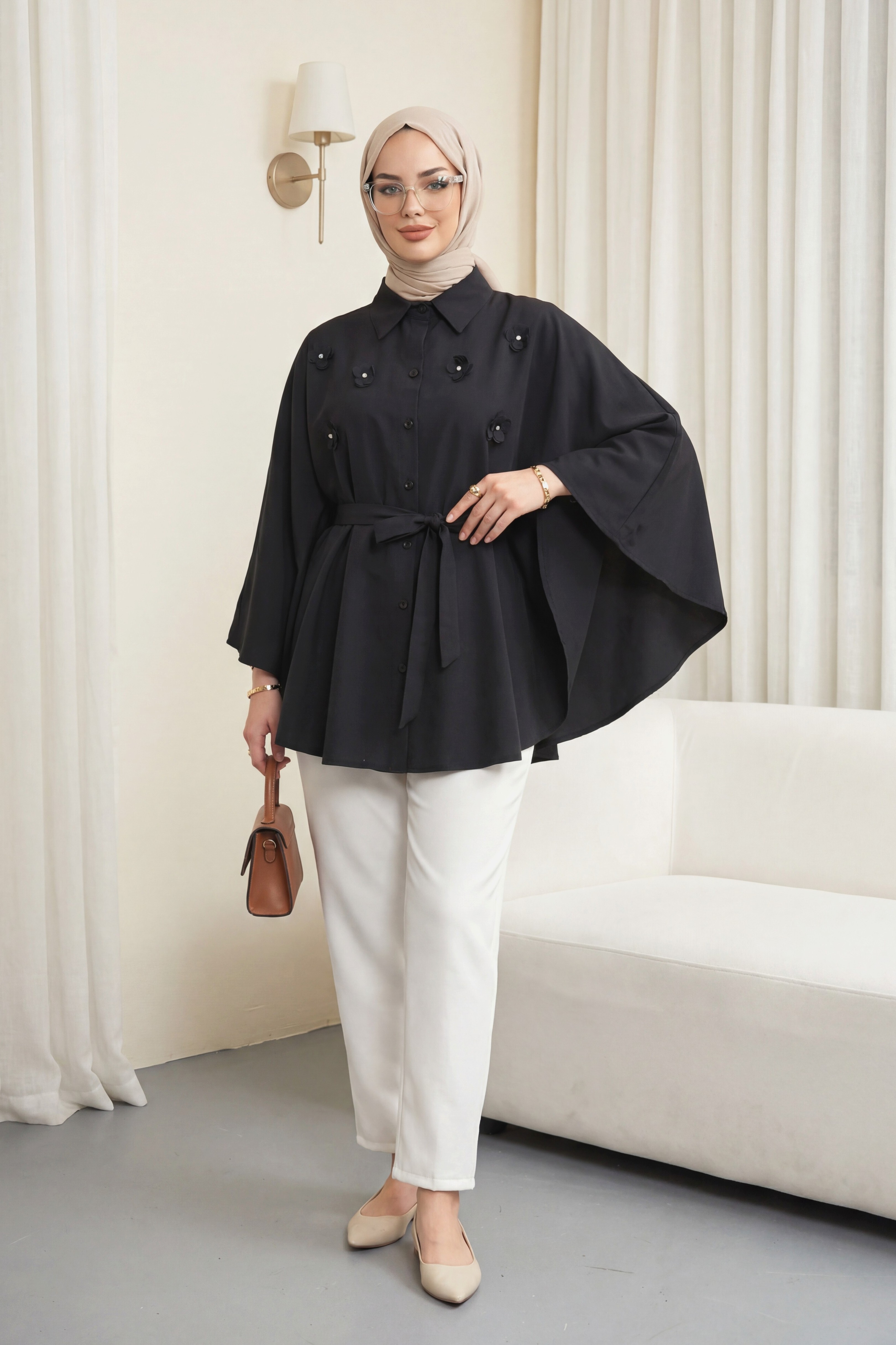 Zarif çiçek detaylarıyla feminen bir dokunuş sunan Önü Çiçek Detaylı Beli Bağcıklı Düğmeli Panço, şıklığı ve konforu bir arada arayanlar için ideal. Ayarlanabilir bağcık detayı sayesinde vücuda uyum sağlar, düğmeli tasarımıyla kolayca giyilip çıkarılır. Serin havalarda stilinizi tamamlayacak şık ve özgün bir parça!