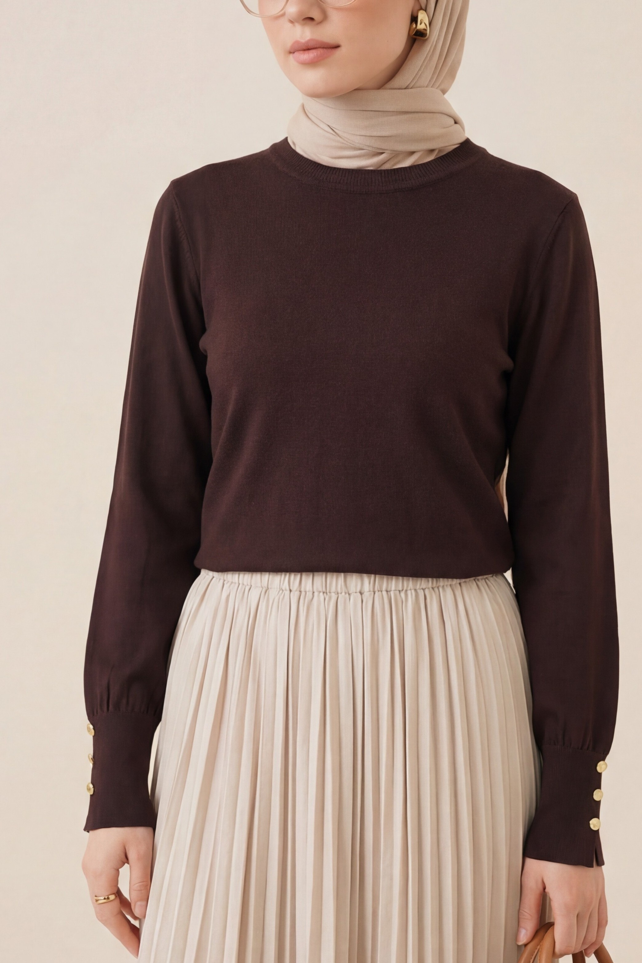 Podyumplus Yuvarlak Yaka Kolu Düğme Detaylı Triko Tunik -K. Kahve