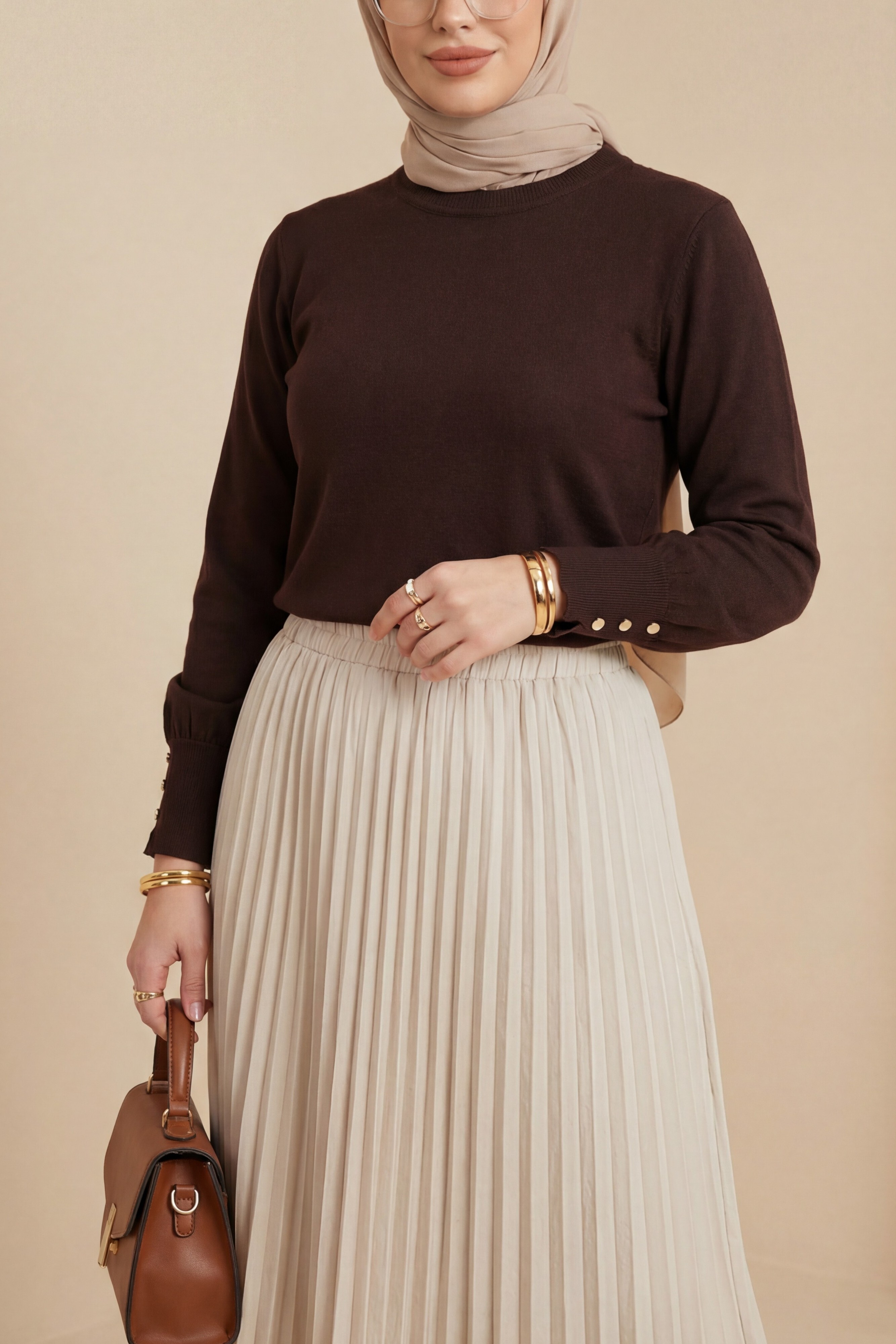 Kombindeki şal, çanta, ayakkabı ve takılar aksesuar olarak kullanılmıştır.