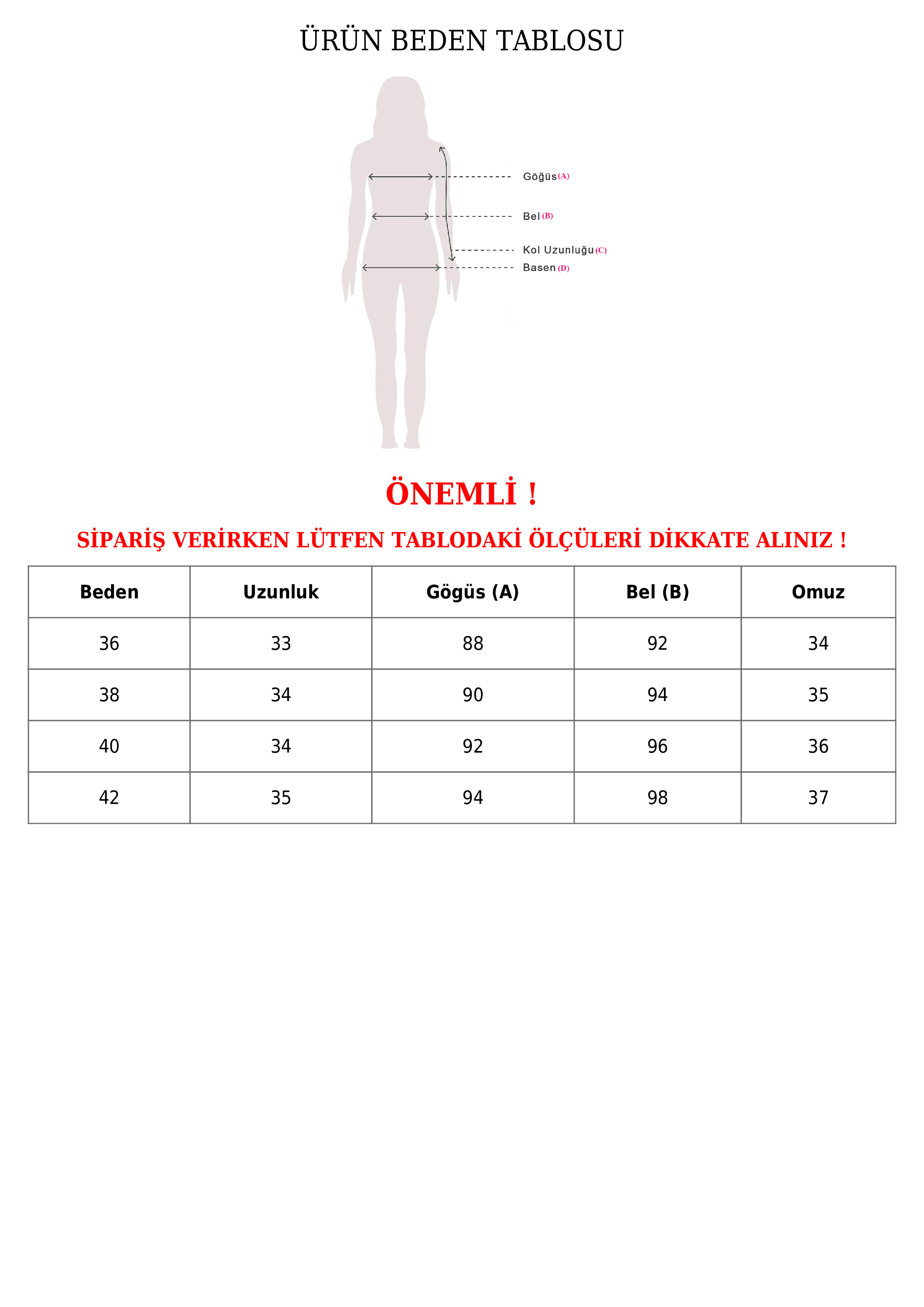 | Beden | Uzunluk | Göğüs | Bel | Omuz |