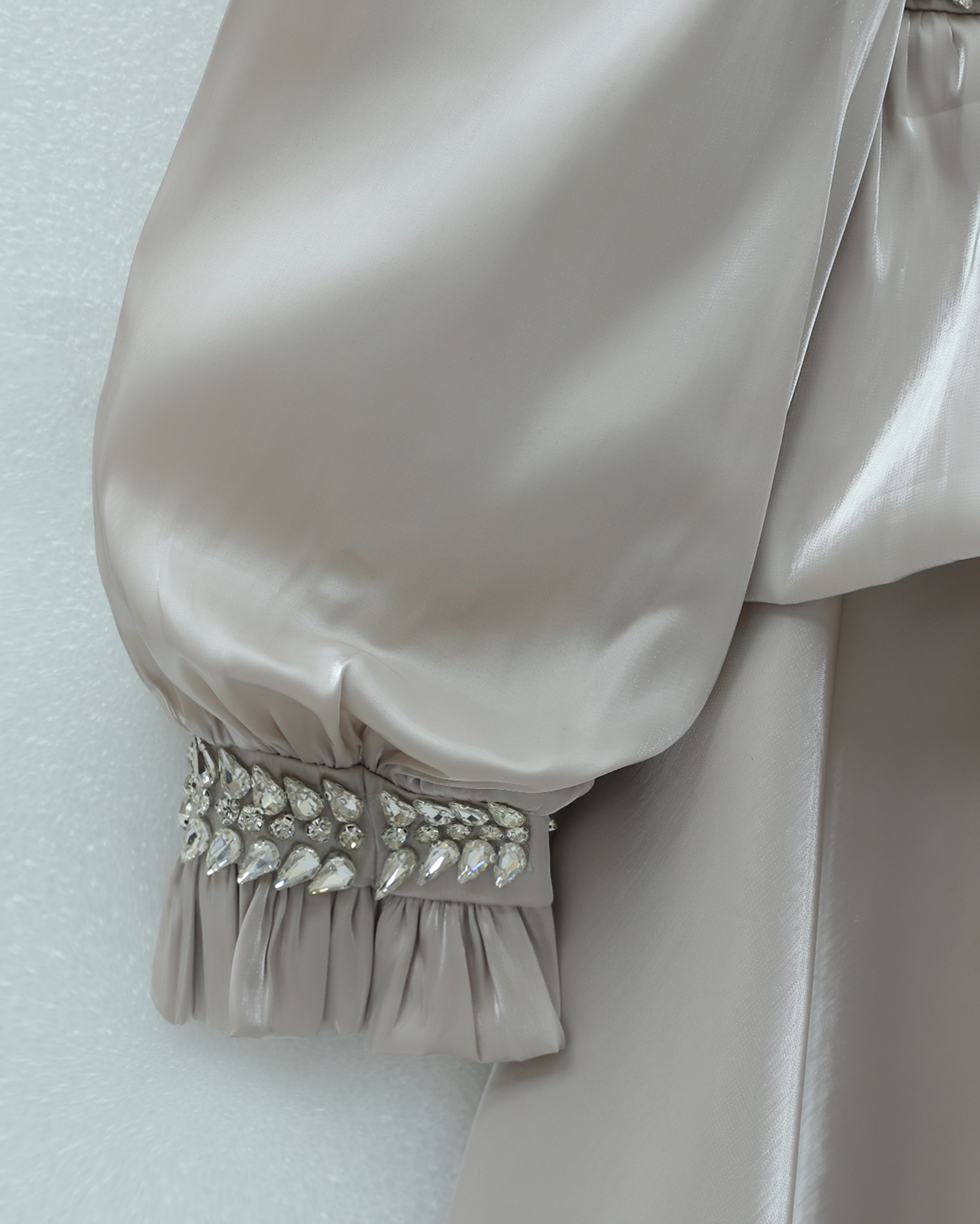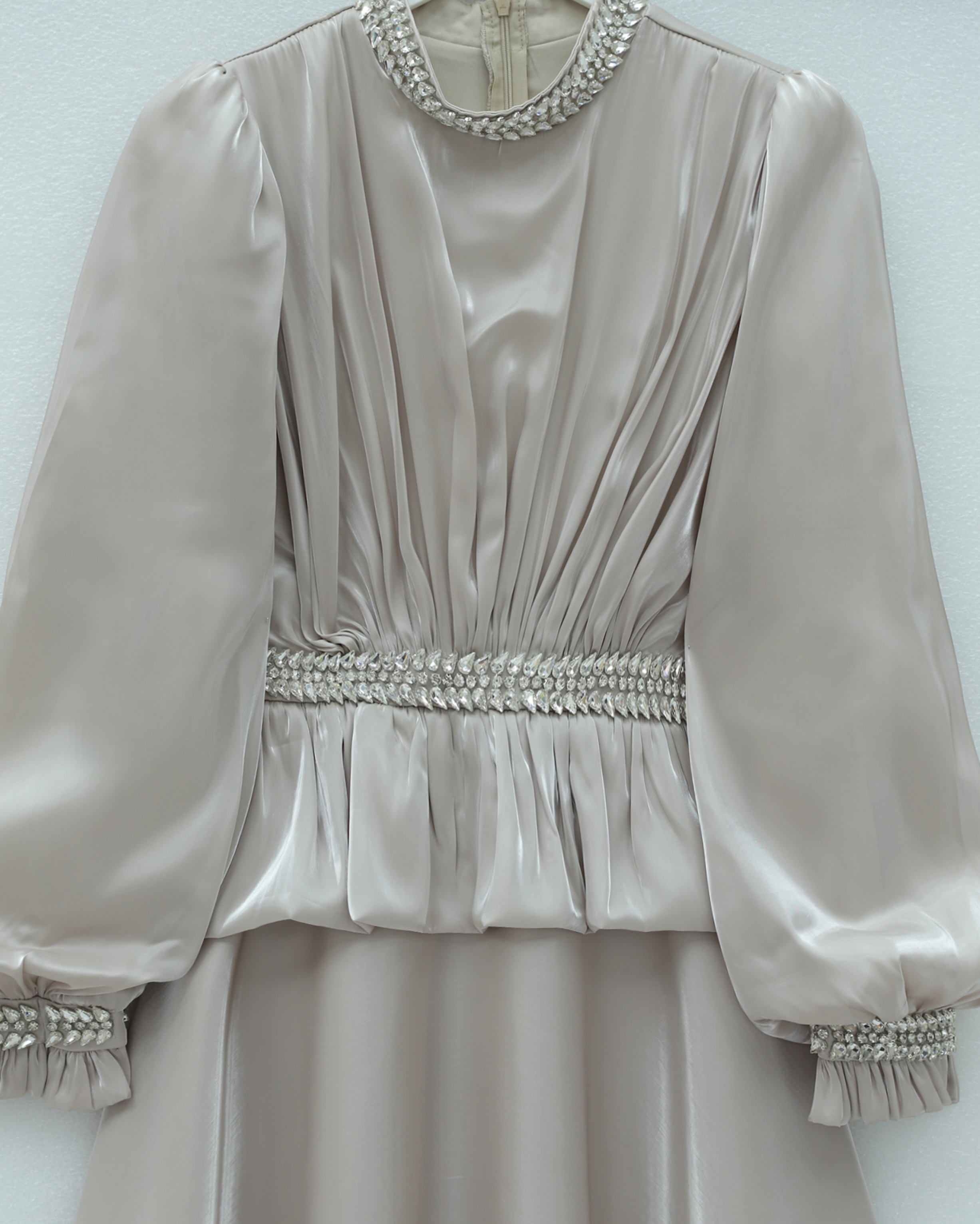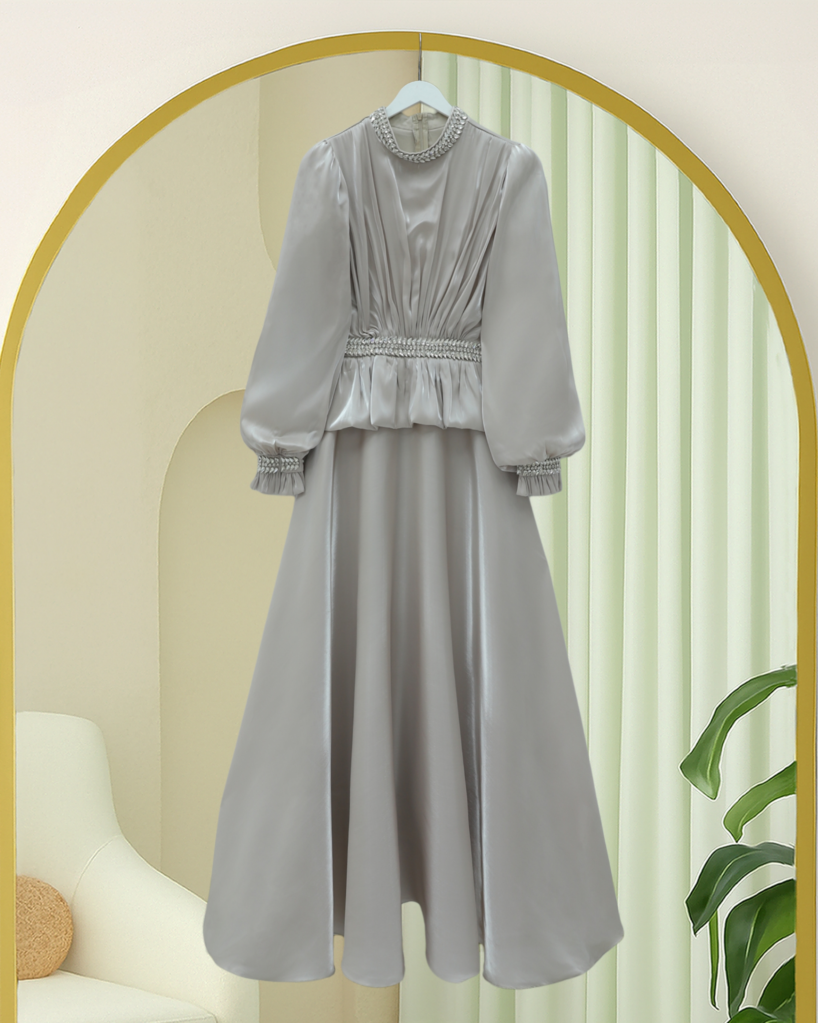 Beli Volan Detaylı Taşlı Janjan Saten Abiye