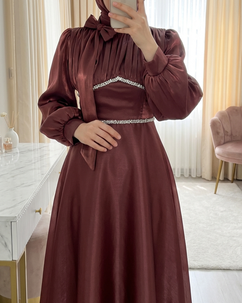 Zarafetin en modern hâlini yansıtan Yakası Fiyonklu Beli Taş Detaylı Balon Kol Abiye, özel günlerde ışığınızı yükseltmek için tasarlandı. Göğse doğru estetik bir şekilde uzanan şık fiyonk detayı, elbisenin feminen çizgisine zarif bir dokunuş katarken, bele yerleştirilen parlak taş işlemeler silueti daha ince ve etkileyici gösterir.
