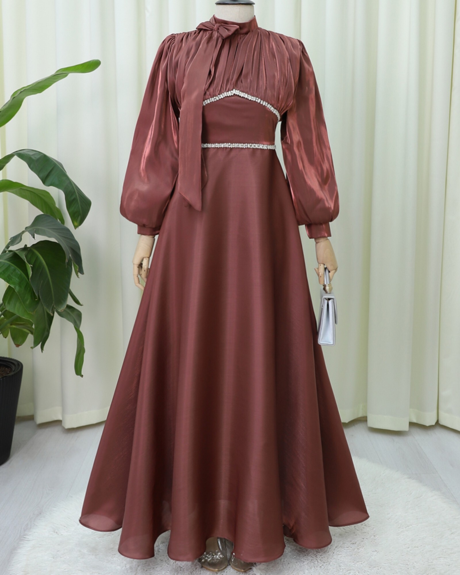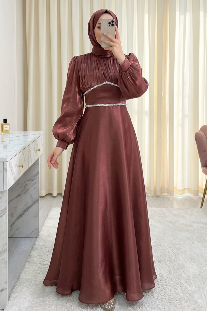 Hafif hacimli balon kollar, abiyeye hem romantik hem de iddialı bir hava kazandırır. Akışkan kumaş yapısı sayesinde yürüdükçe zarifçe hareket eden model; söz, nişan, mezuniyet, davet ve tüm özel organizasyonlar için mükemmel bir seçimdir. “Taşlı abiye elbise”, “balon kol abiye modelleri”, “fiyonklu abiye” gibi adlandırılabilir.