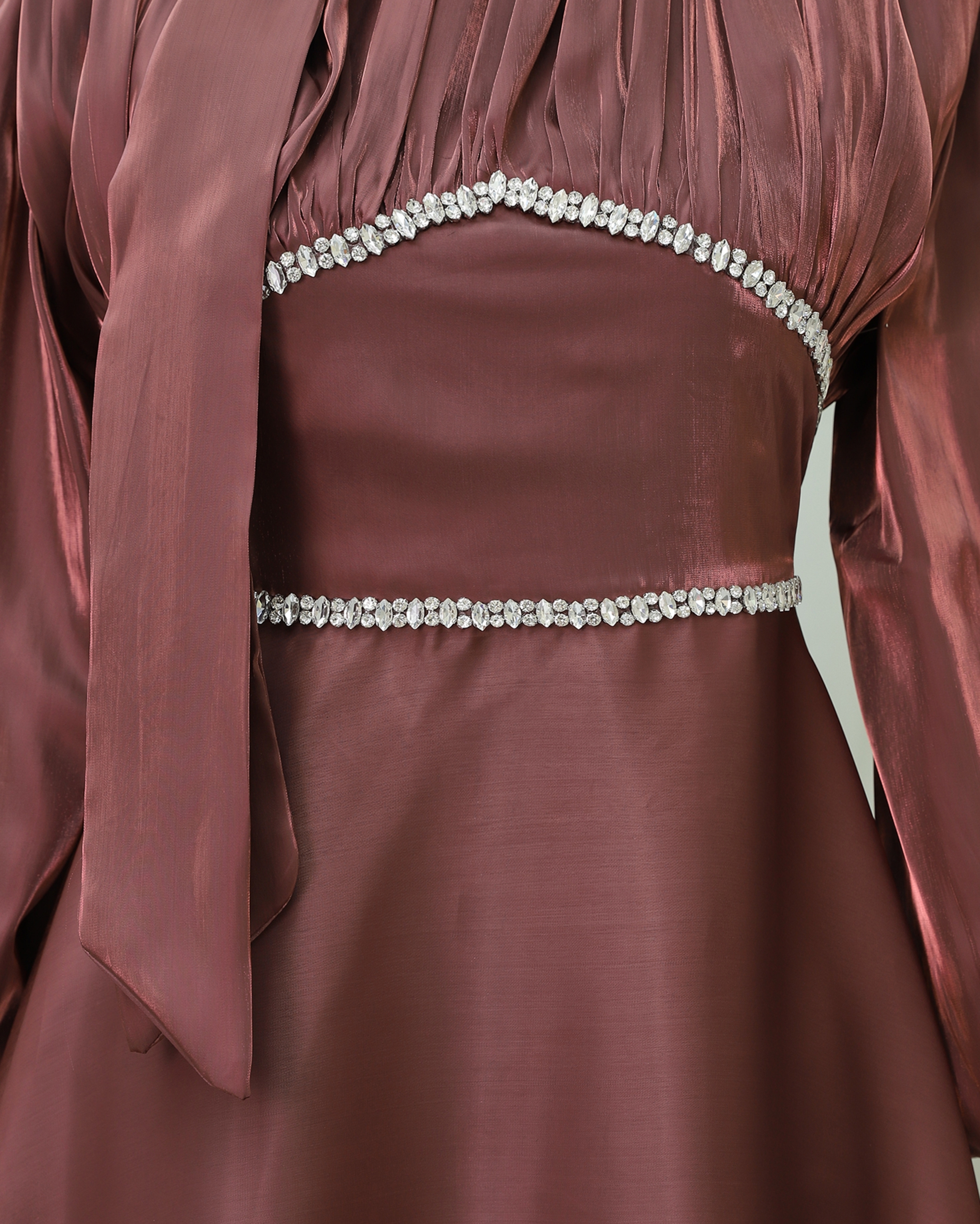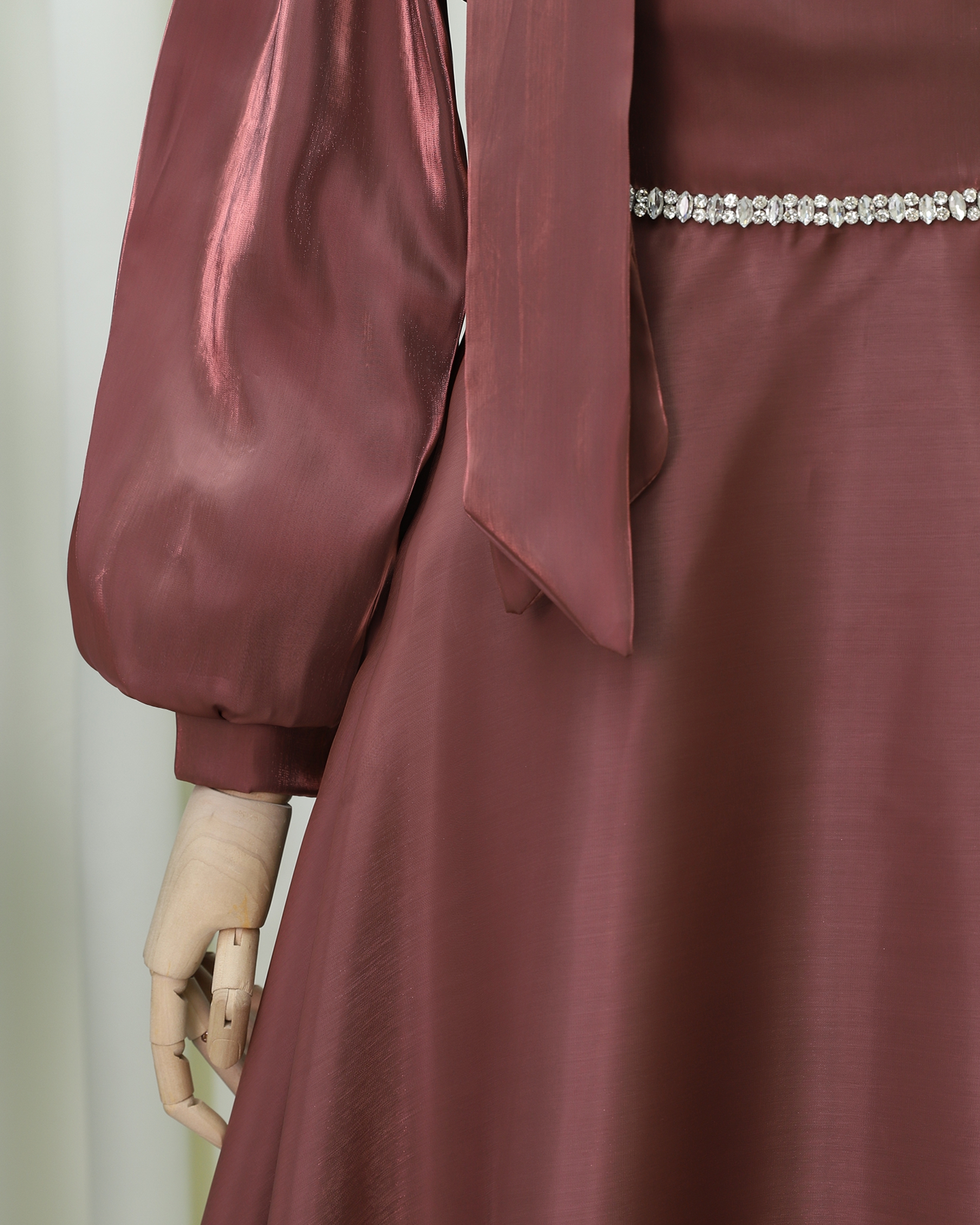 Podyumplus Yakası Fiyonklu Beli Taş Detaylı Balon Kol Abiye -G.Kurusu