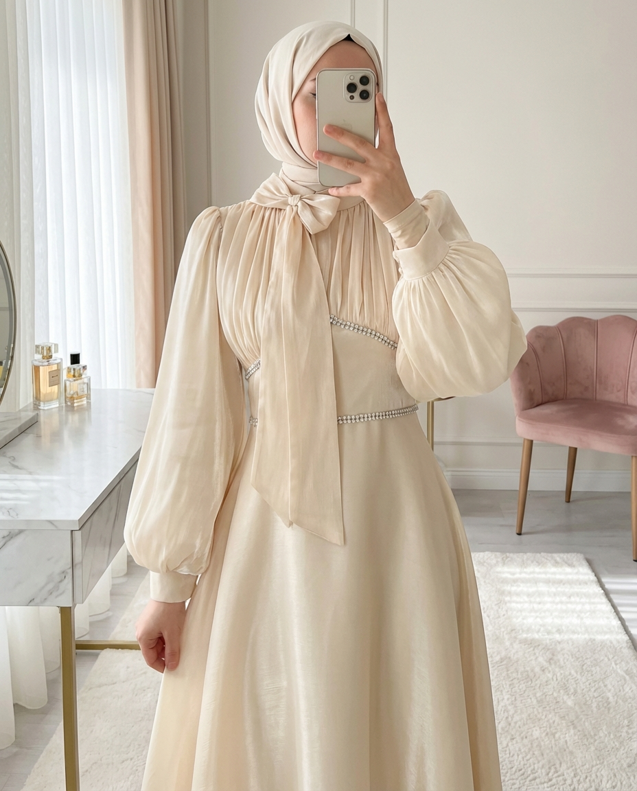 Hafif hacimli balon kollar, abiyeye hem romantik hem de iddialı bir hava kazandırır. Akışkan kumaş yapısı sayesinde yürüdükçe zarifçe hareket eden model; söz, nişan, mezuniyet, davet ve tüm özel organizasyonlar için mükemmel bir seçimdir. “Taşlı abiye elbise”, “balon kol abiye modelleri”, “fiyonklu abiye” gibi adlandırılabilir.