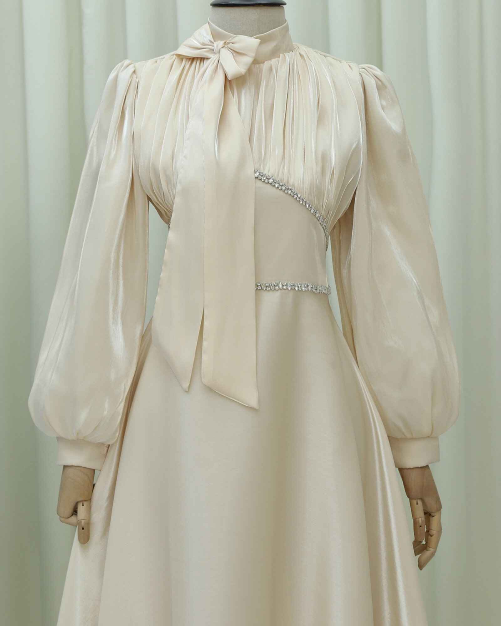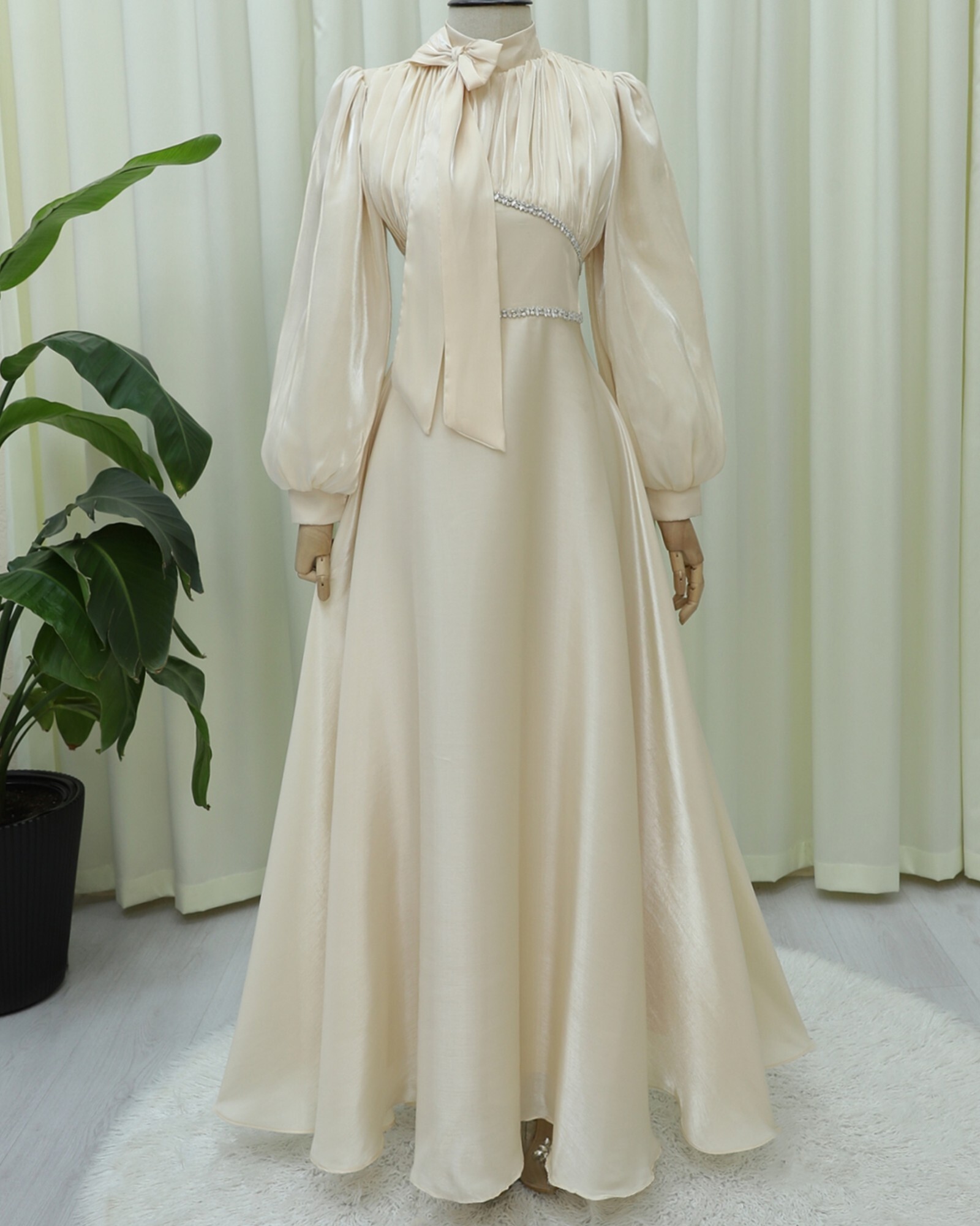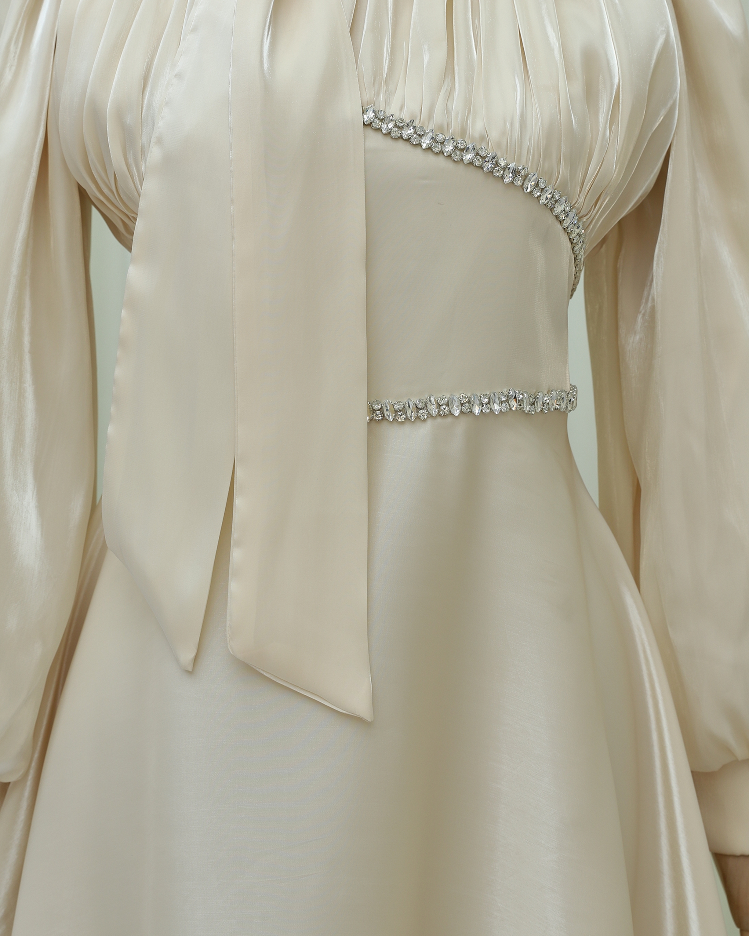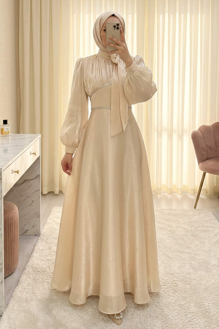 Podyumplus Yakası Fiyonklu Beli Taş Detaylı Balon Kol Abiye -Bej