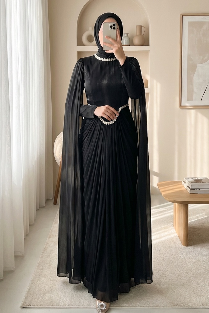 Abiyenin rahat ve akıcı kalıbı, vücudu sıkmadan şık bir form oluşturur; davet, nişan, söz, mezuniyet ve özel organizasyonlarda göz kamaştıran bir görünüm sunar. Pelerin tasarımının sağladığı zarif hareket, fotoğraflarda etkileyici bir siluet yaratır. Janjan dokusu sayesinde tek başına bile iddialı bir görünüm elde edilir ve abiye, minimal aksesuarlarla dahi tam bir bütünlük sağlar.