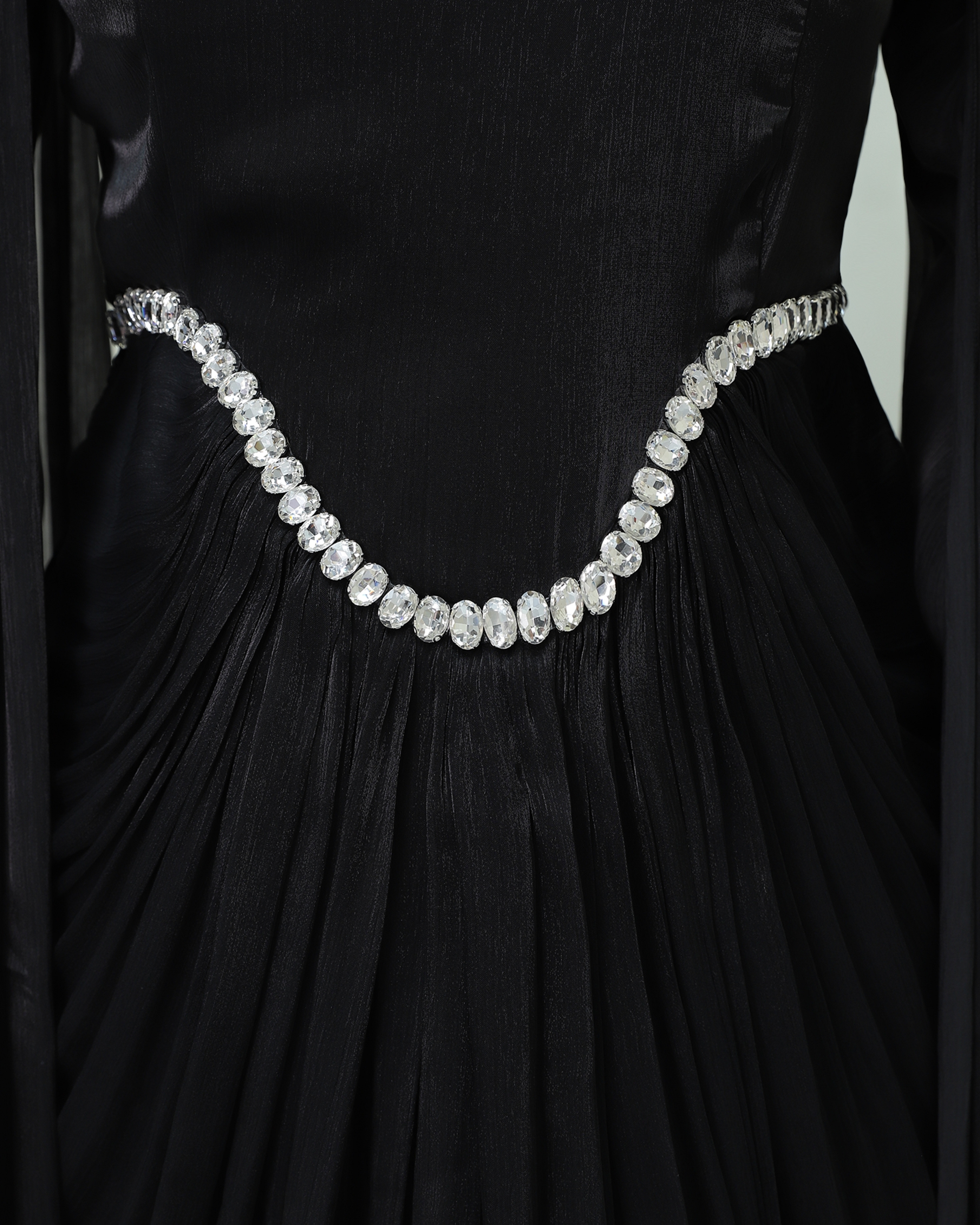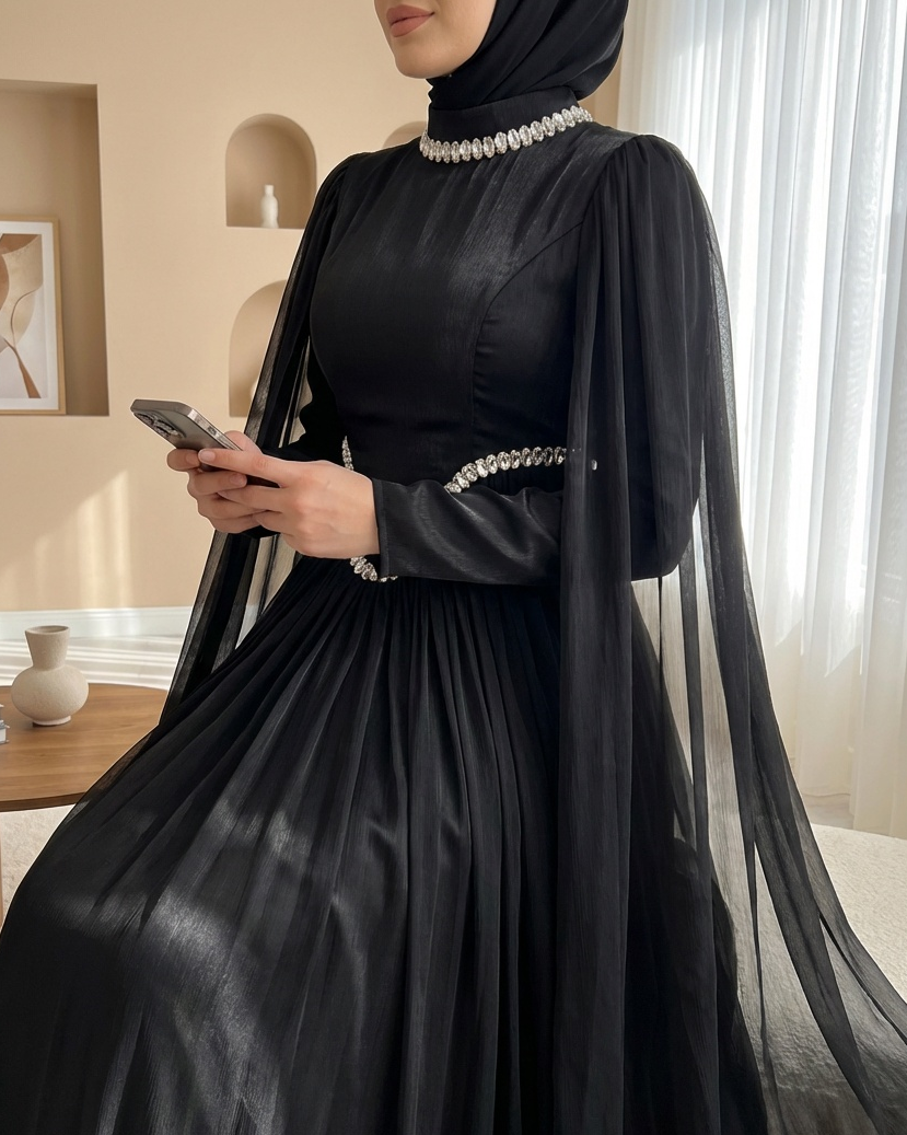 Podyumplus Yakası Ve Beli Taşlı Pelerin Detaylı Janjan Abiye -Siyah