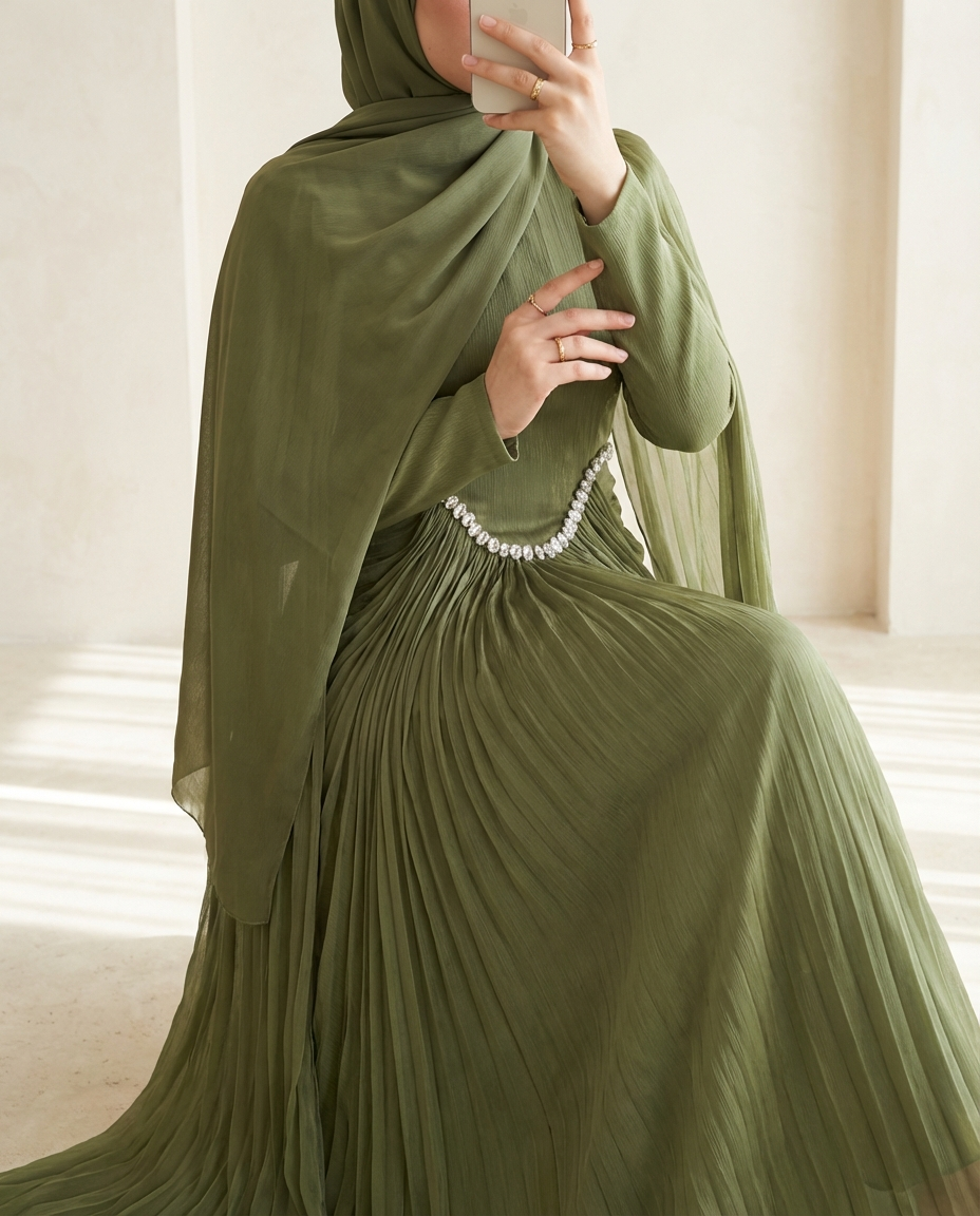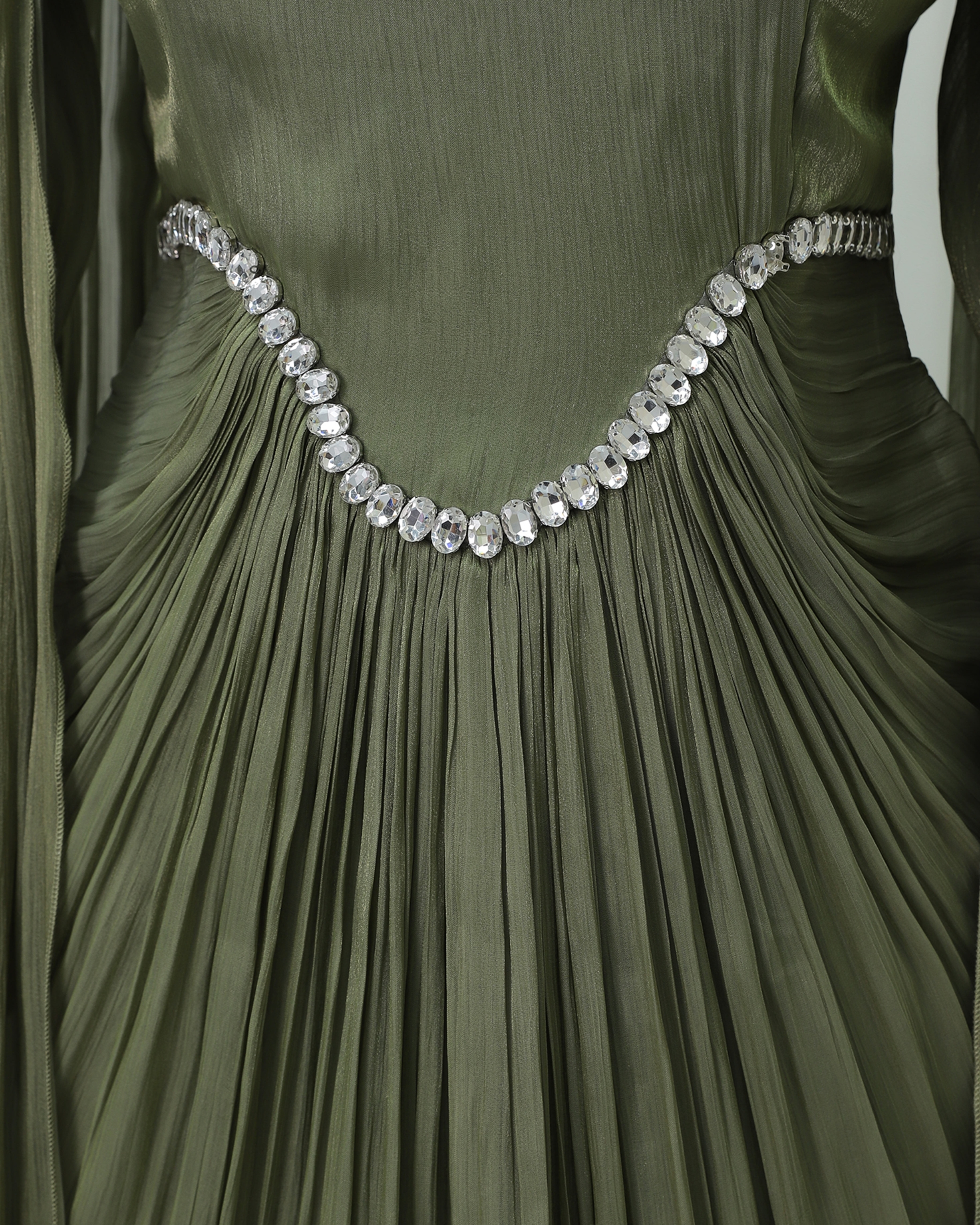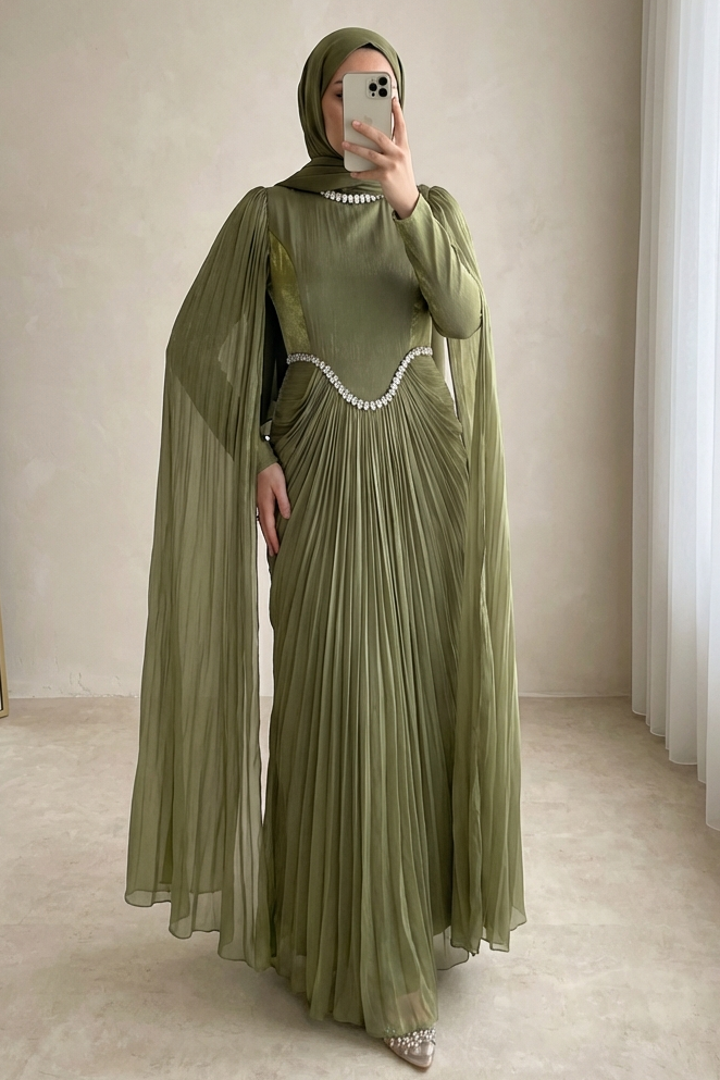 Podyumplus Yakası Ve Beli Taşlı Pelerin Detaylı Janjan Abiye -Haki
