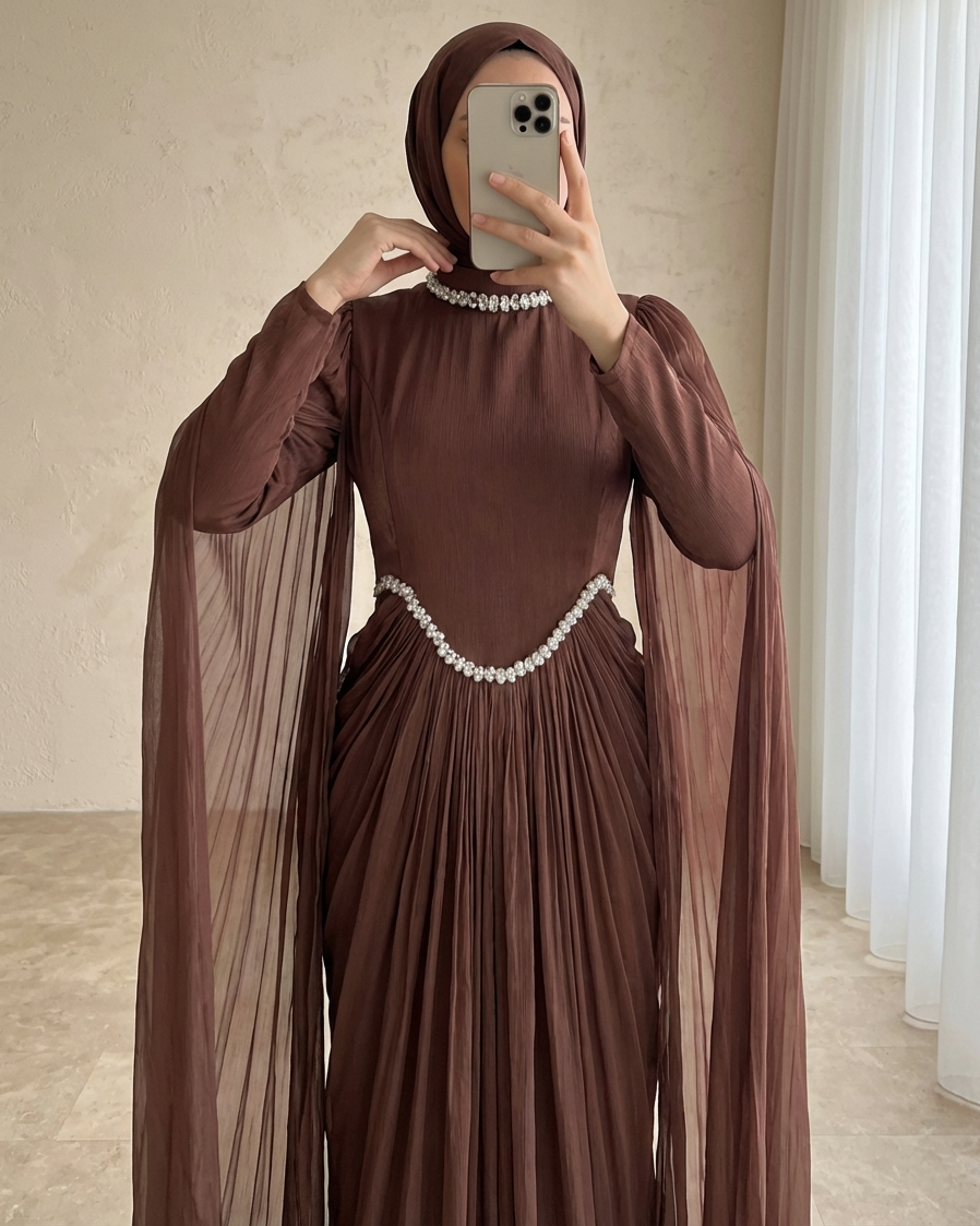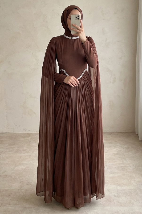 Abiyenin rahat ve akıcı kalıbı, vücudu sıkmadan şık bir form oluşturur; davet, nişan, söz, mezuniyet ve özel organizasyonlarda göz kamaştıran bir görünüm sunar. Pelerin tasarımının sağladığı zarif hareket, fotoğraflarda etkileyici bir siluet yaratır. Janjan dokusu sayesinde tek başına bile iddialı bir görünüm elde edilir ve abiye, minimal aksesuarlarla dahi tam bir bütünlük sağlar.