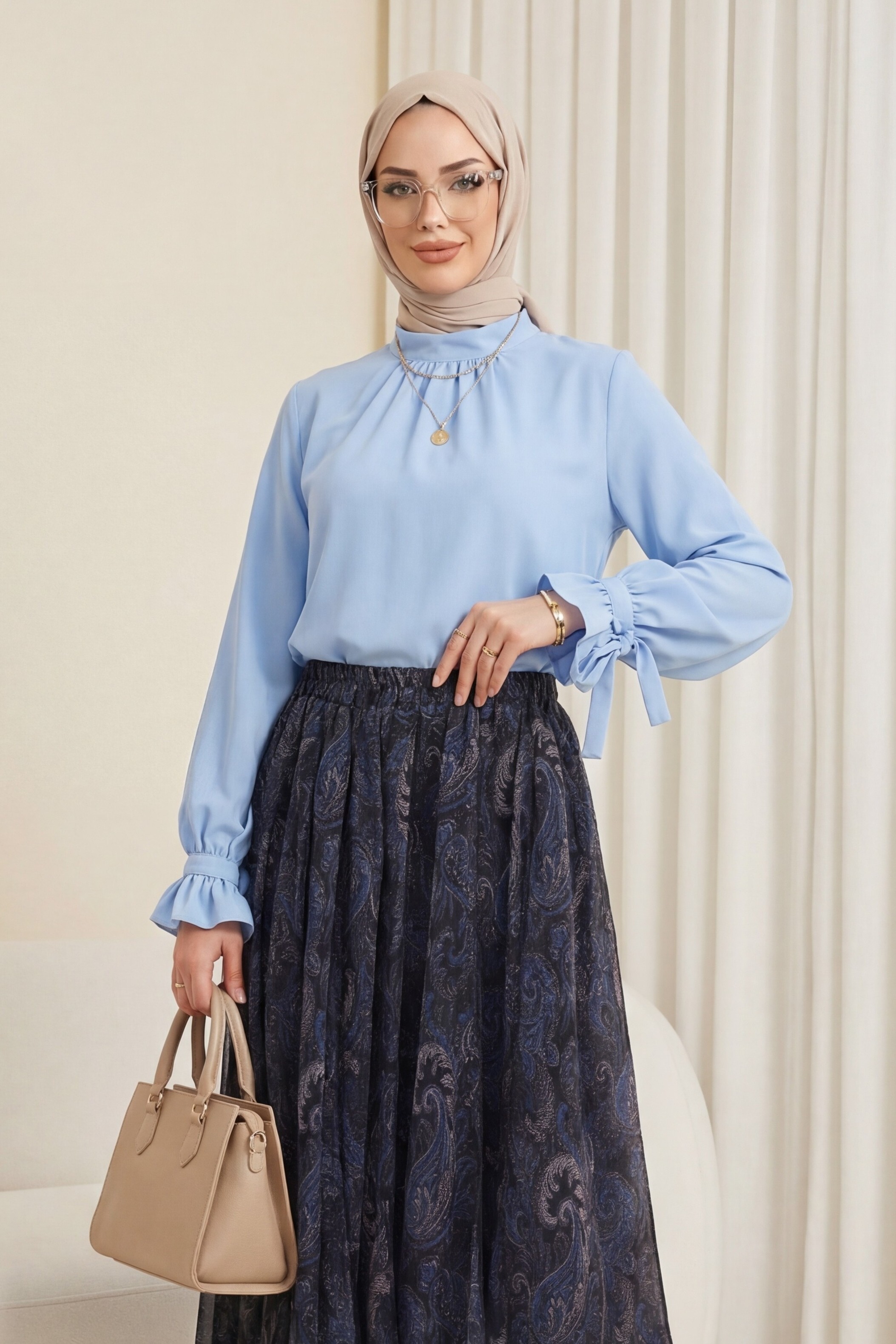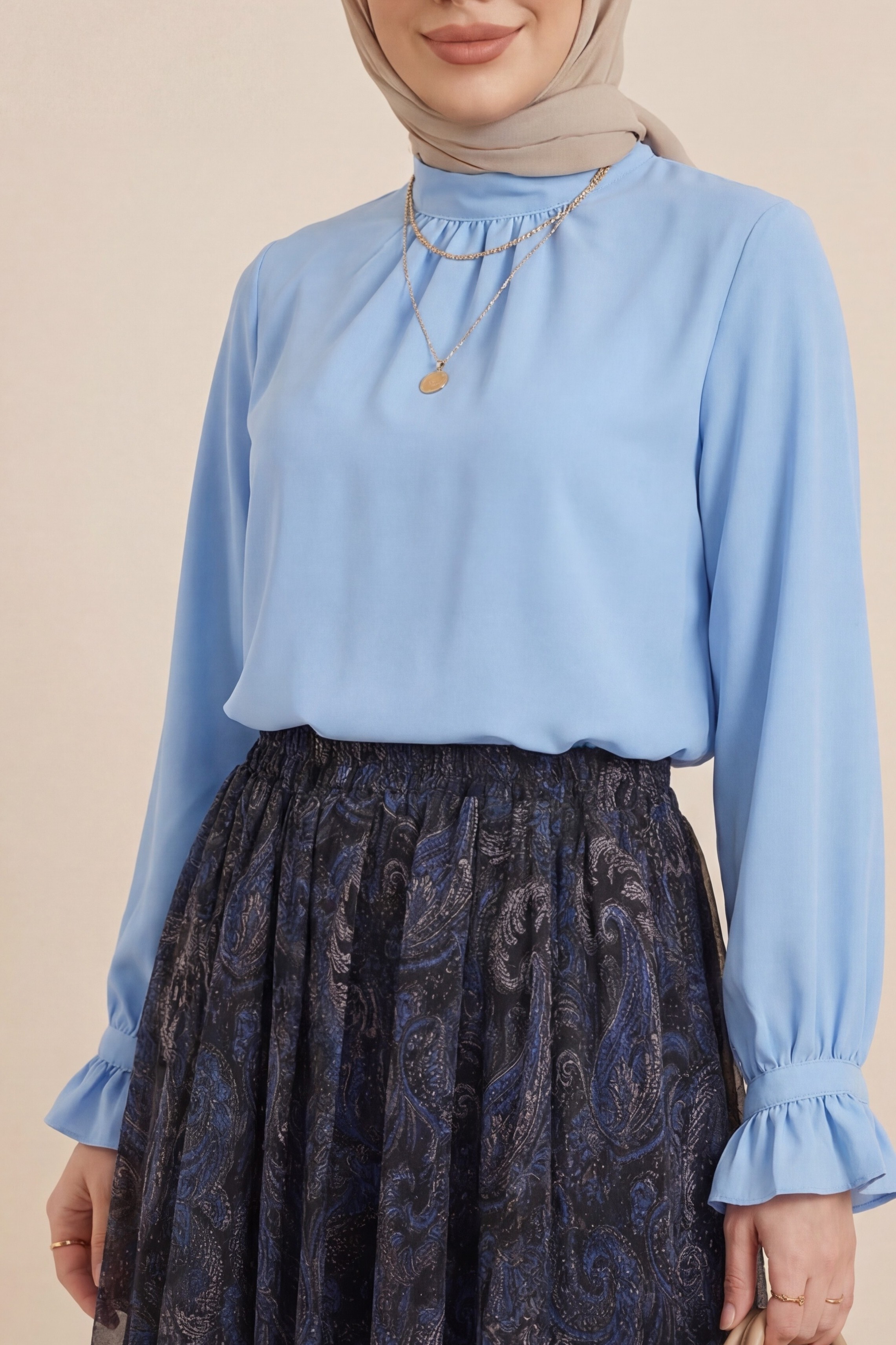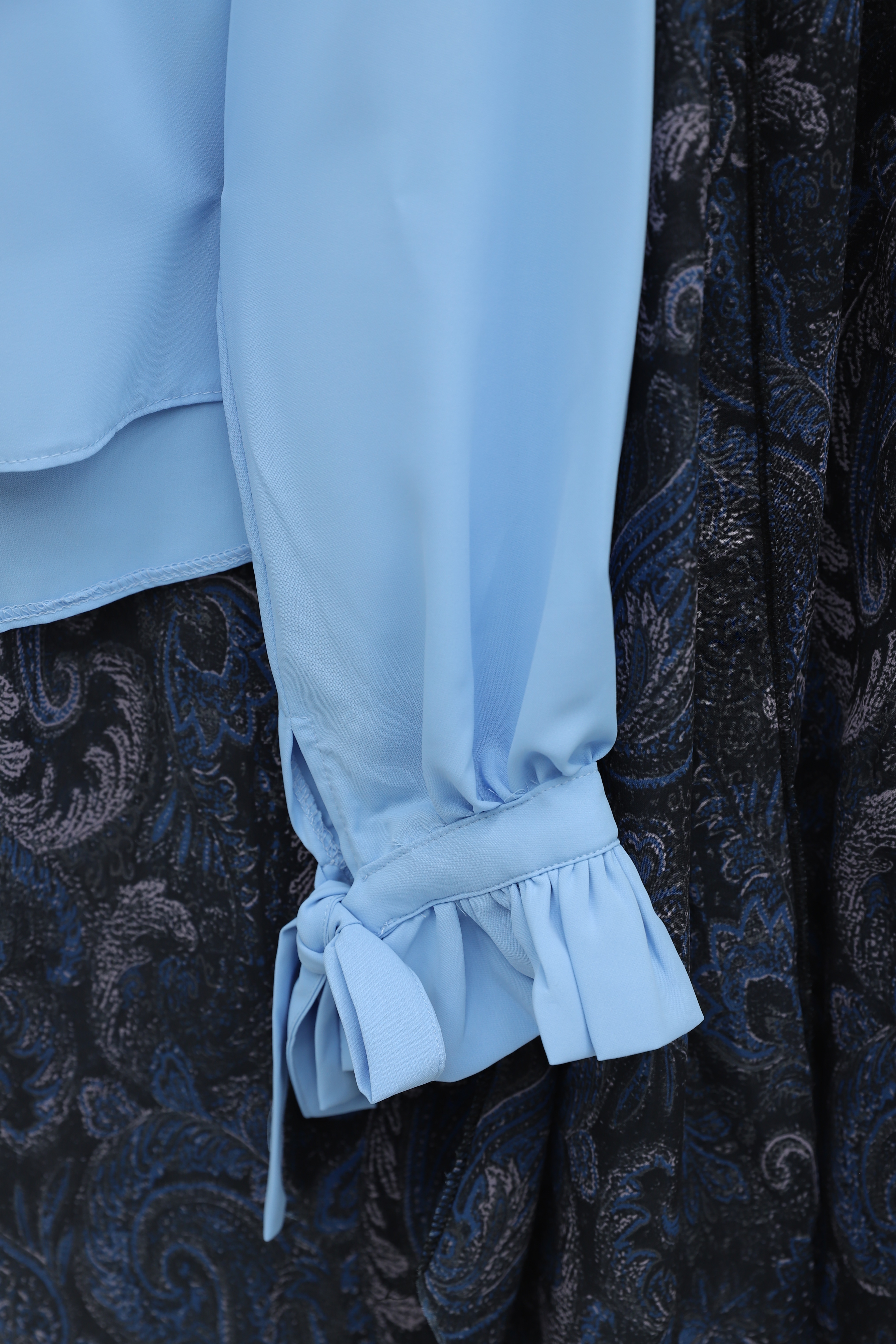 Podyumplus Dik Yaka Kolu Fırfırlı Bağcıklı Arkası Fermuarlı İthal Krep Bluz -Bebe Mavi