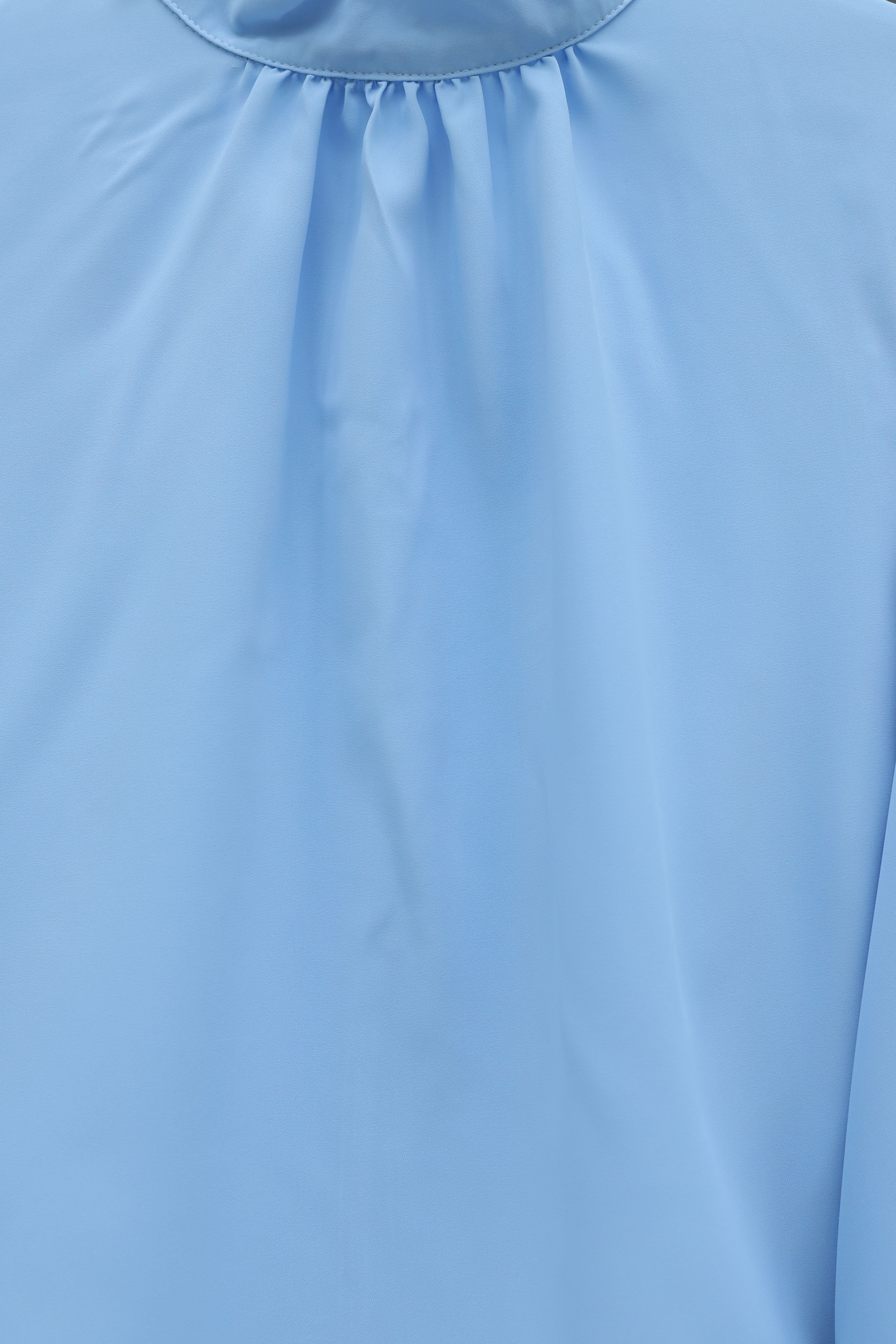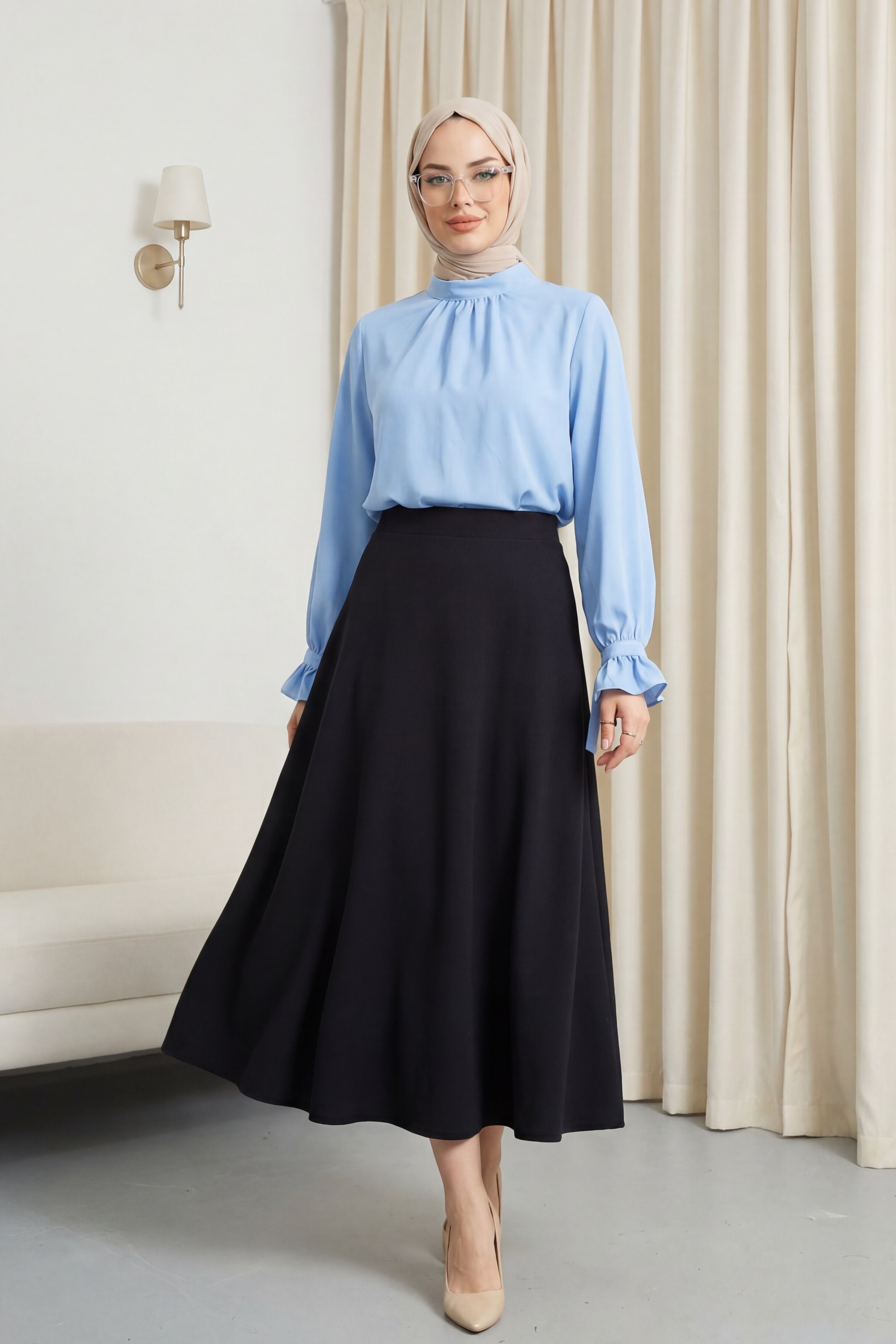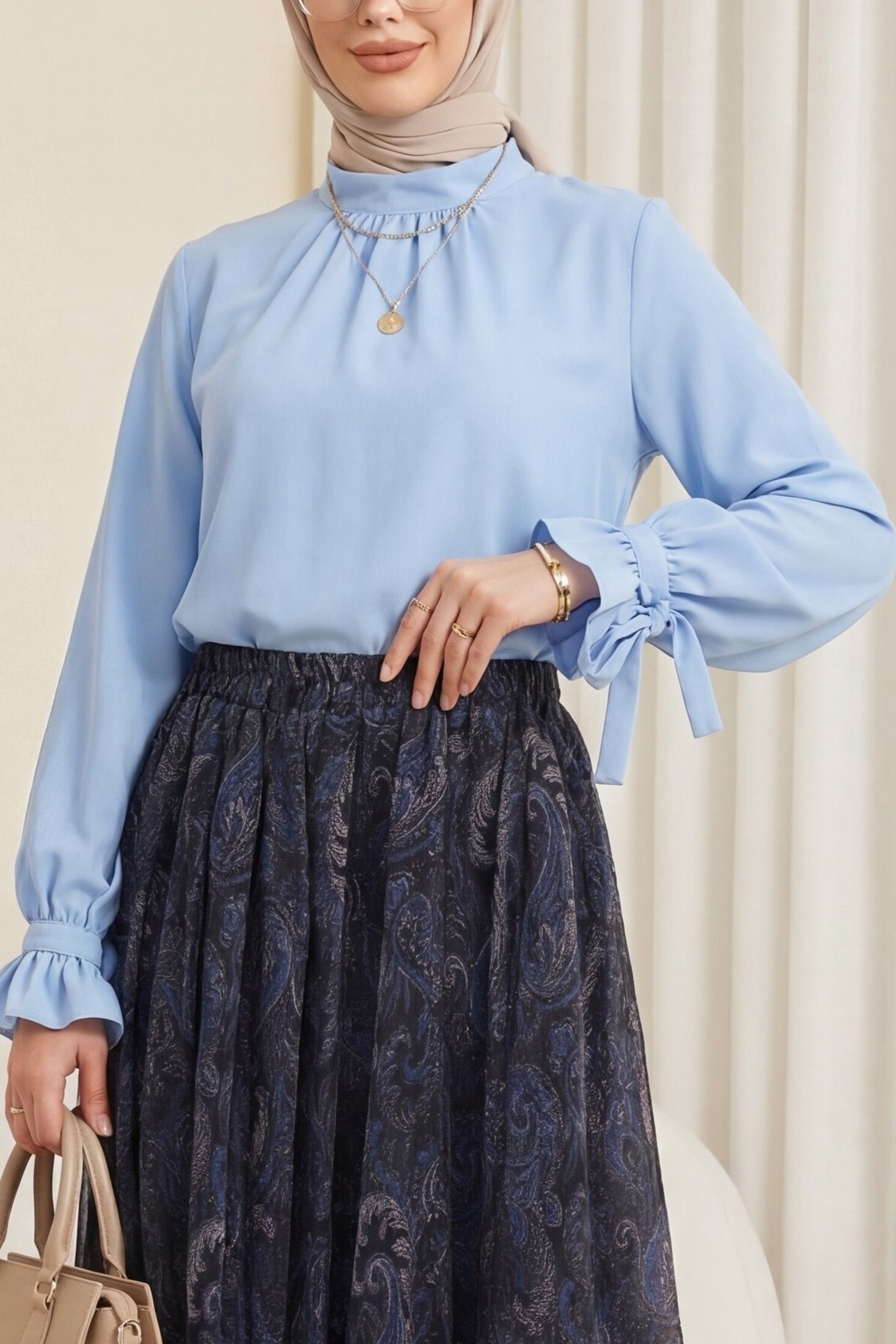 Podyumplus Dik Yaka Kolu Fırfırlı Bağcıklı Arkası Fermuarlı İthal Krep Bluz -Bebe Mavi