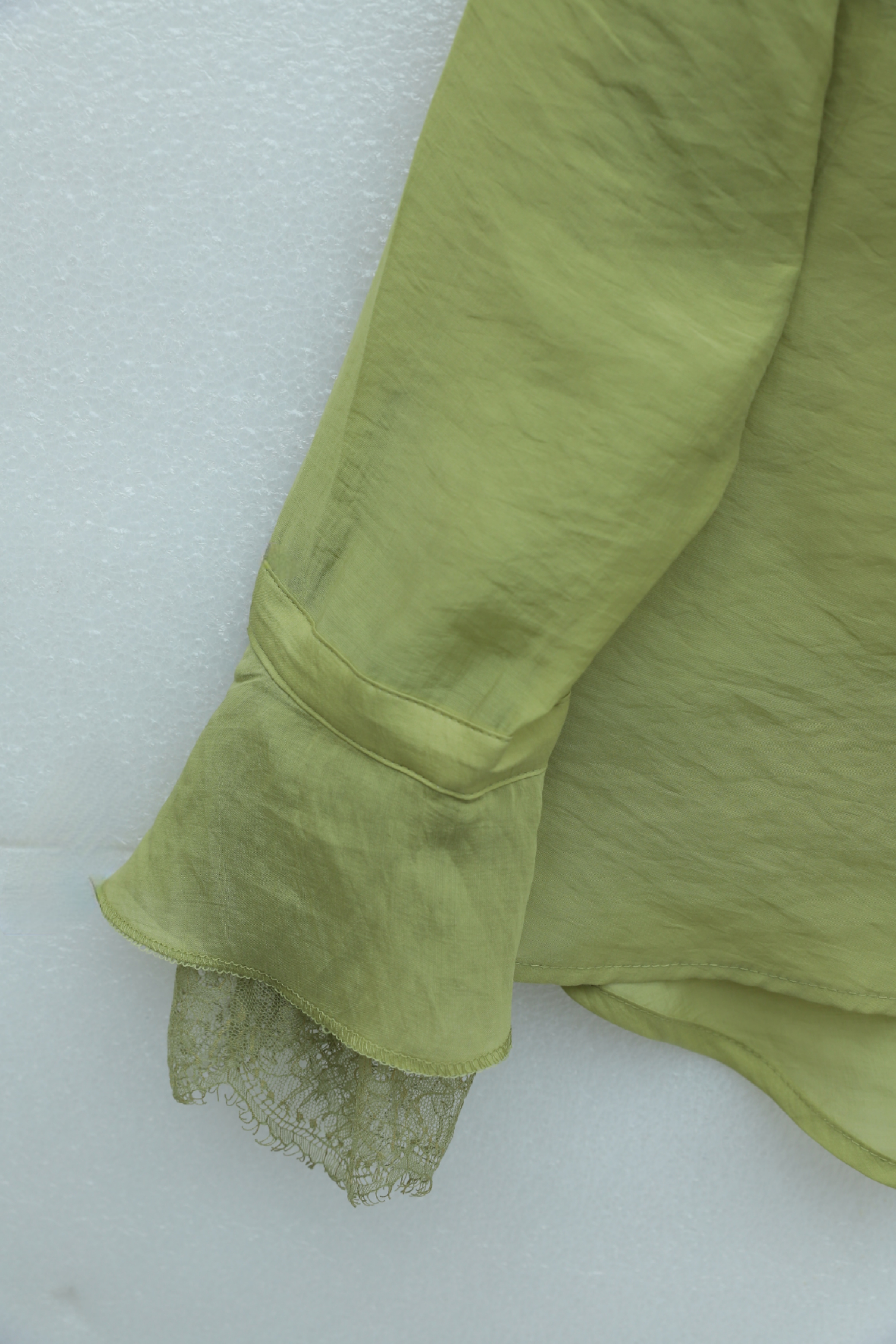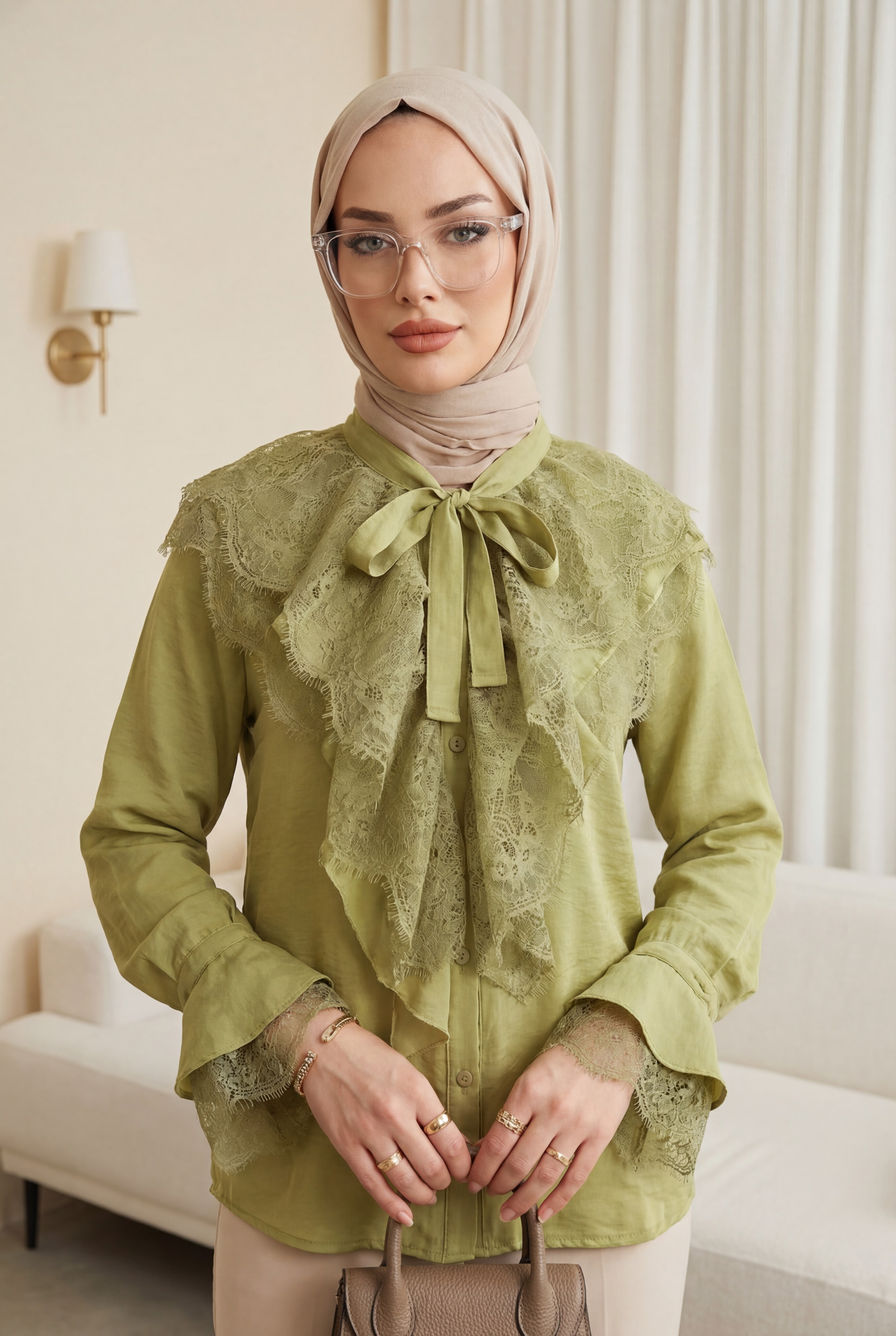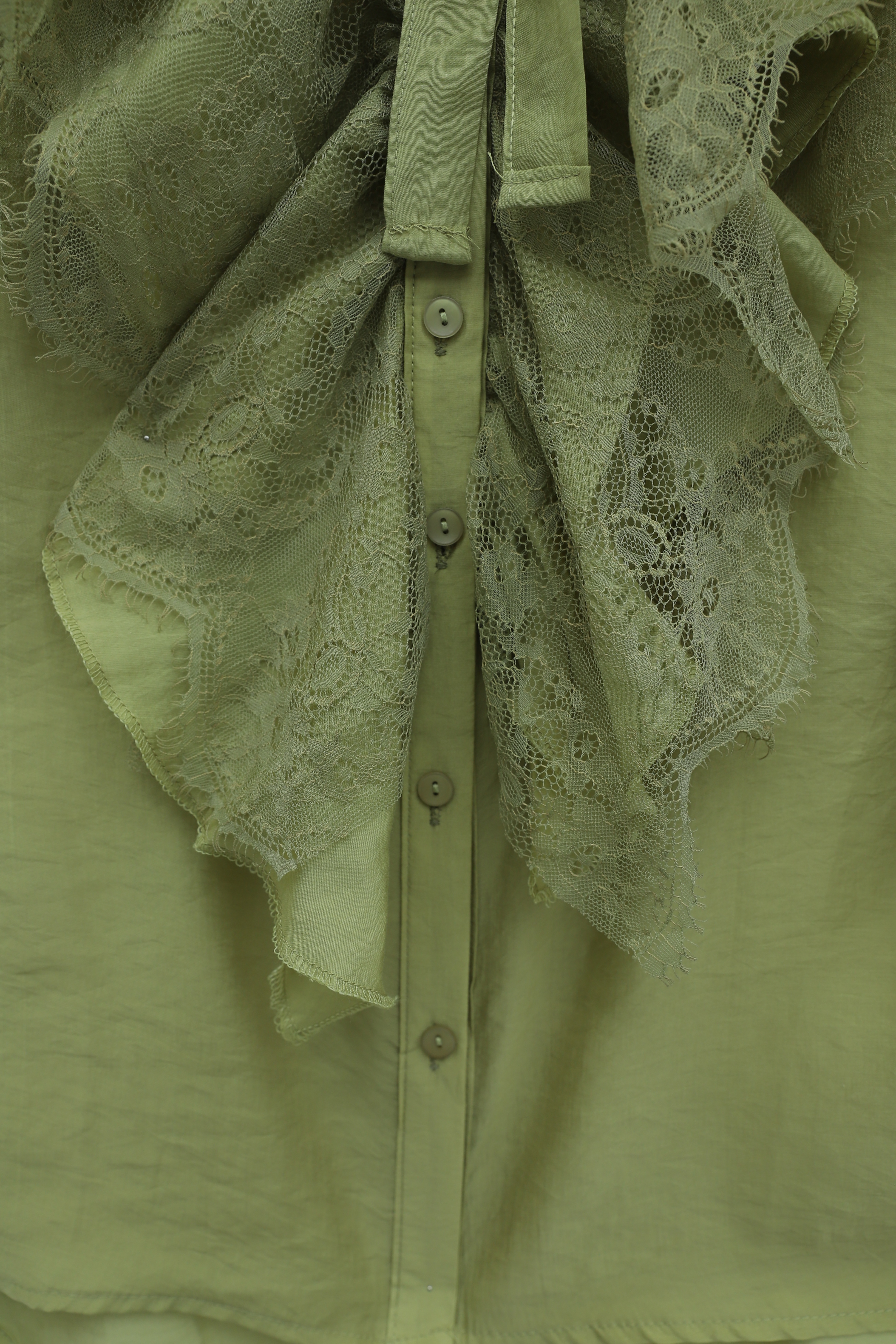 Podyumplus Yakası Bağcıklı Fırfırlı Dantel Detaylı Arkası Uzun Cupra Gömlek -Yağ Yeşili