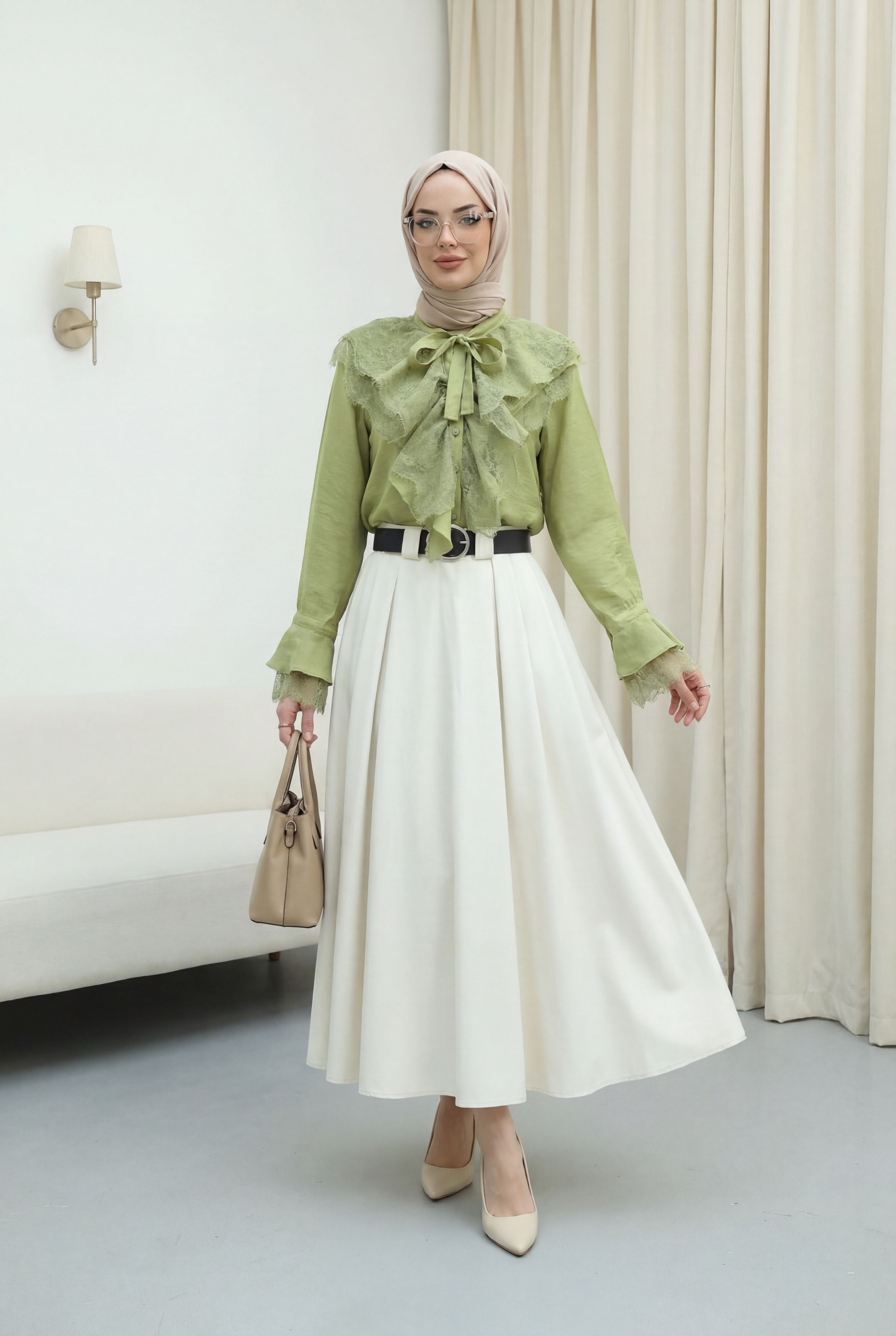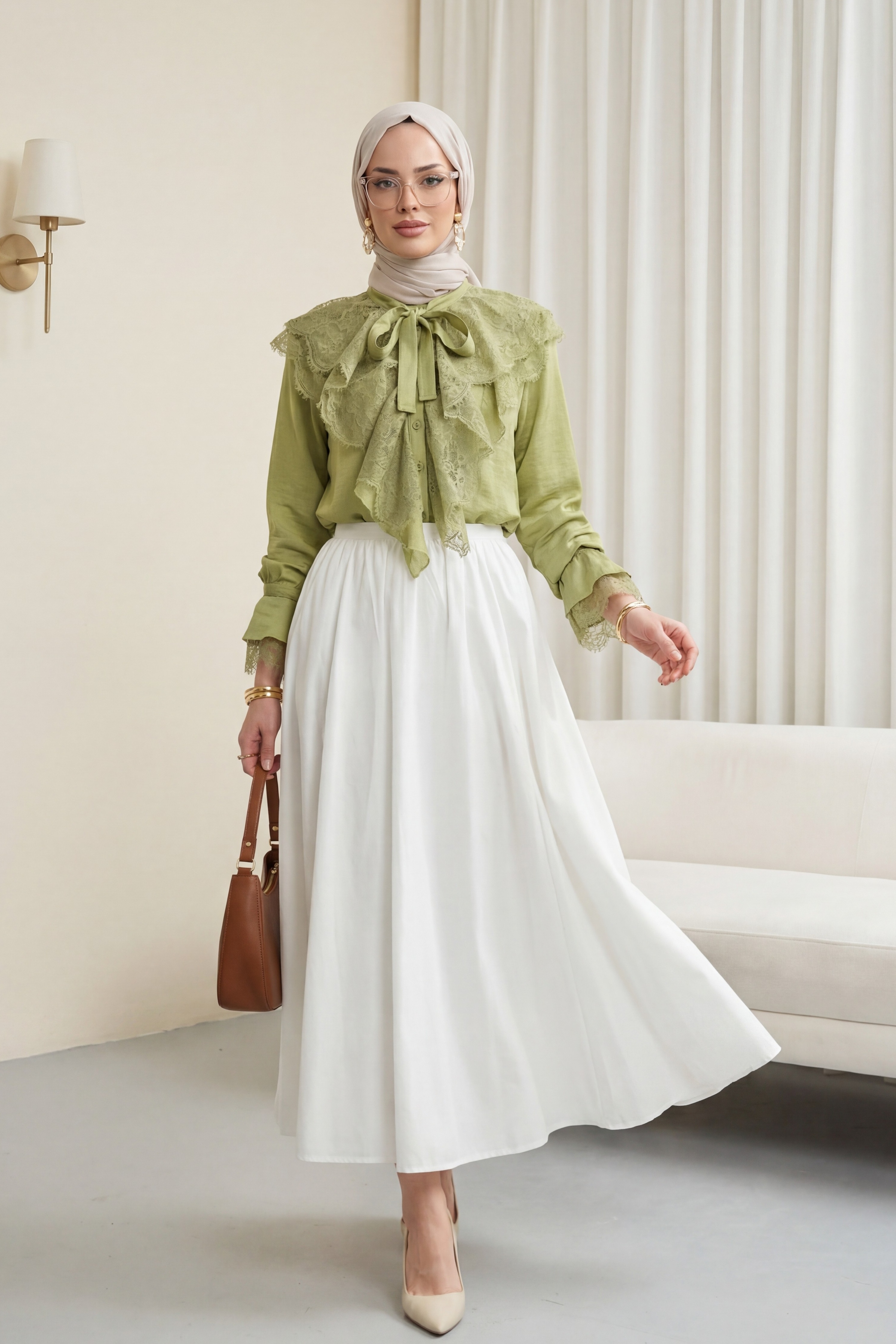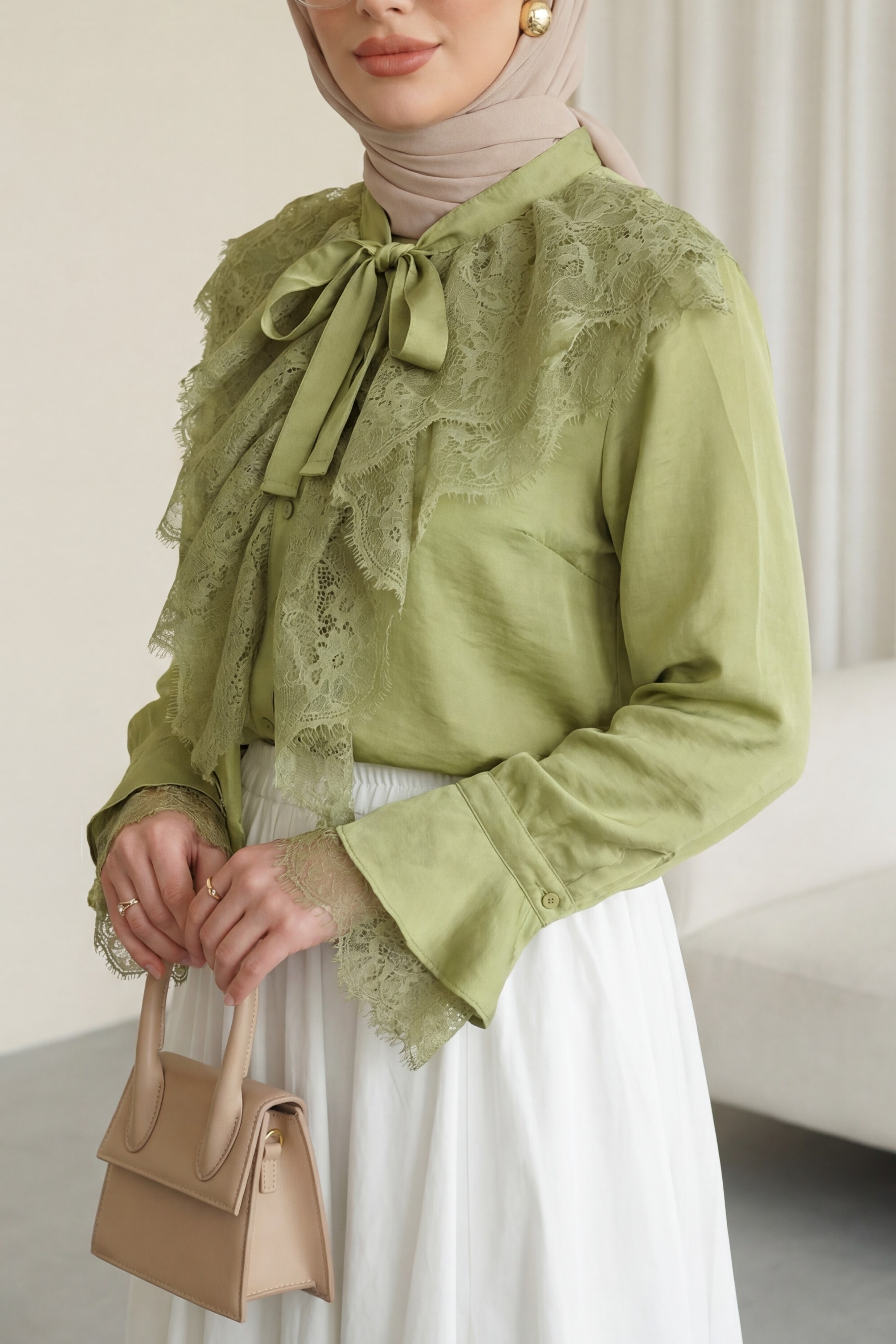 Podyumplus Yakası Bağcıklı Fırfırlı Dantel Detaylı Arkası Uzun Cupra Gömlek -Yağ Yeşili