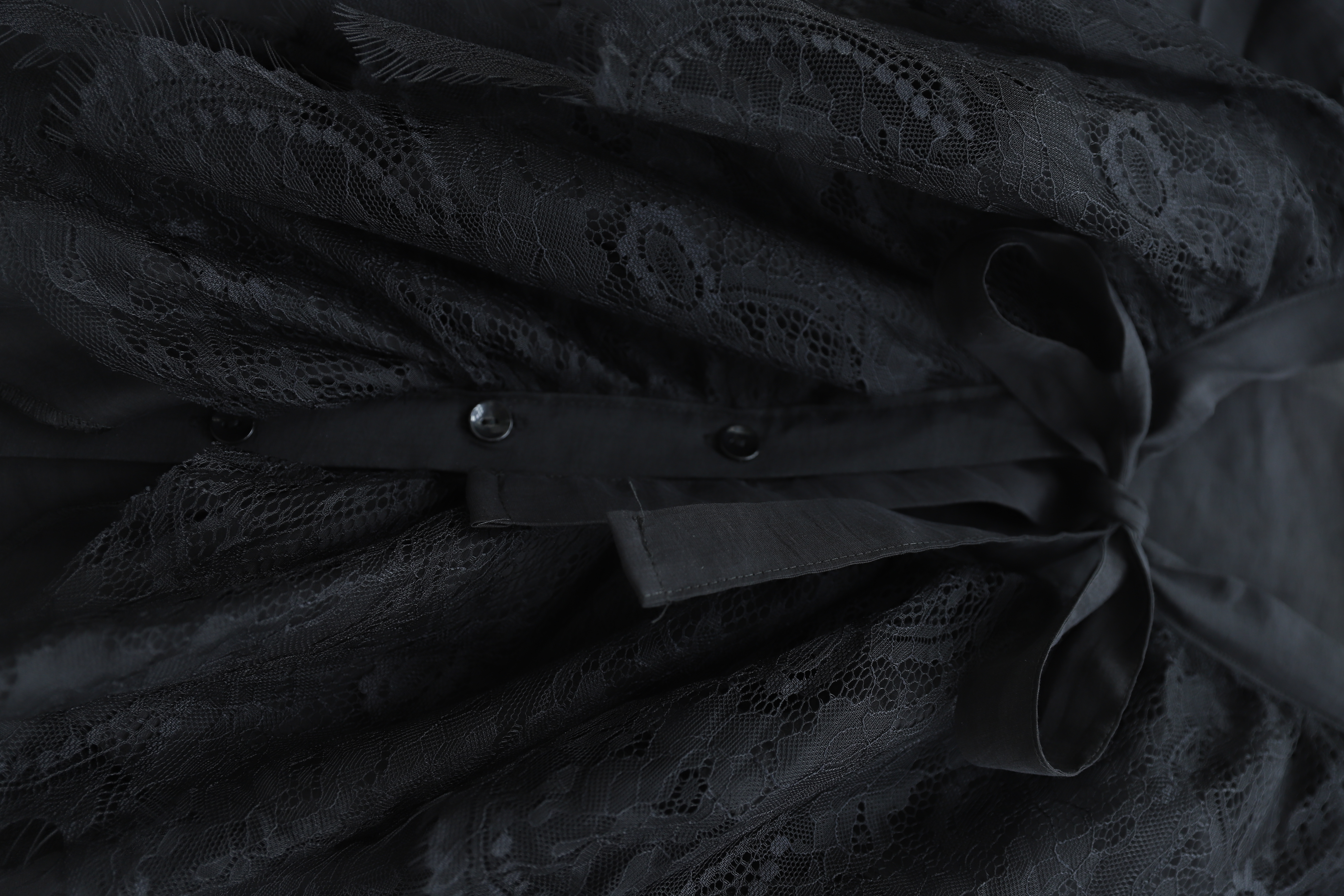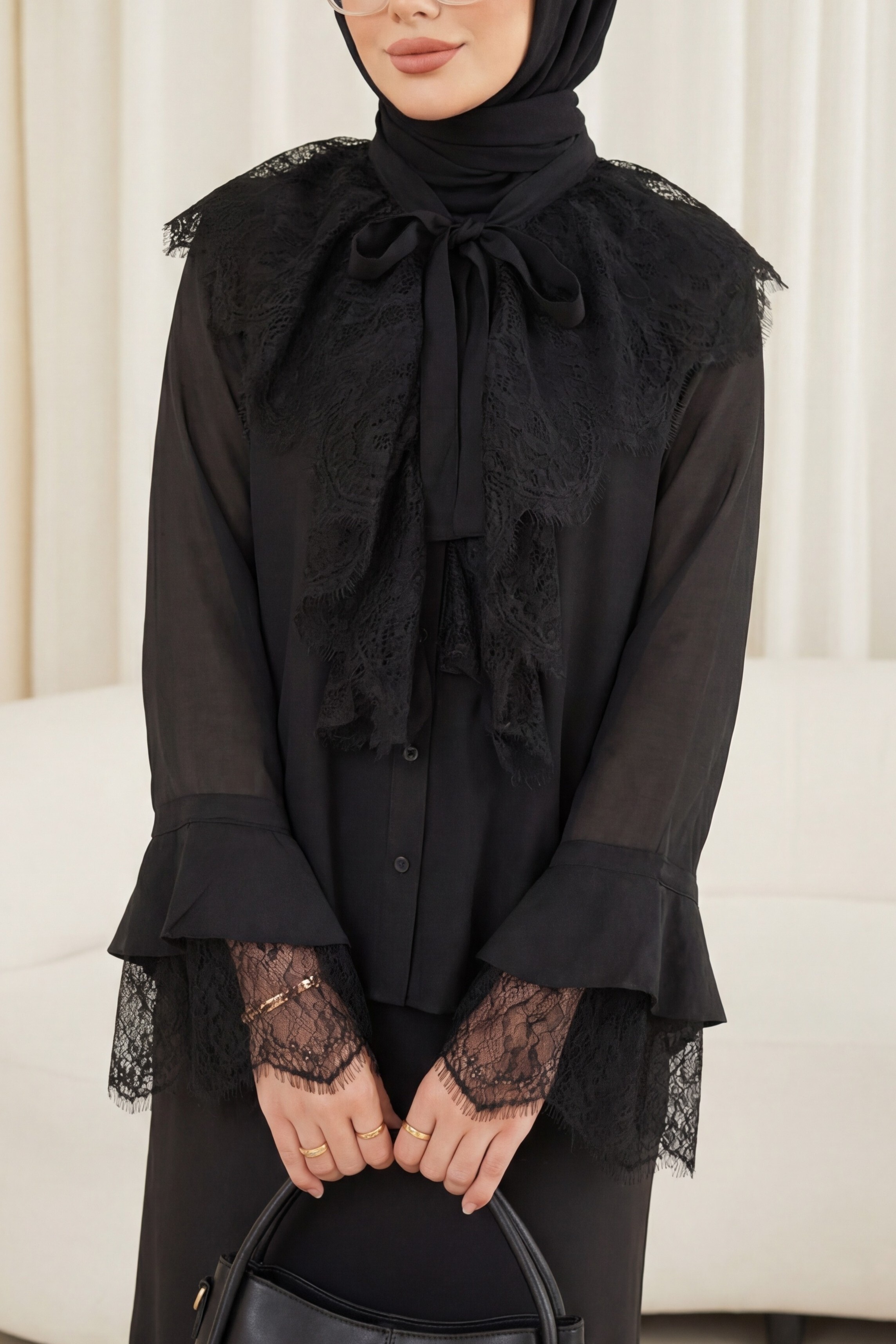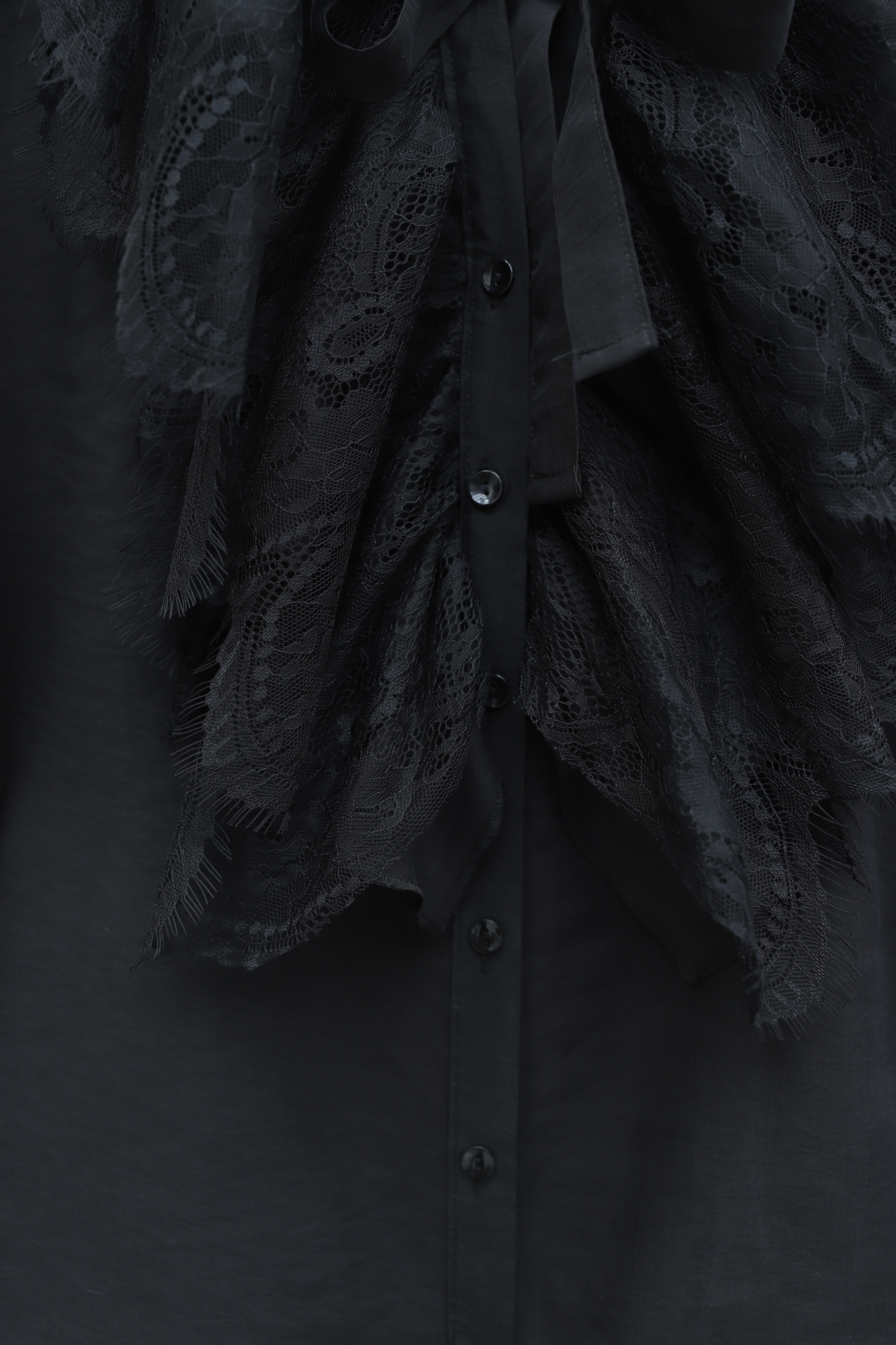 Podyumplus Yakası Bağcıklı Fırfırlı Dantel Detaylı Arkası Uzun Cupra Gömlek -Siyah