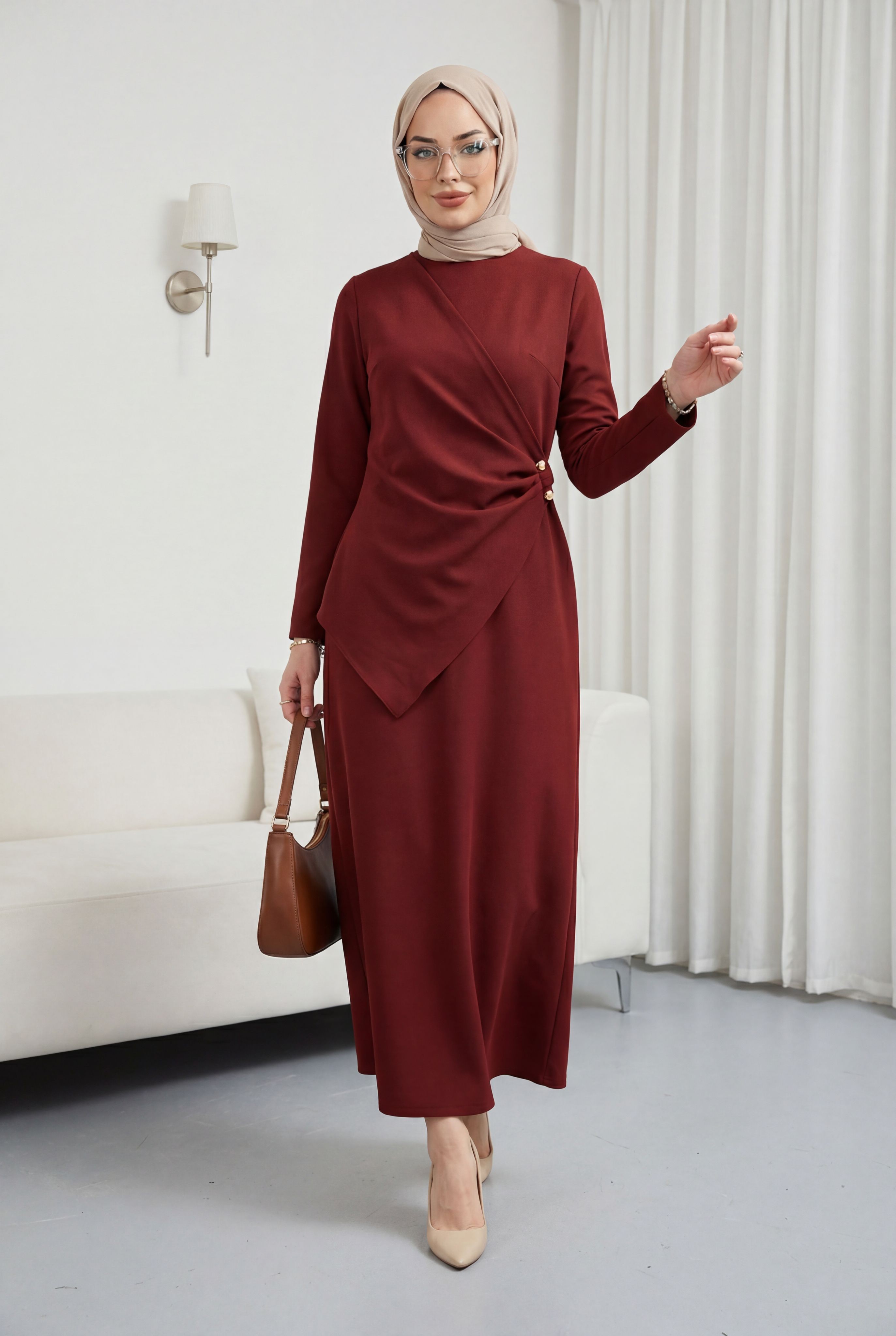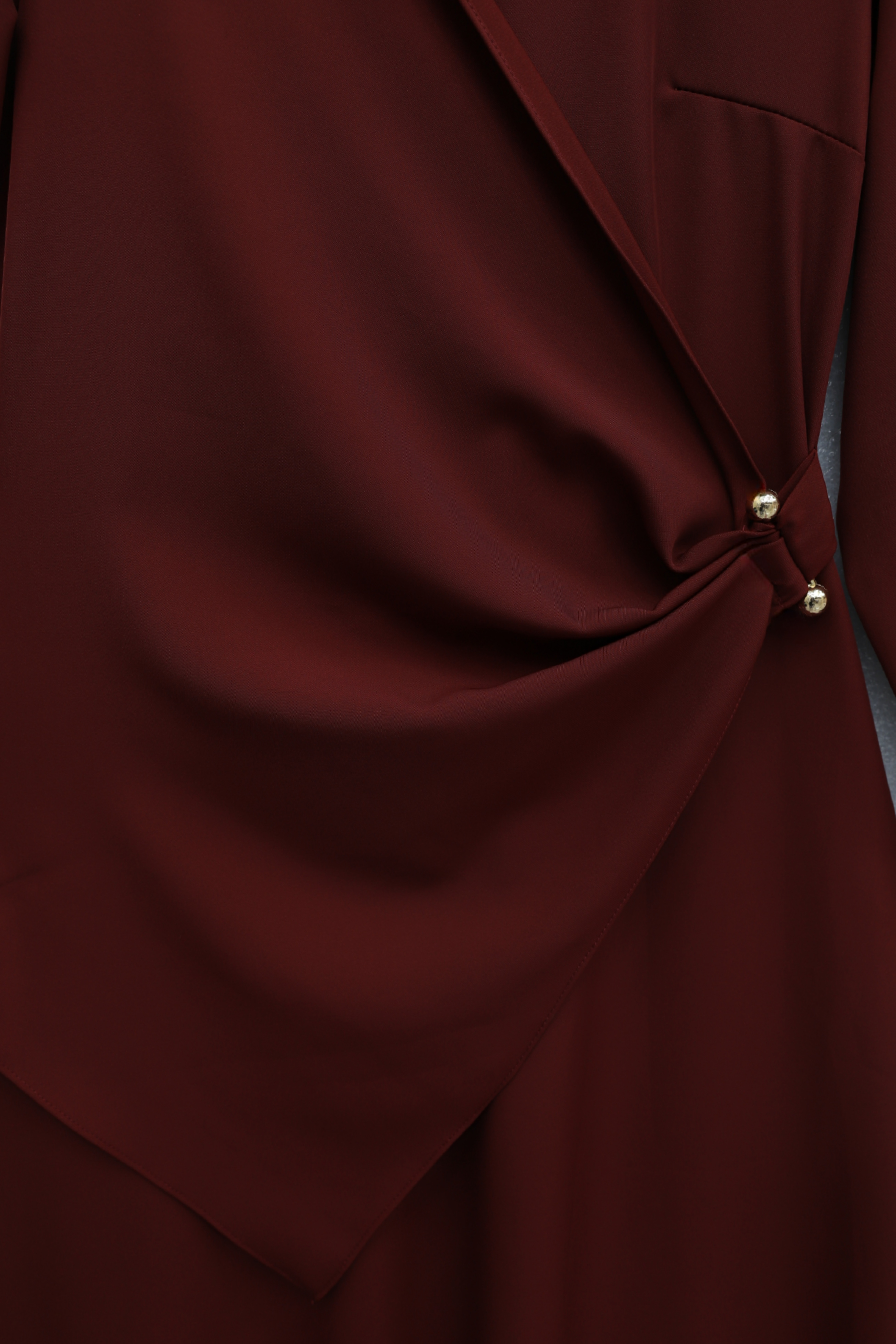 Podyumplus Çapraz Alerli Tokalı Yuvarlak Yaka İthal Krep Elbise -Bordo