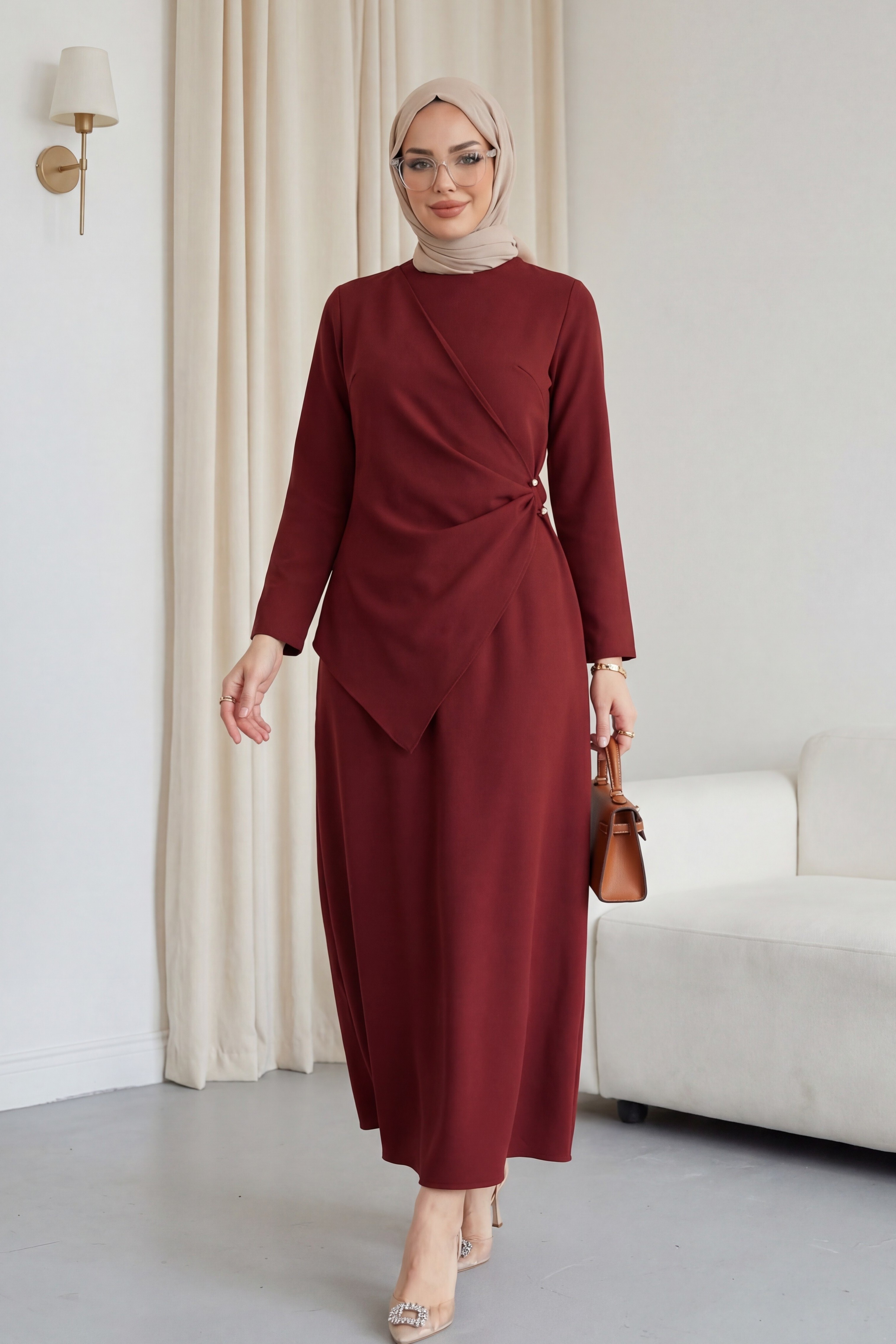 Kombindeki şal, çanta, ayakkabı ve takılar aksesuar olarak kullanılmıştır.